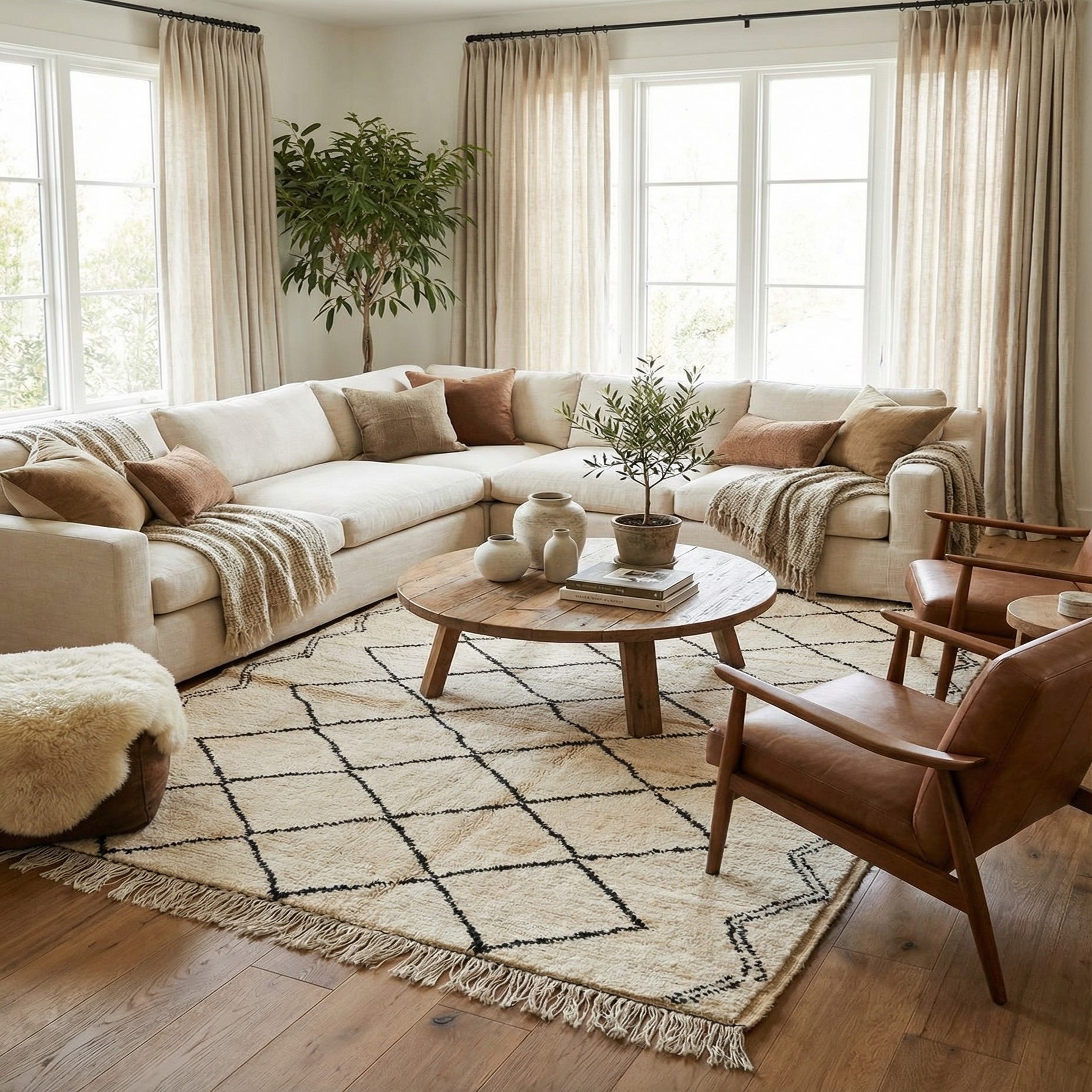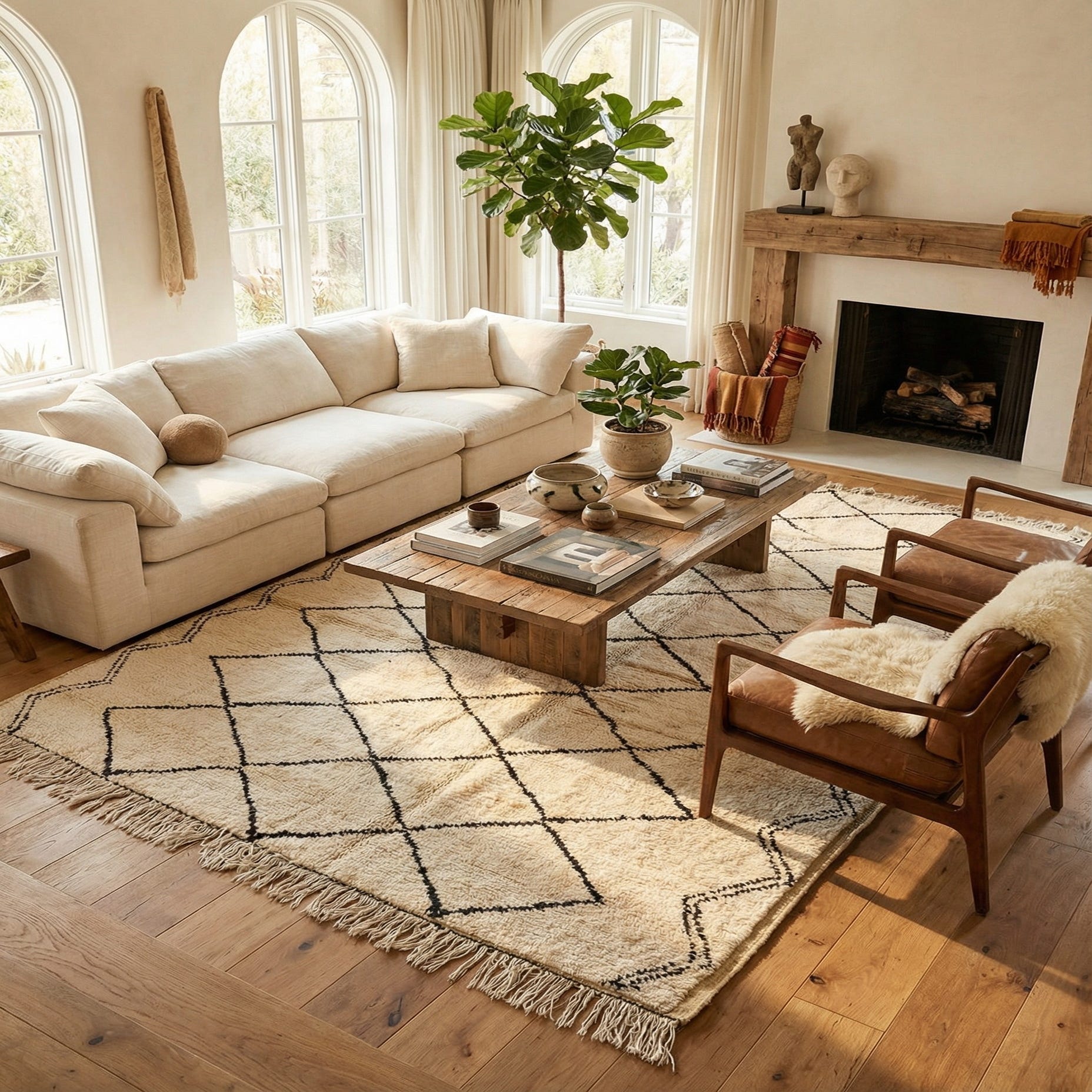 The clean geometry and two-tone palette fit a range of interiors — from modern and Scandinavian to relaxed bohemian or farmhouse. Place it to anchor a living area beneath a sofa and coffee table, layer it in a bedroom at the foot of the bed for added warmth, or use it in a home office to introduce texture without overwhelming the room. The straightforward pattern and natural wool texture make it an easy piece to pair with natural woods, metal accents, and soft linens.