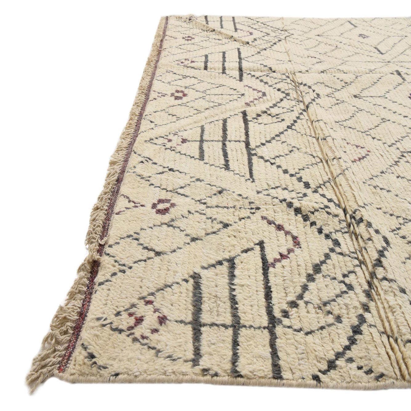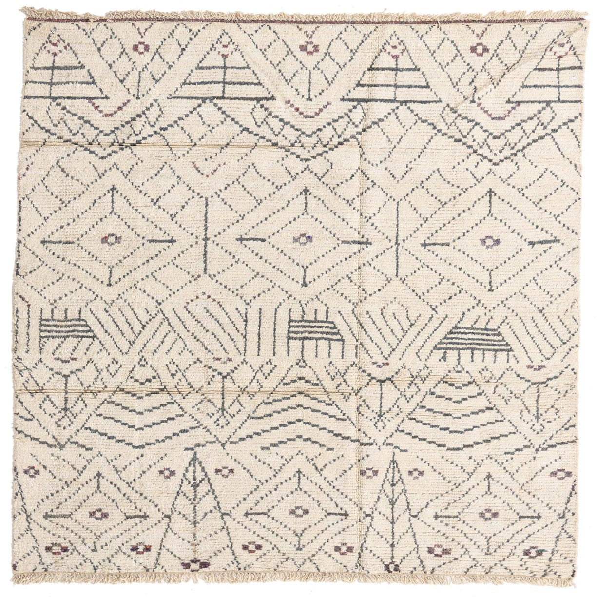 A 6x9 rectangular ivory wool shag rug with a modern tribal pattern in charcoal and subtle maroon accents.