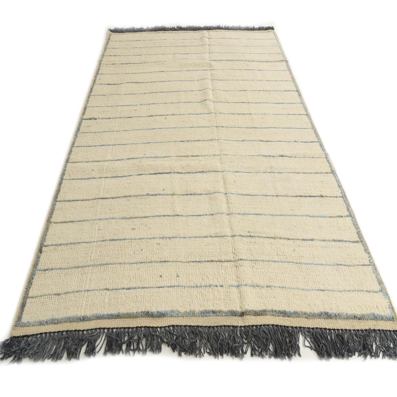 A 6x9 rectangular ivory shag rug with thin horizontal blue and gray stripes, featuring dark gray fringe.