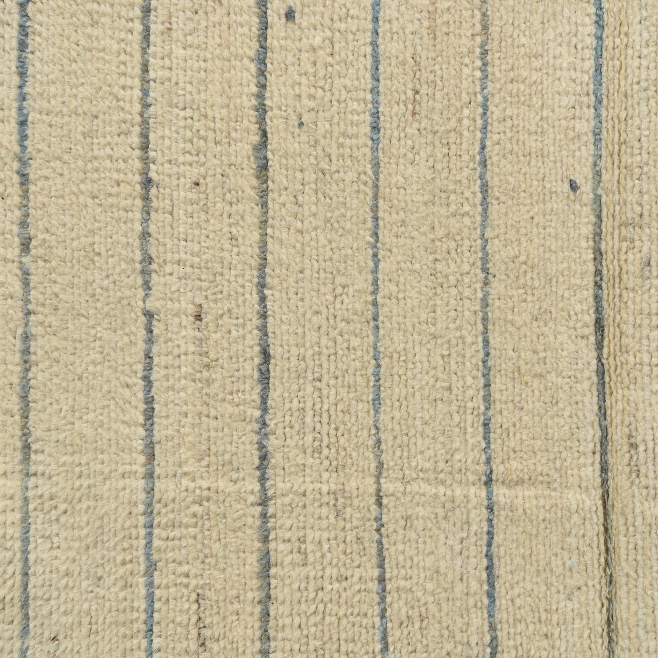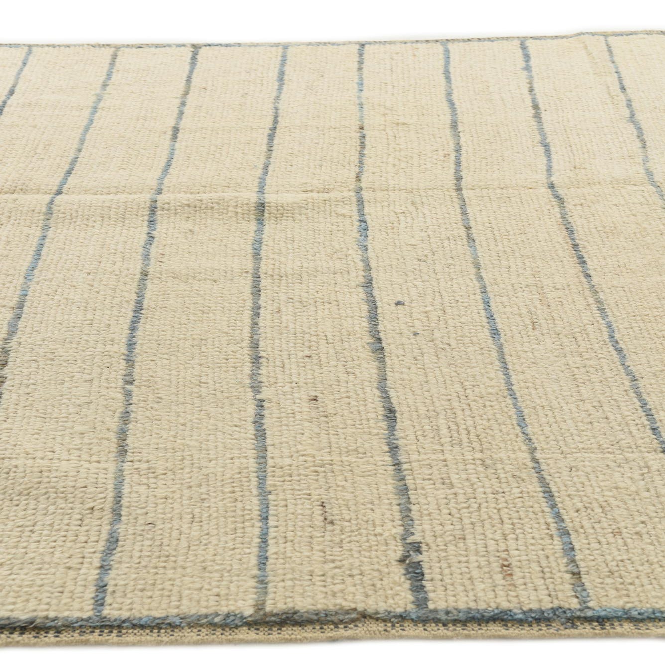 Hand-knotted from 100% wool, this rug presents a calm, linear design on an ivory ground threaded with thin light-blue stripes. The lines are intentionally irregular, giving the surface a handcrafted character, and the natural wool shows soft flecking that adds visual depth. The pile has a nubby, low-to-medium loft that feels warm and slightly springy underfoot, and short tonal fringe on the ends completes the look.