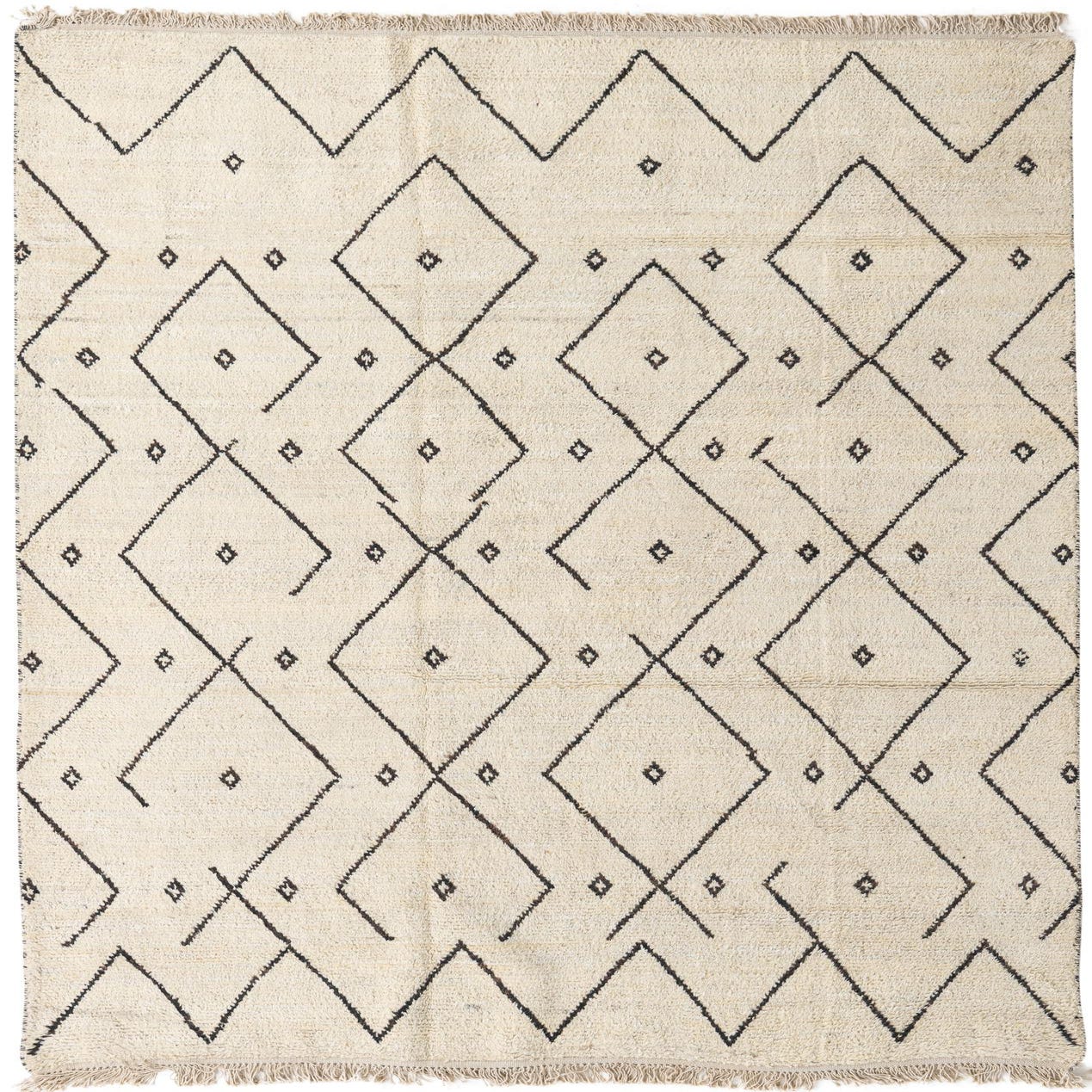 A 6x9 rectangular ivory shag rug with a modern tribal diamond and zigzag pattern in black, suitable for a living room.
