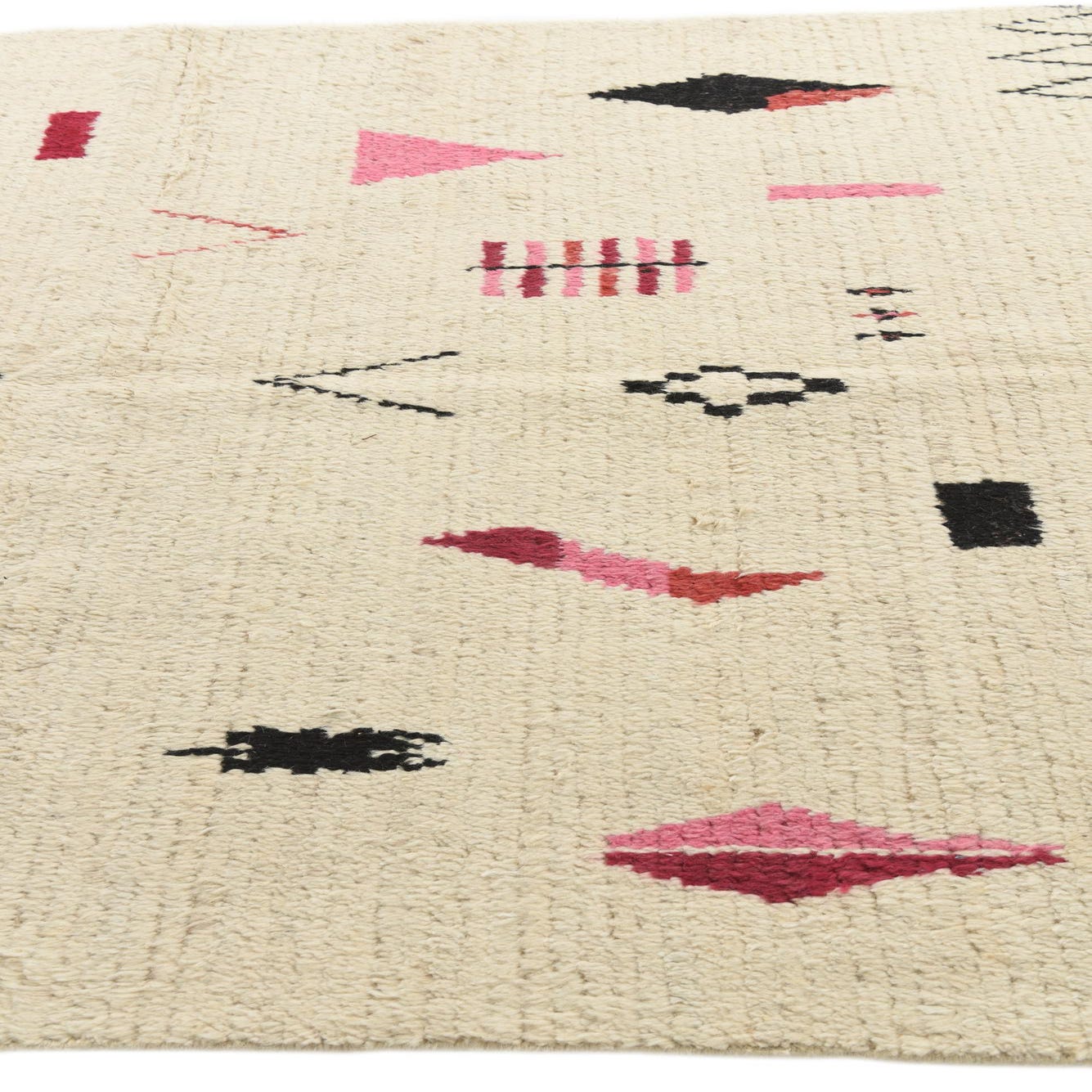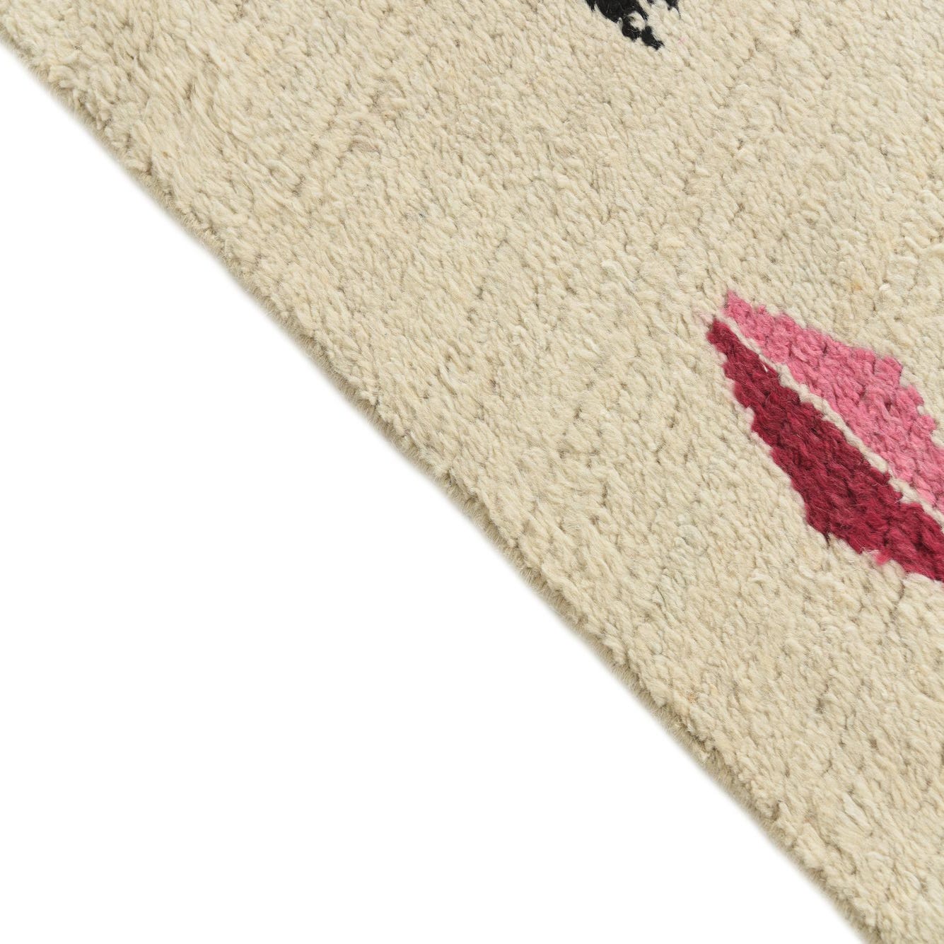 Primary color is Ivory. Colors in this rug include: Ivory, Black, Pink, Red.