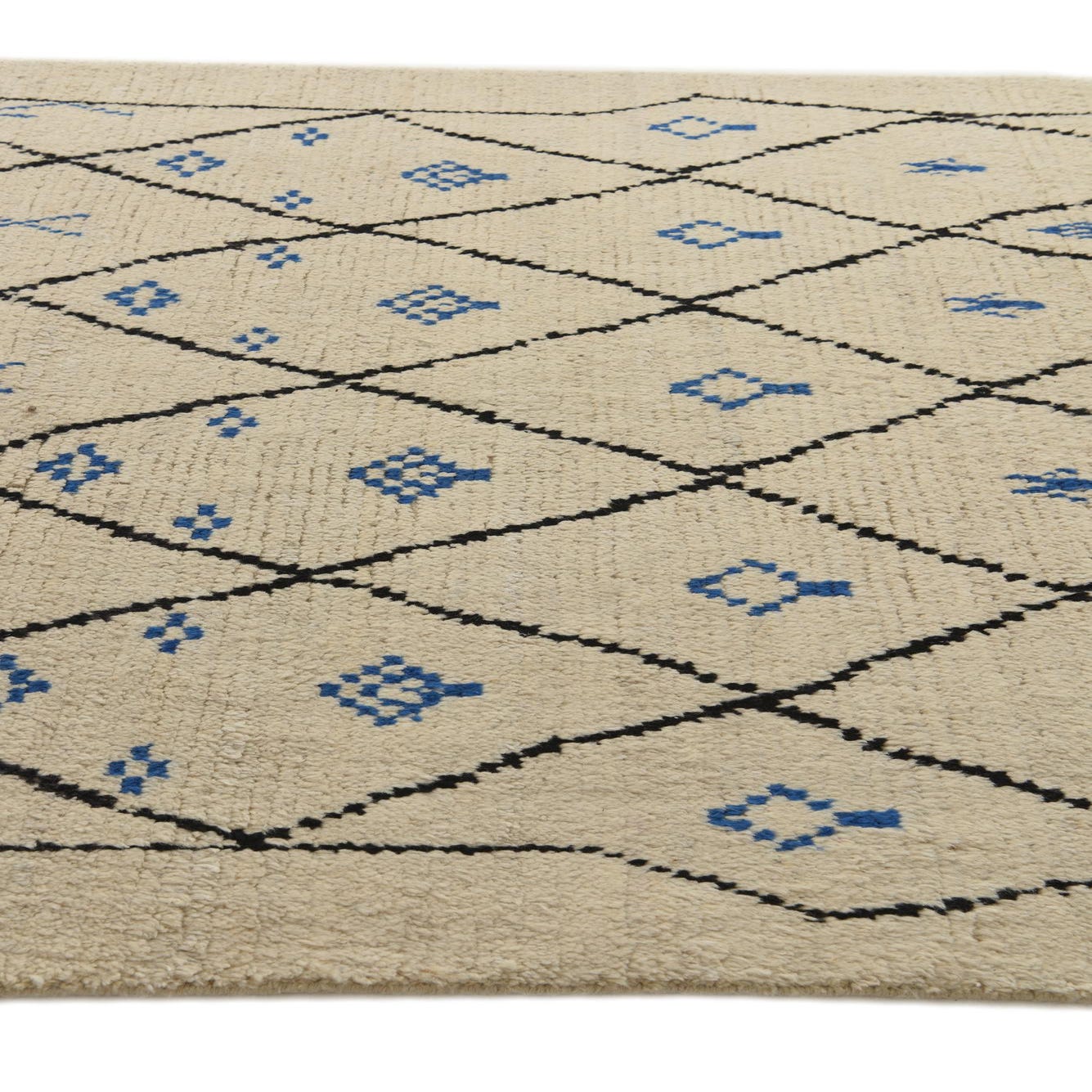 A 6x9 rectangular ivory shag rug with a bold black diamond trellis pattern and blue tribal accents.