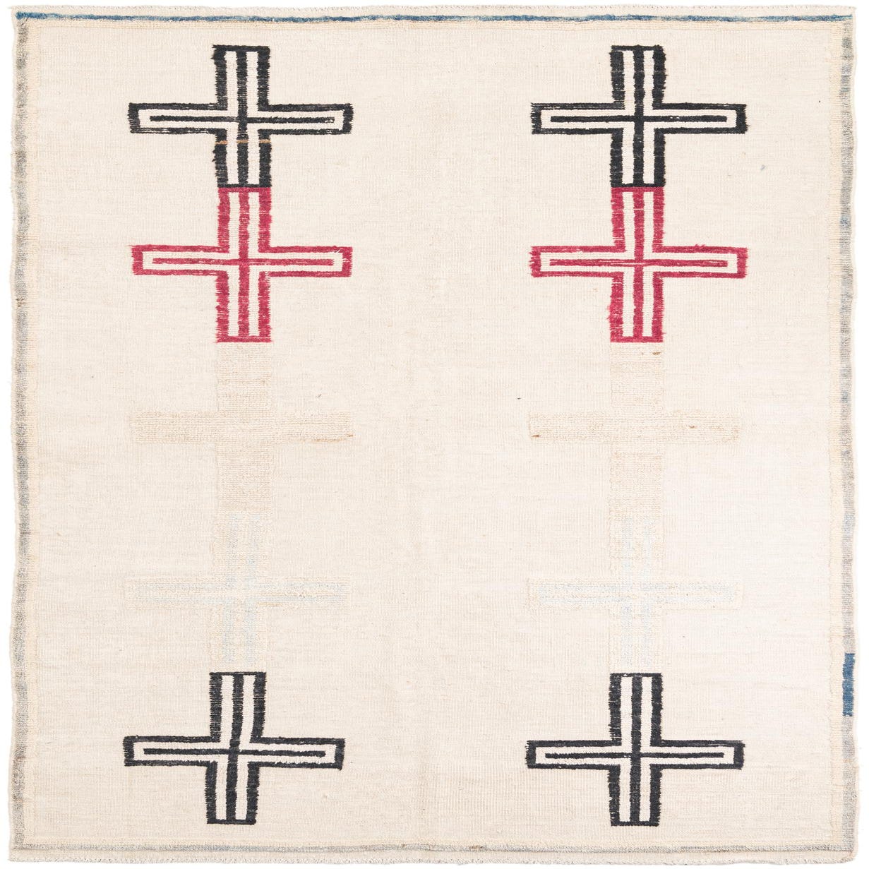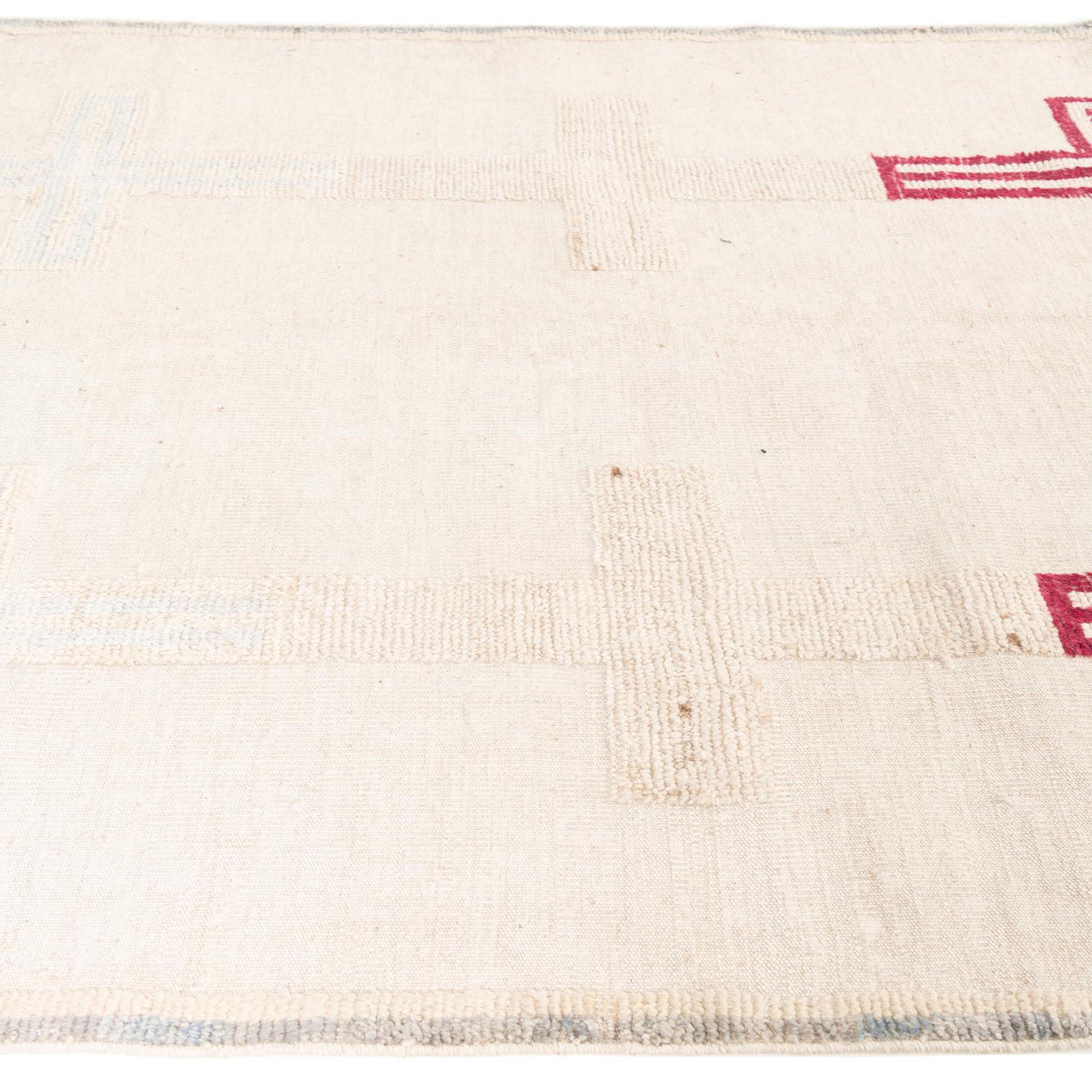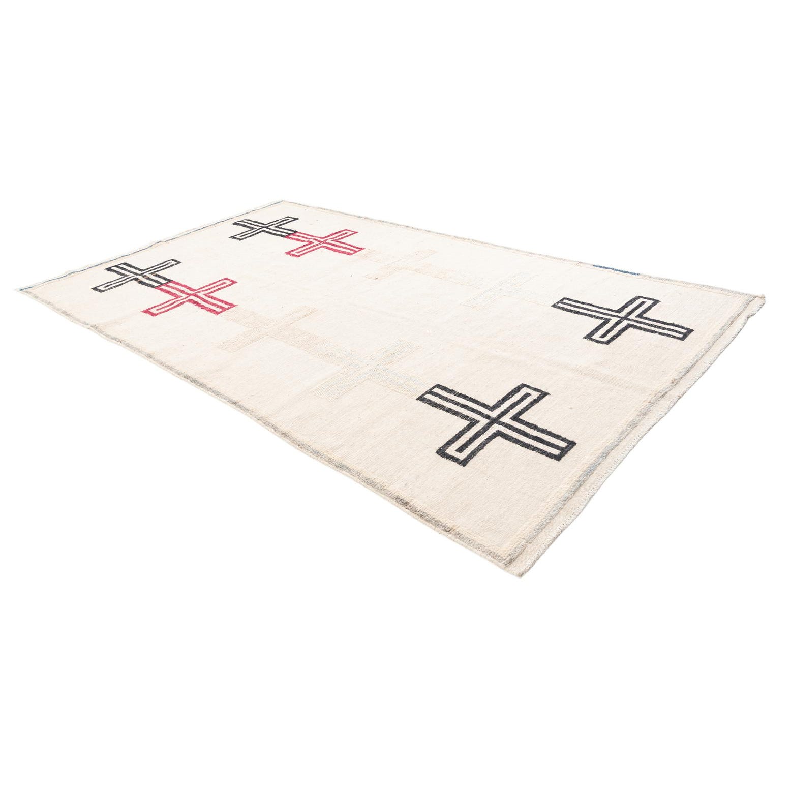 A 6x9 rectangular ivory wool shag rug featuring a modern tribal pattern of large black and red crosses.