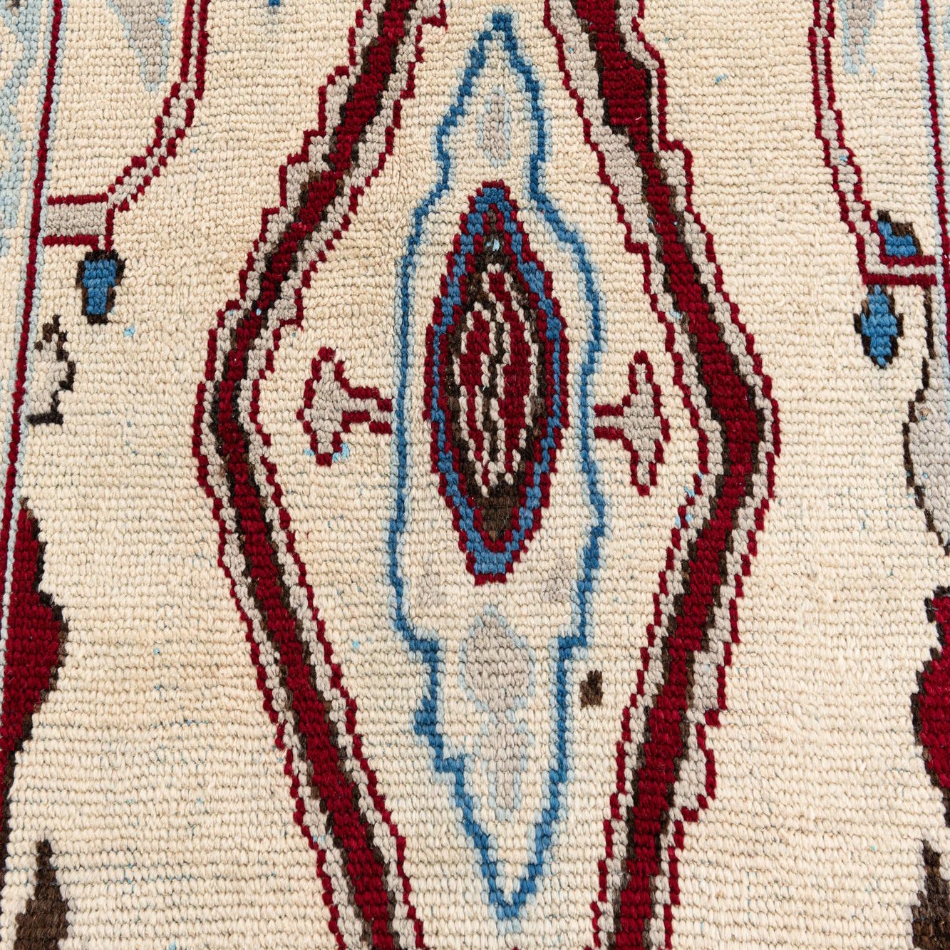 Primary color is Ivory. Colors in this rug include: Ivory, Blue, Light Blue, Light Brown, Red, Gray.