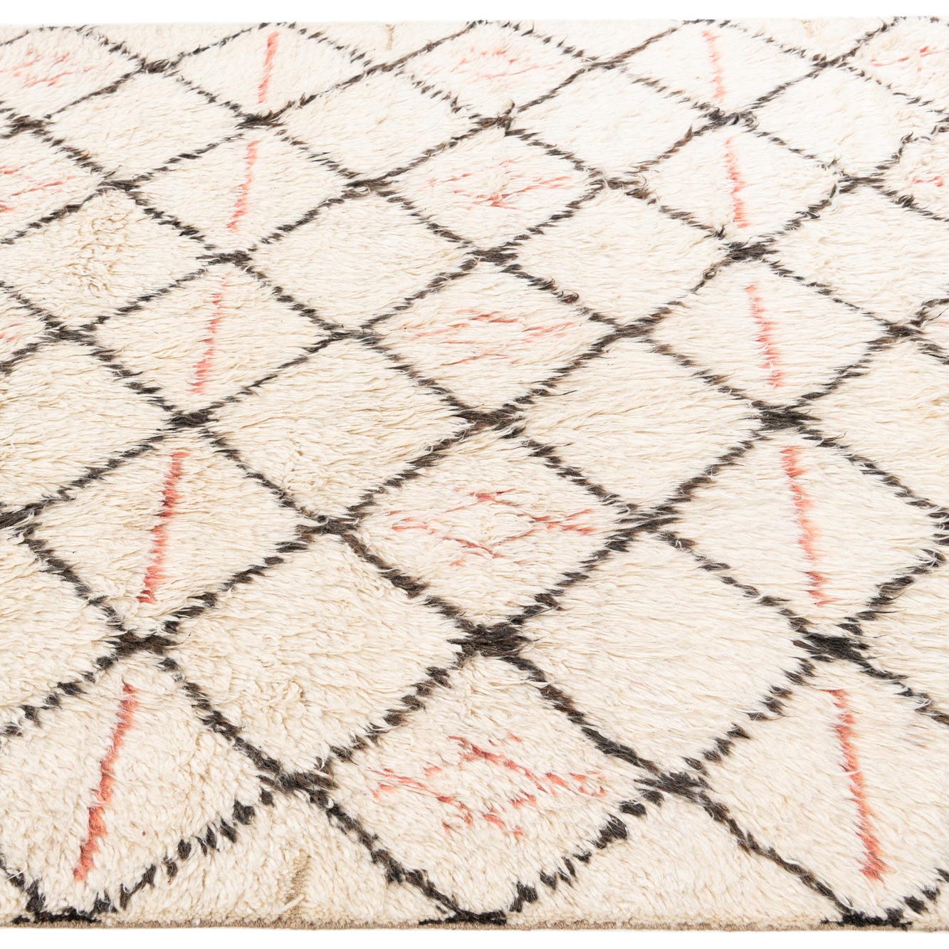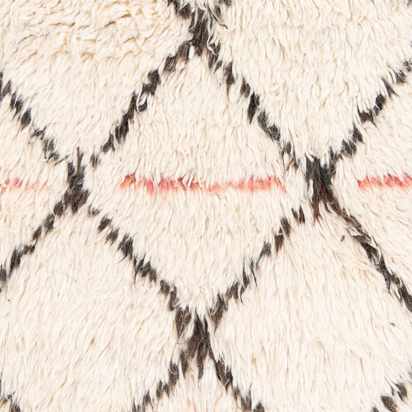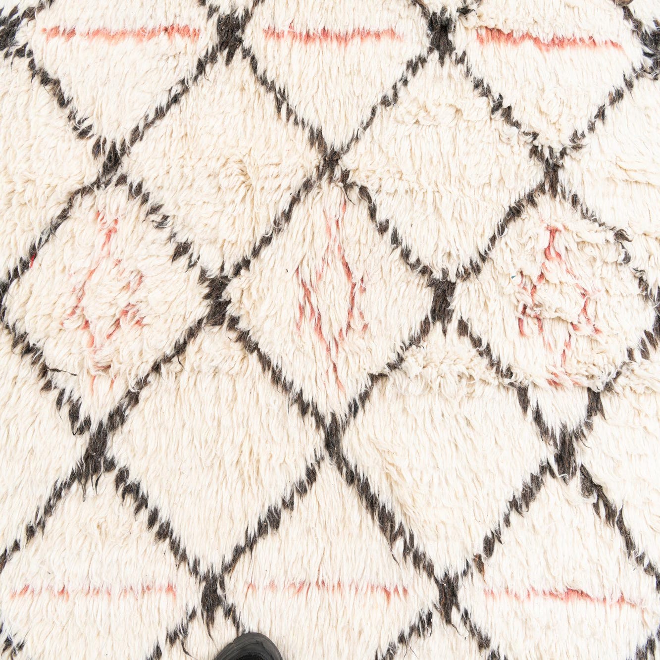 A 6x9 rectangular ivory shag rug with a black diamond trellis pattern and subtle pink tribal accents.