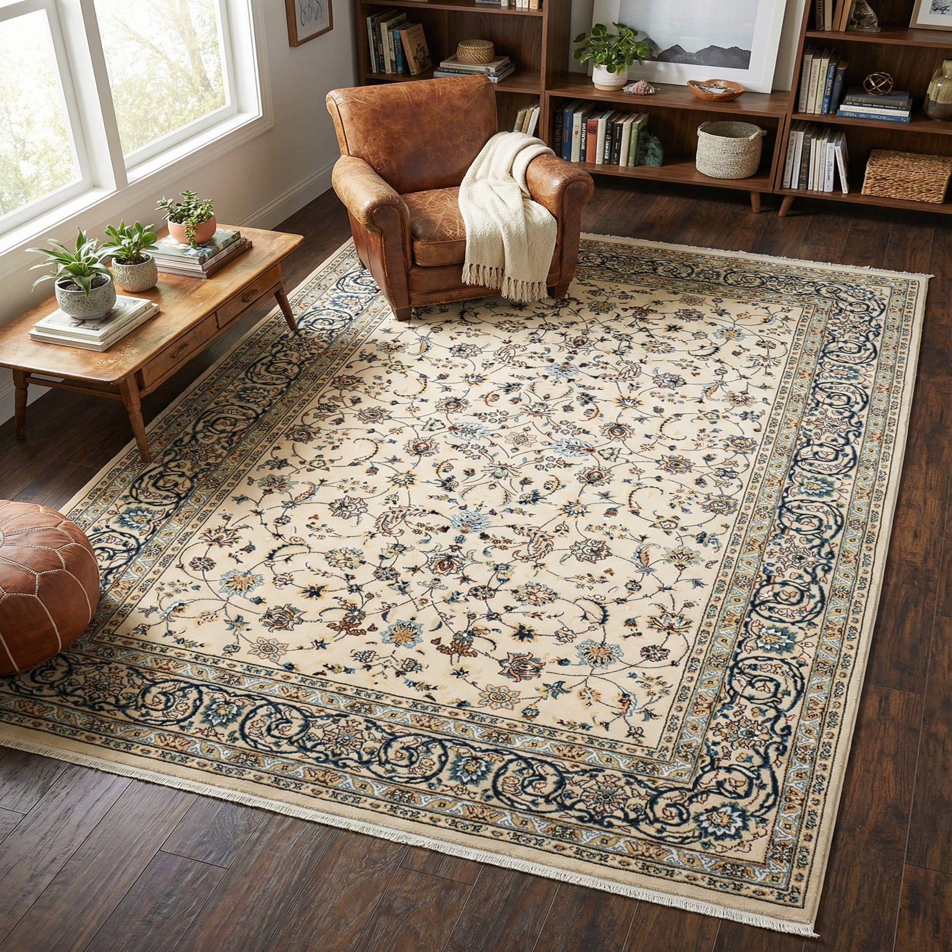 A traditional Persian-inspired pattern unfolds across an ivory ground, its field filled with delicate scrolling vines, palmettes and small floral sprays. A navy scroll border anchors the design while accents of blue, light blue, burgundy, puce, cream and soft green pick out the motif details, giving the rug a layered, lived-in look. The machine-made construction (85% polypropylene, 15% polyester) produces crisp pattern definition and a low-to-medium pile with a slight, pleasant sheen; when you run your hand across it the surface feels smooth and slightly cushioned underfoot.