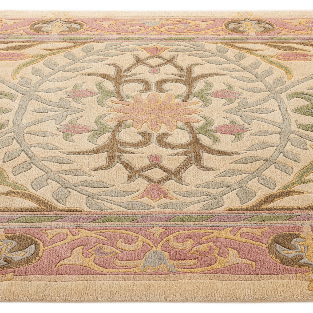 A 6x9 rectangular ivory wool rug with a modern oriental floral pattern in shades of pink, green, and brown, featuring a decorative border.