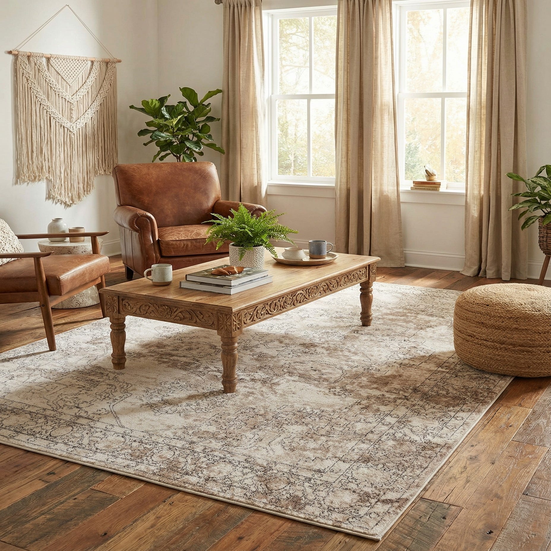 Machine-made from 85% polypropylene and 15% polyester, the rug has a low-profile, soft pile with a subtle sheen and a smooth, slightly cushioned hand underfoot. It works well in transitional living rooms to anchor seating areas, under a bedroom bed to add warmth and texture, or in an entryway to introduce a calm, collected aesthetic. Pair it with warm wood tones and linen upholstery for a relaxed farmhouse look, with matte black metal accents for a modern-leaning space, or with light, layered textiles for a serene Scandinavian-inspired room.
