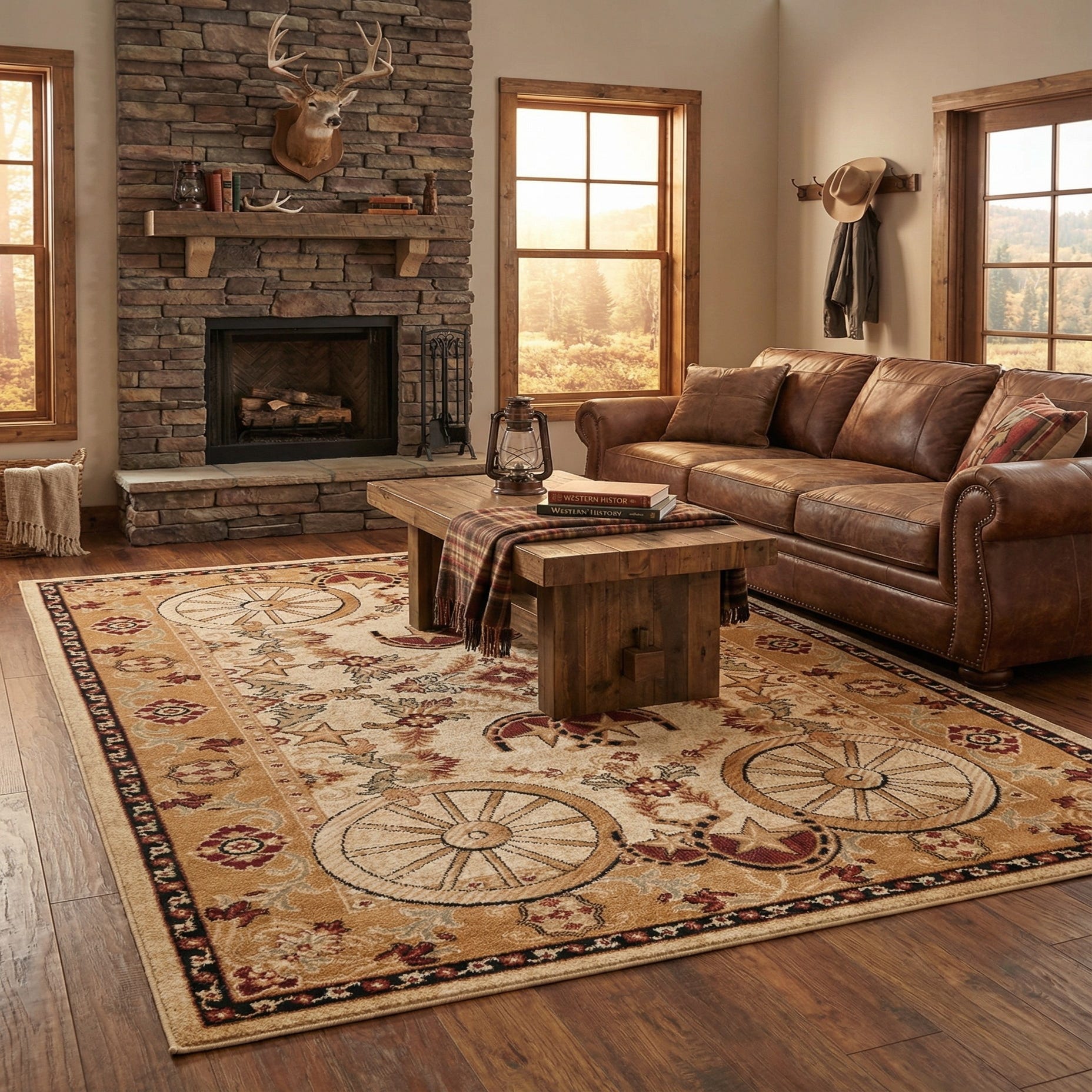A rectangular 6x9 ivory and cream rustic rug with wagon wheels, horseshoes, and stars, perfect for a living room.