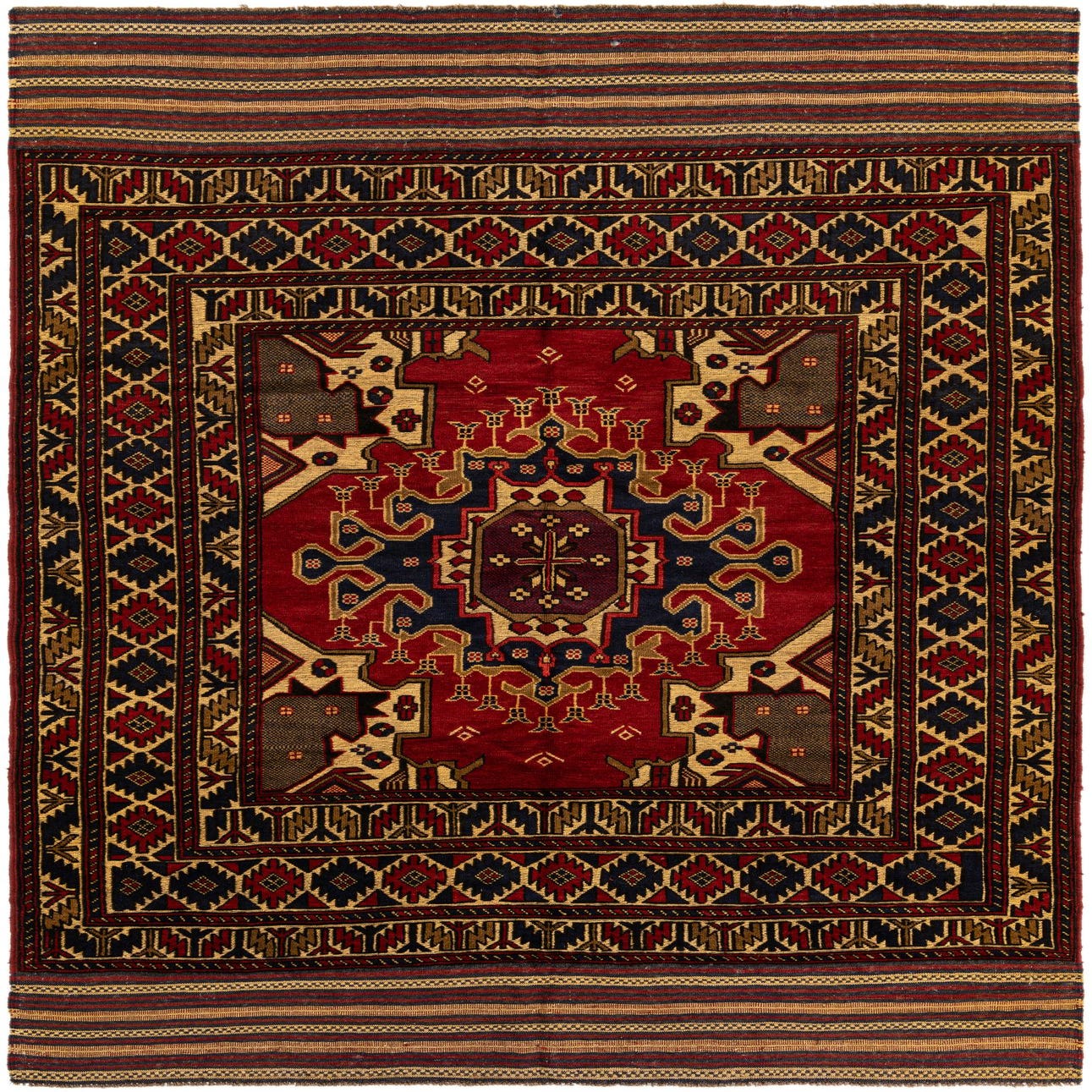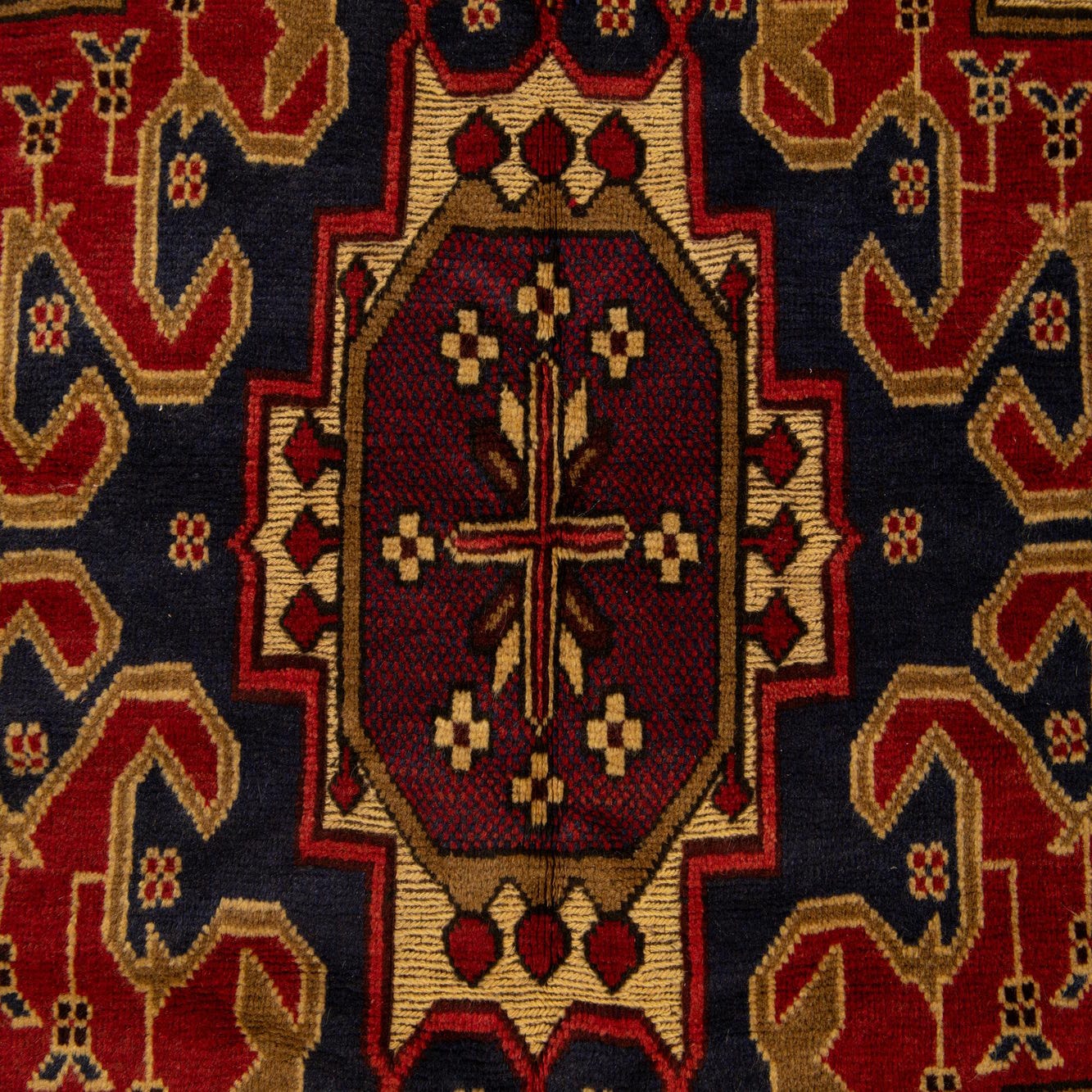 Primary color is Ivory. Colors in this rug include: Ivory, Red, Navy Blue, Olive.