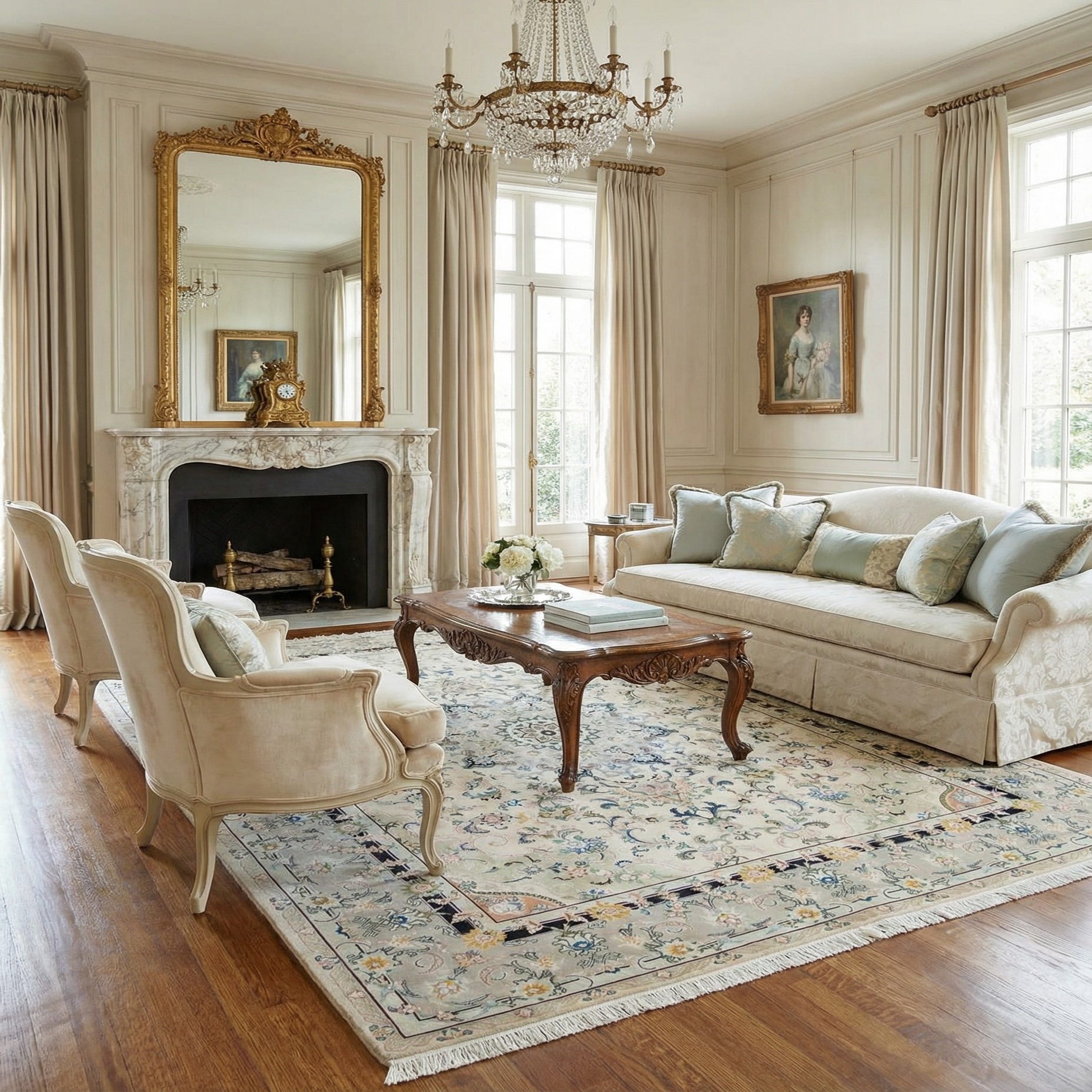 A 6x9 rectangular ivory and cream Persian rug with an intricate floral medallion pattern and a grey border.