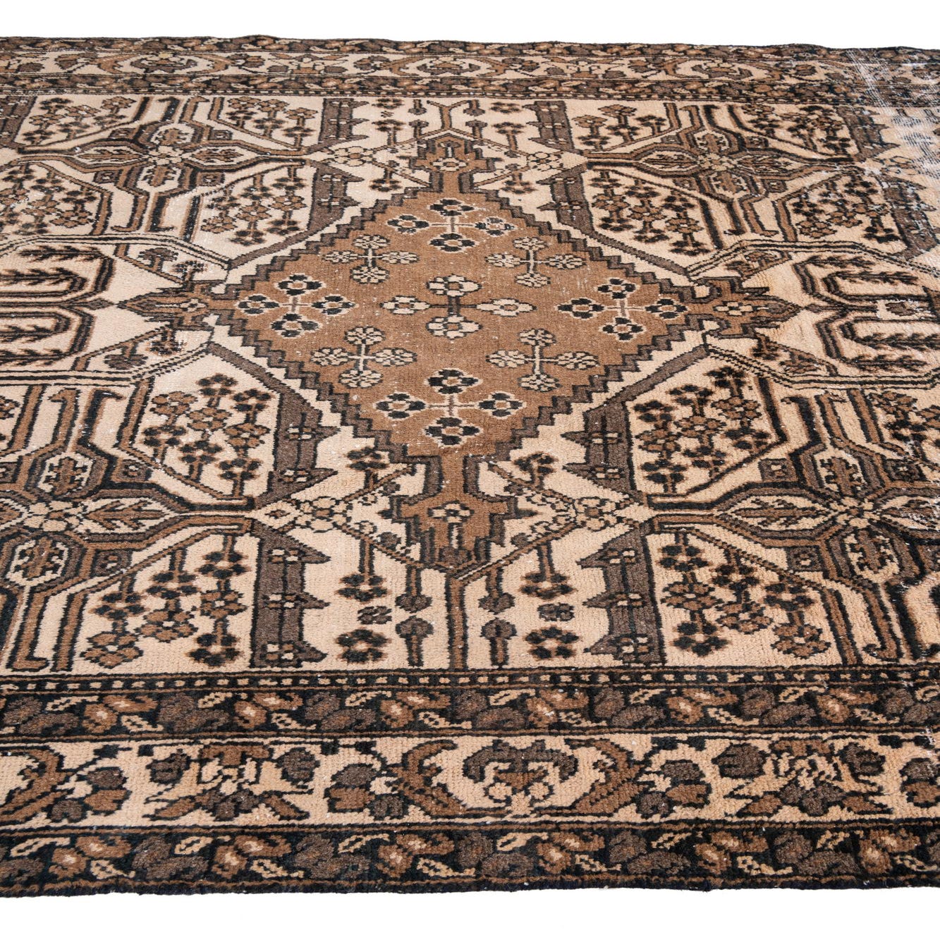A 6x9 rectangular ivory and brown Persian rug with a central medallion and intricate floral patterns, ideal for a living room.