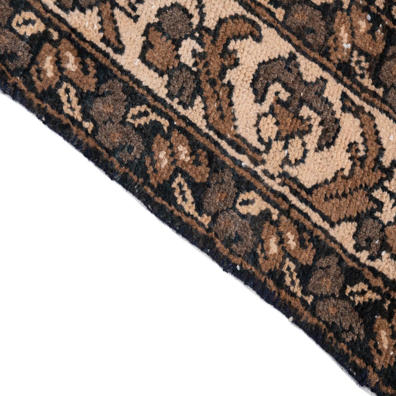 Primary color is Ivory. Colors in this rug include: Ivory, Black, Brown, Navy Blue.