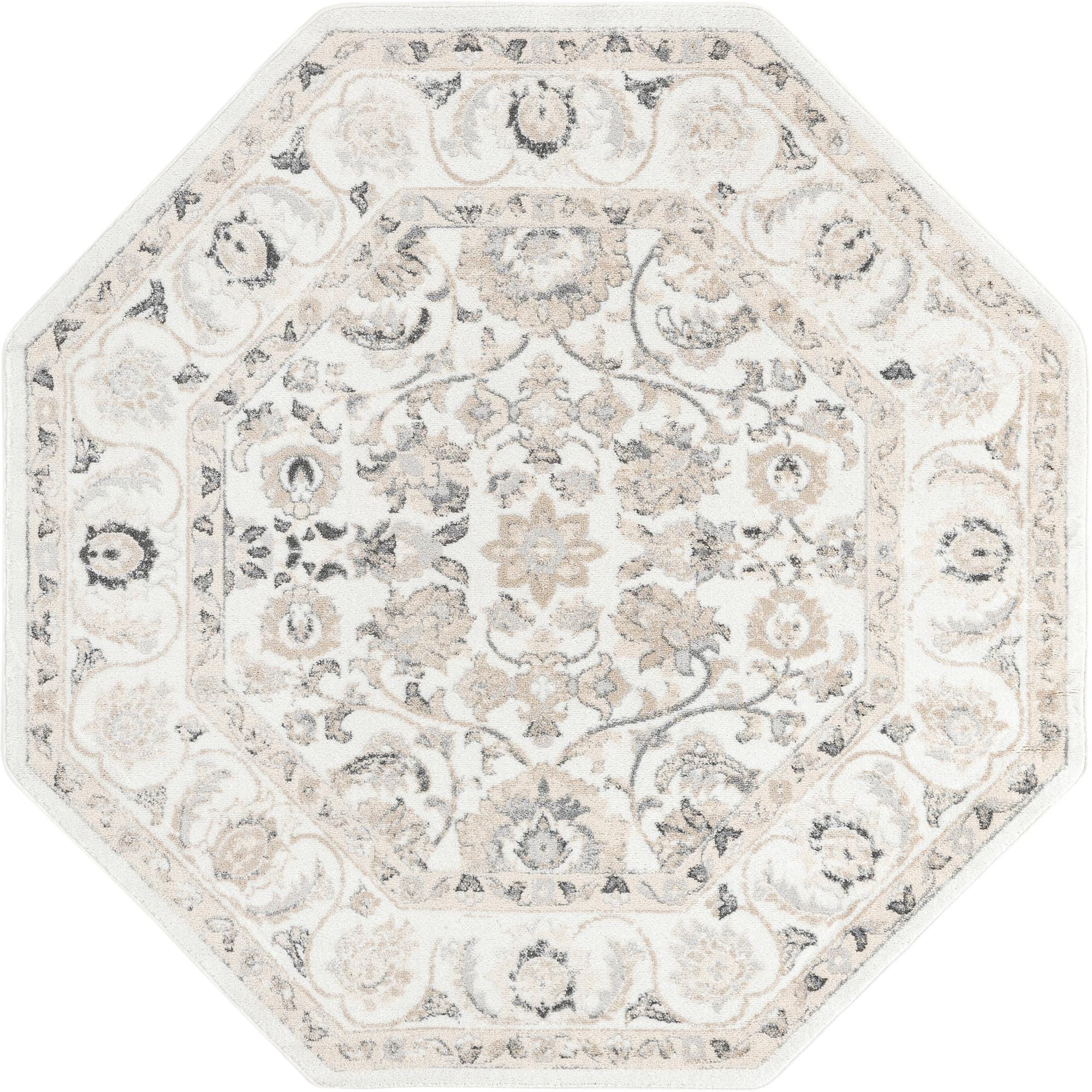 An ivory and cream 7' 0 x 7' 0 octagon rug with a traditional botanical and floral pattern.