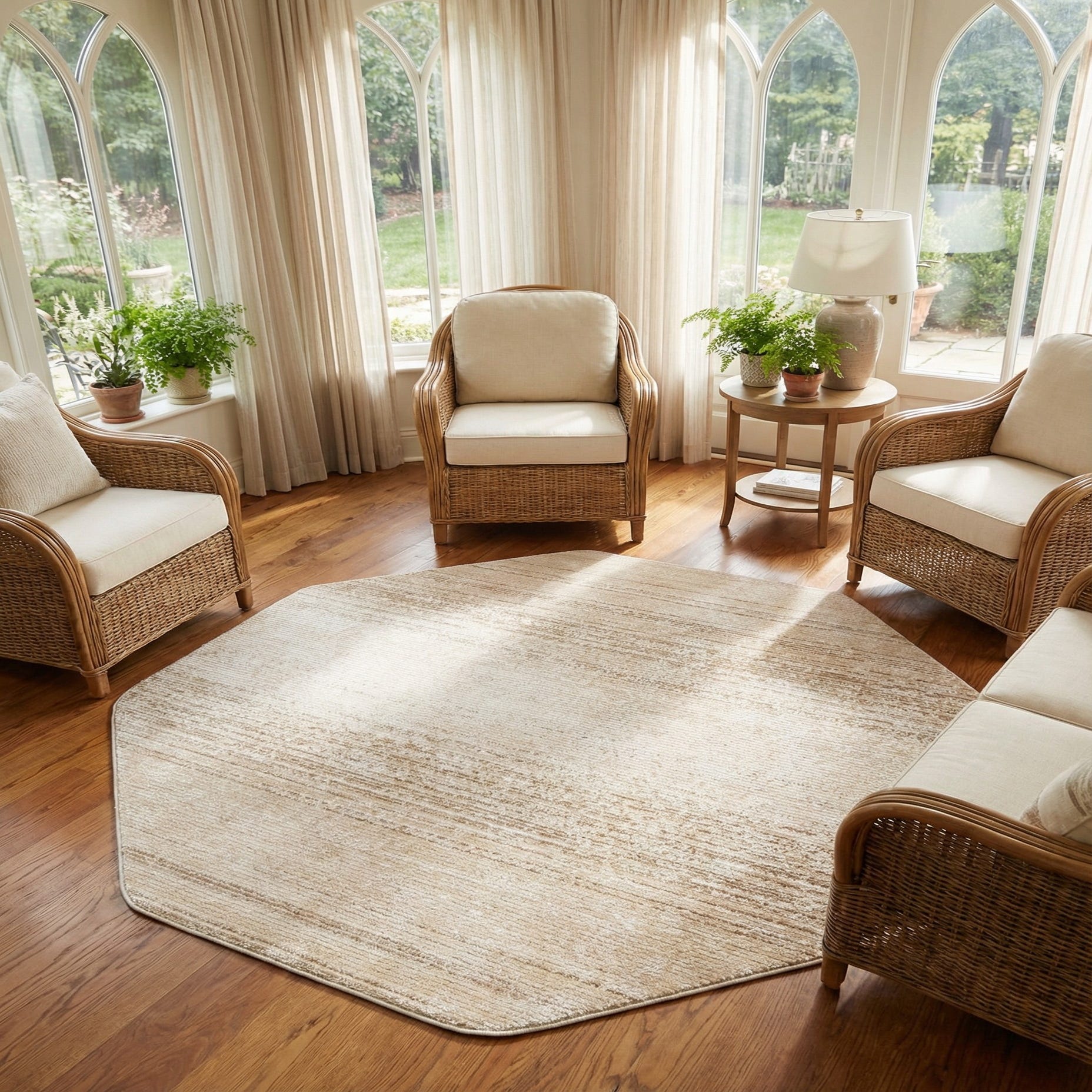 A soft ivory field anchors this octagonal rug, threaded with subtle horizontal striations in warm beige and brown that create a gently weathered, linear pattern. The machine-made polypropylene construction gives the surface a low, even pile with a soft, slightly velvety hand and a faint, natural sheen. The neutral palette and minimalist motif keep the look restrained, letting texture and tone take center stage.