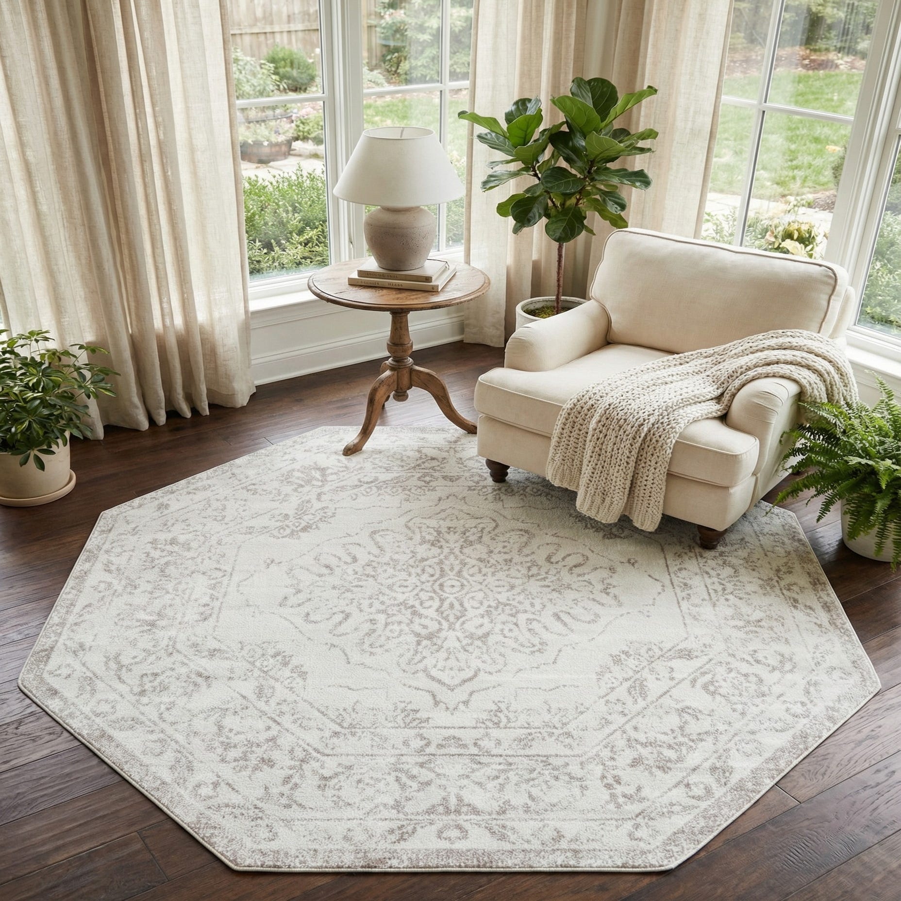 The unique octagon shape adds architectural interest and works well where a round or rectangular rug might feel predictable—place it beneath a round dining table, in an entryway to define the space, or layered in a living area to soften hard flooring. Its neutral ivory and gray palette pairs easily with modern farmhouse, transitional, Scandinavian, and coastal interiors, and complements light wood floors, painted furniture, and mixed metal accents for a calm, collected look.
