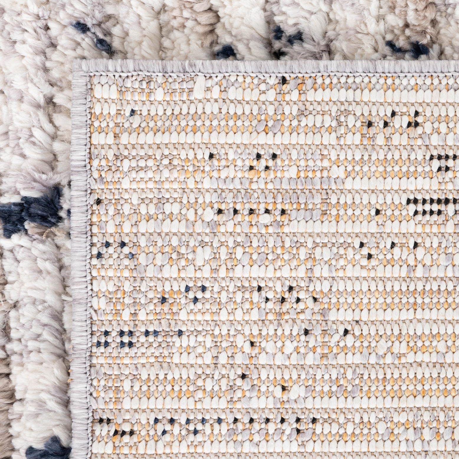 This piece works well under a small round dining table, as an anchor for a casual seating area, or in an entryway where its shape adds visual interest. The neutral ivory base and cool blue-gray accents pair easily with coastal, modern farmhouse, or contemporary interiors; combine with navy textiles, matte black metal finishes, or warm wood tones to bring out the rug’s palette and texture.
