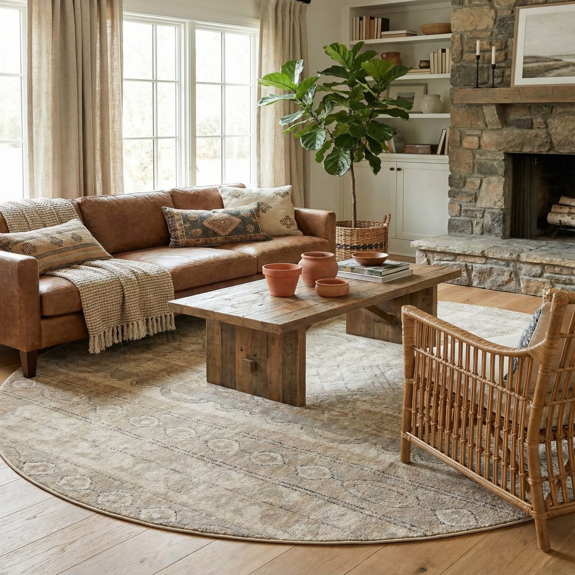 This round design is ideal for anchoring a circular dining table, defining a cozy seating nook, or layering beneath a small living room grouping. Its neutral palette pairs naturally with warm woods, linen upholstery, leather accents, and muted metallics, making it a good fit for transitional, modern farmhouse, Scandinavian, or casual contemporary interiors.