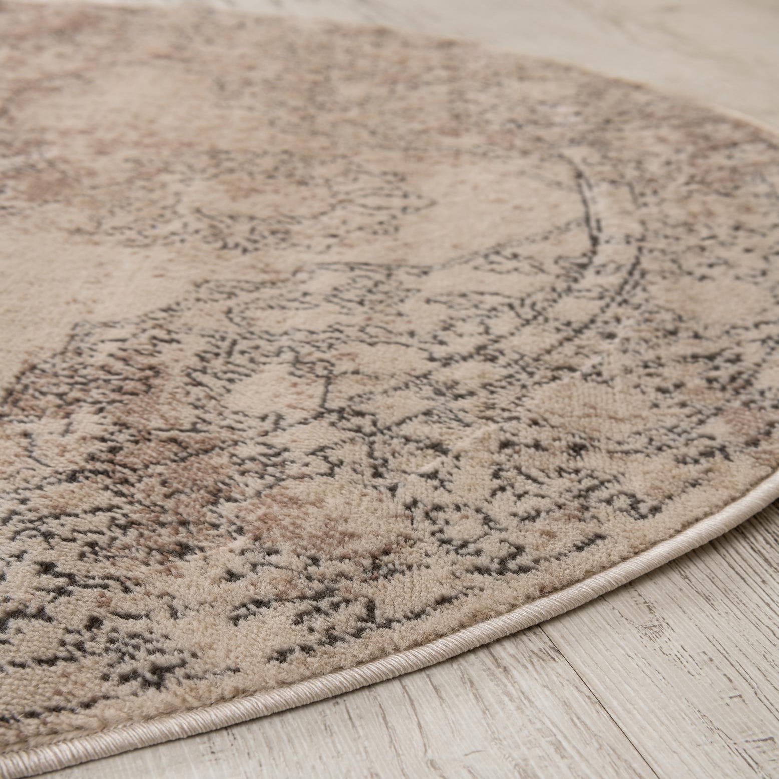 A softly distressed, vintage-inspired round rug with a low-profile pile and a faded medallion motif. The ivory background carries layered washes of beige and gray that form subtle floral and scroll details, creating a lived-in, antique look without heavy contrast. Machine-made from 85% polypropylene and 15% polyester, the rug has a smooth, slightly plush hand and a gentle sheen from the polyester highlights that catch light across the surface.