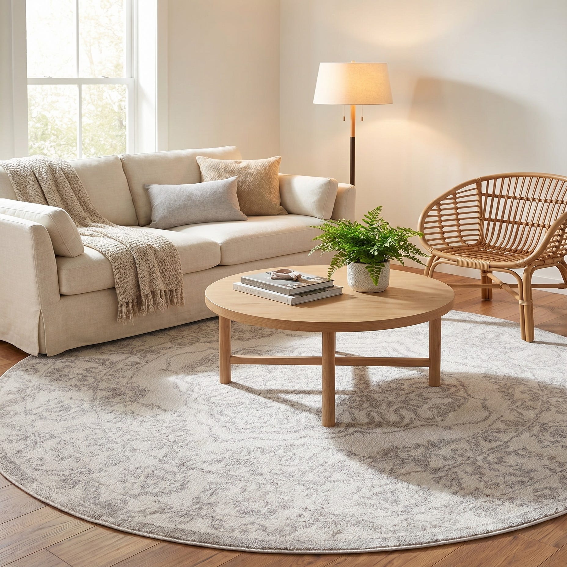 I bought this rug for the living room to add warmth to my grey floors and sofas. The grey detail on the ivory background tied everything in perfectly! The material is soft with a low pile so it is easy to vacuum! I would highly recommend!
