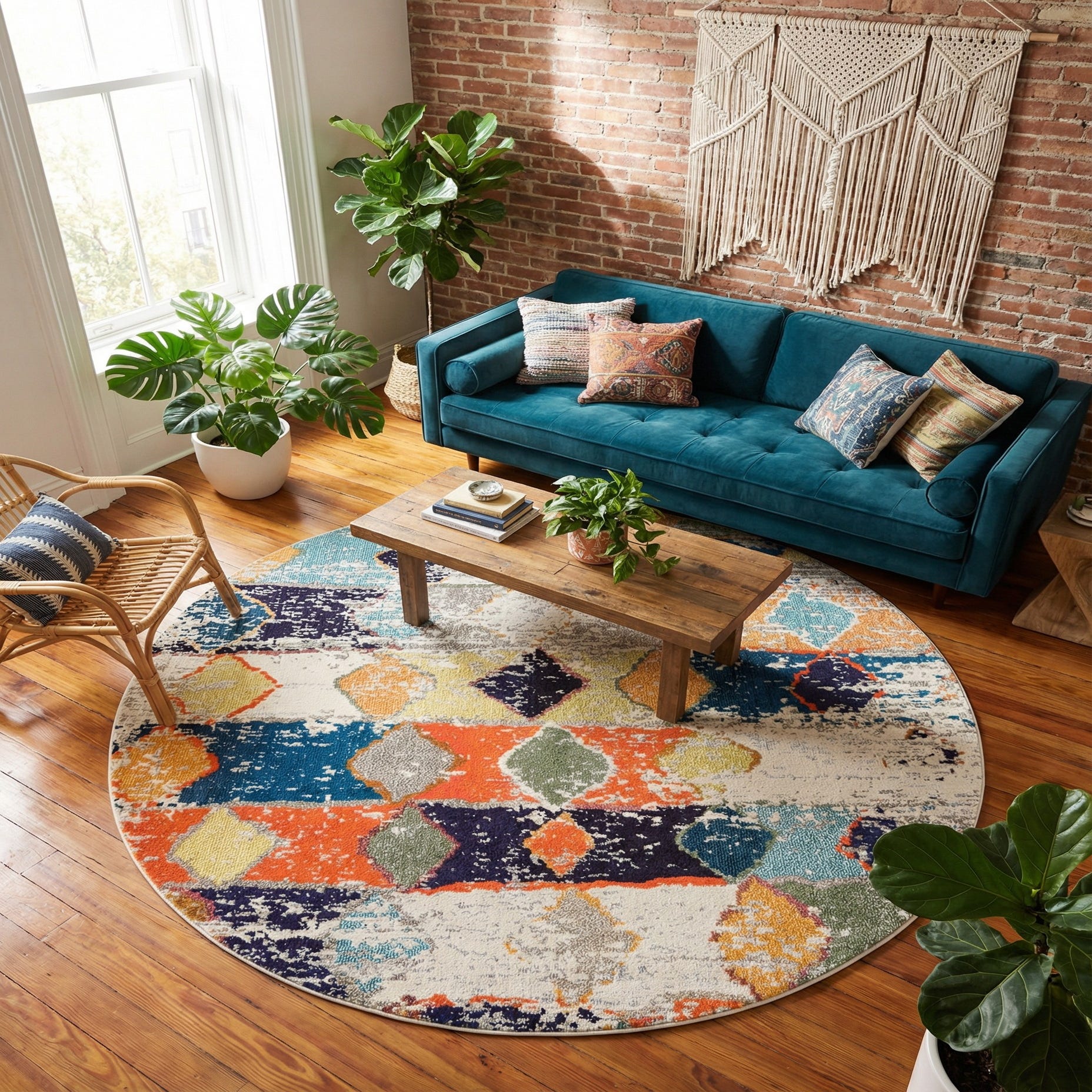 Place this rug beneath a round café table or in a small seating nook to bring color and pattern without overwhelming the space. It pairs well with mid-century wood furniture, neutral linen sofas, or eclectic textiles and woven accents for a collected feel; it can also anchor a bright children’s play area or add interest to a home office. The shape and pattern make it easy to layer with natural-fiber rugs or keep as a standalone statement in contemporary, transitional, or bohemian interiors.