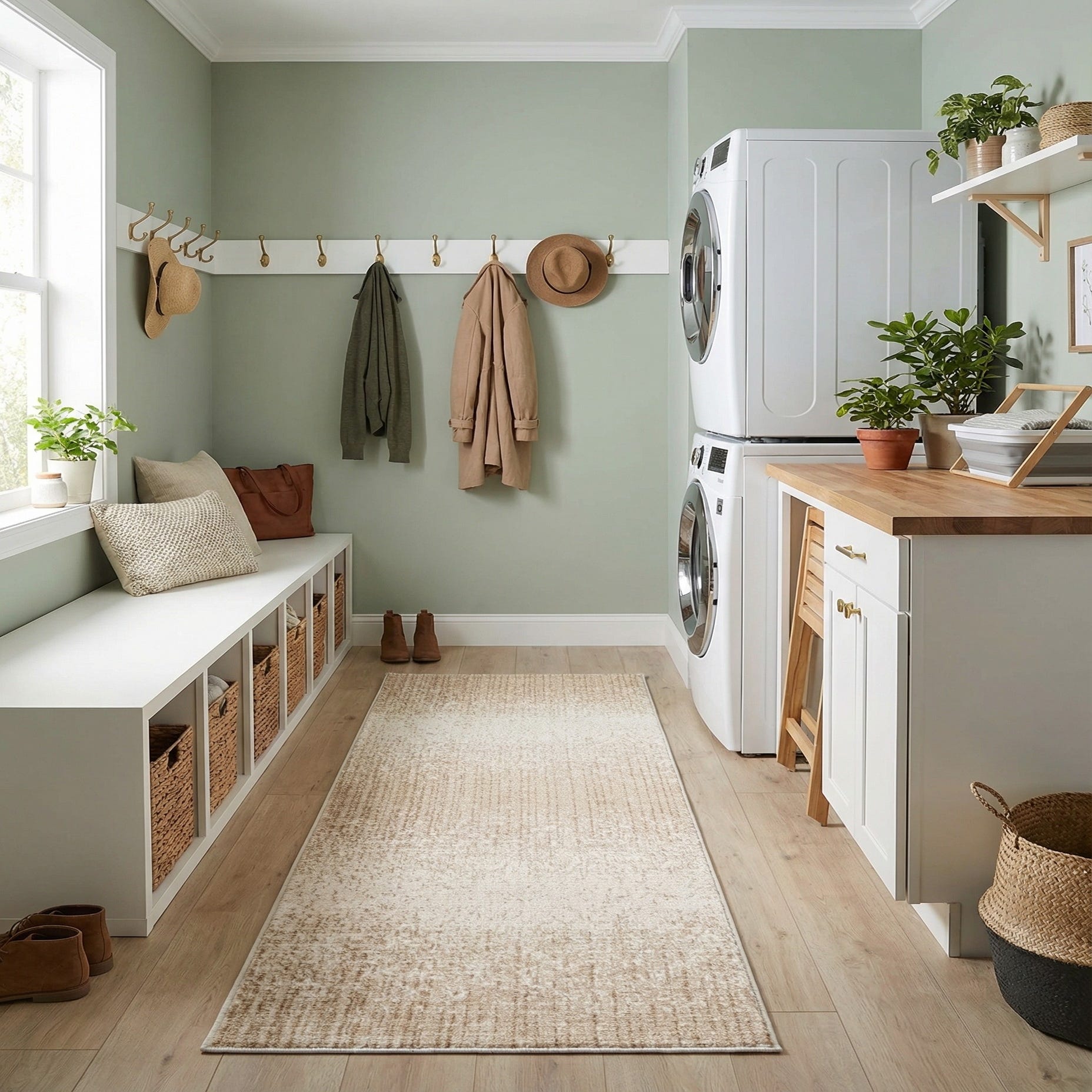A 7 ft runner rug in shades of ivory and cream with a subtle textured pattern, ideal for a hallway.
