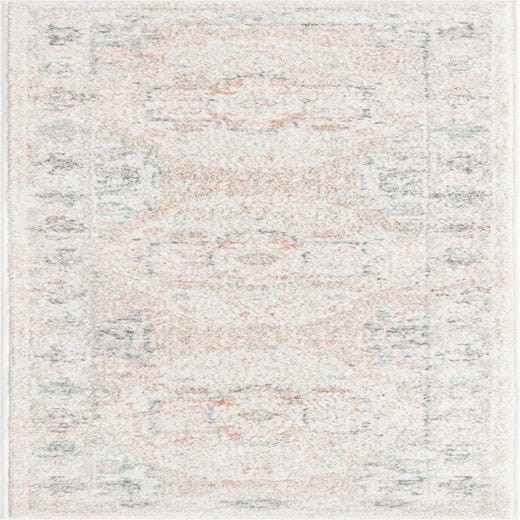 A soft vintage-inspired medallion pattern rests on an ivory background, with faded gray and dusty pink accents woven into the design. The motifs are gently distressed, giving the rug a relaxed, timeworn character that balances traditional ornament with a contemporary, airy palette. Subtle border details and a central motif are visible without strong contrast, creating a calm, layered look that complements light, neutral interiors.