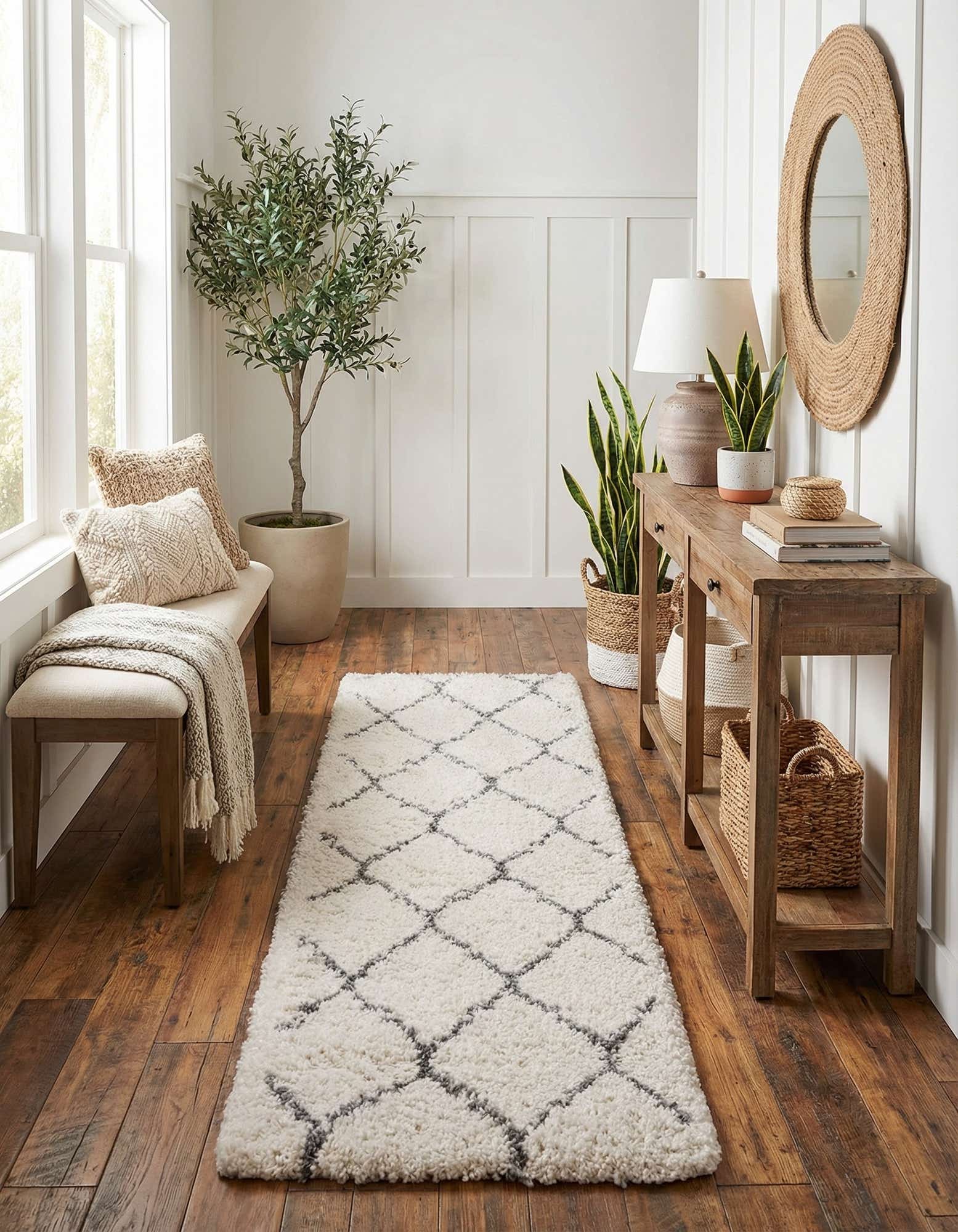 A deep, plush shag pile invites bare feet with a cushiony feel; the dense polypropylene fibers create a lofty texture that holds its shape under regular use. Machine-made construction in 100% polypropylene delivers consistent pile and pattern across the runner. Ideal for hallways and entries, this rug also works well along the side of a bed or in a narrow kitchen aisle, and pairs naturally with light wood floors, linen upholstery, and interiors leaning toward modern farmhouse, Scandinavian, or contemporary neutral schemes.