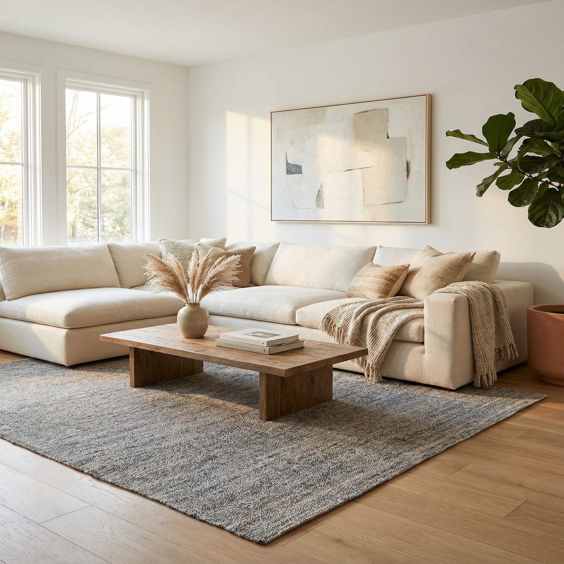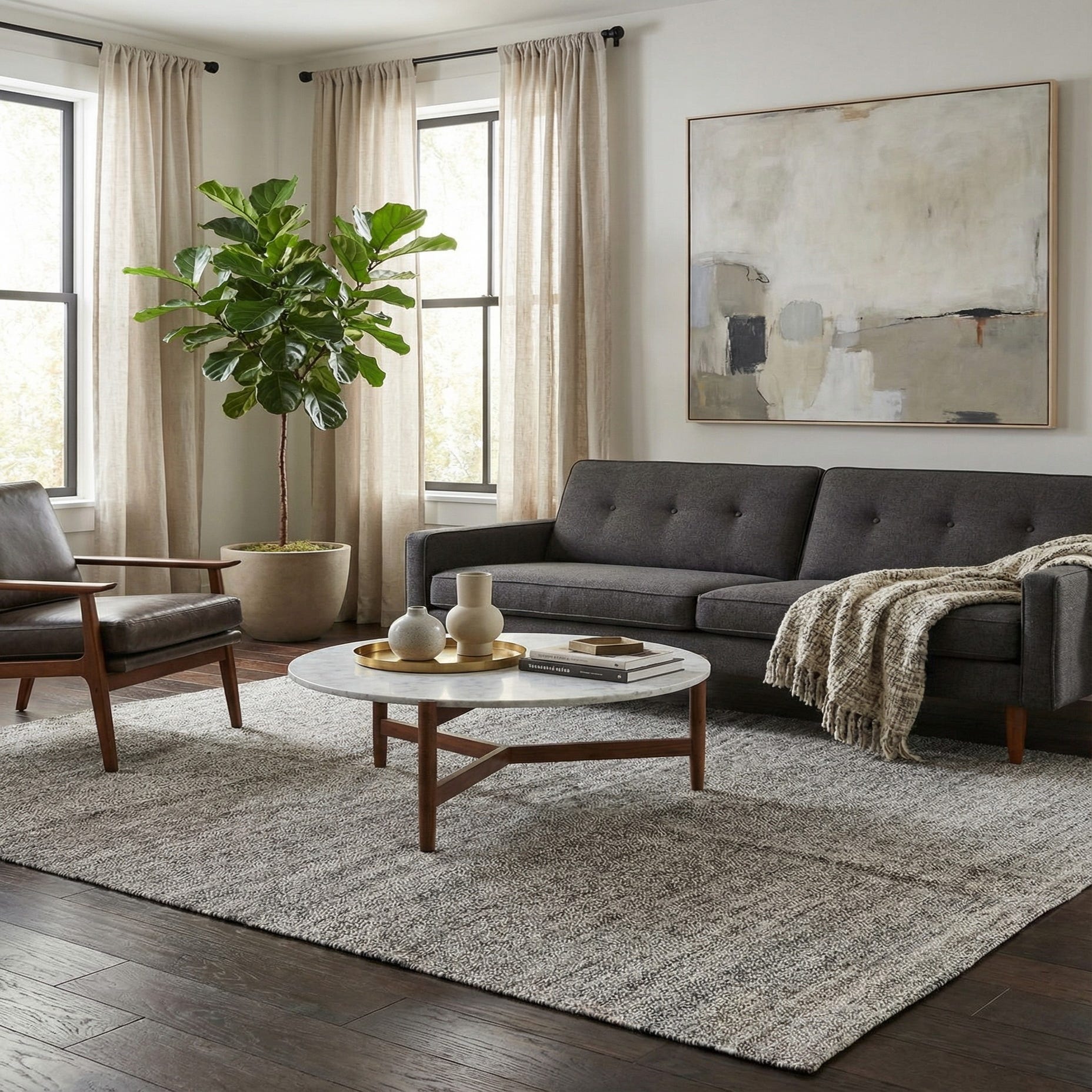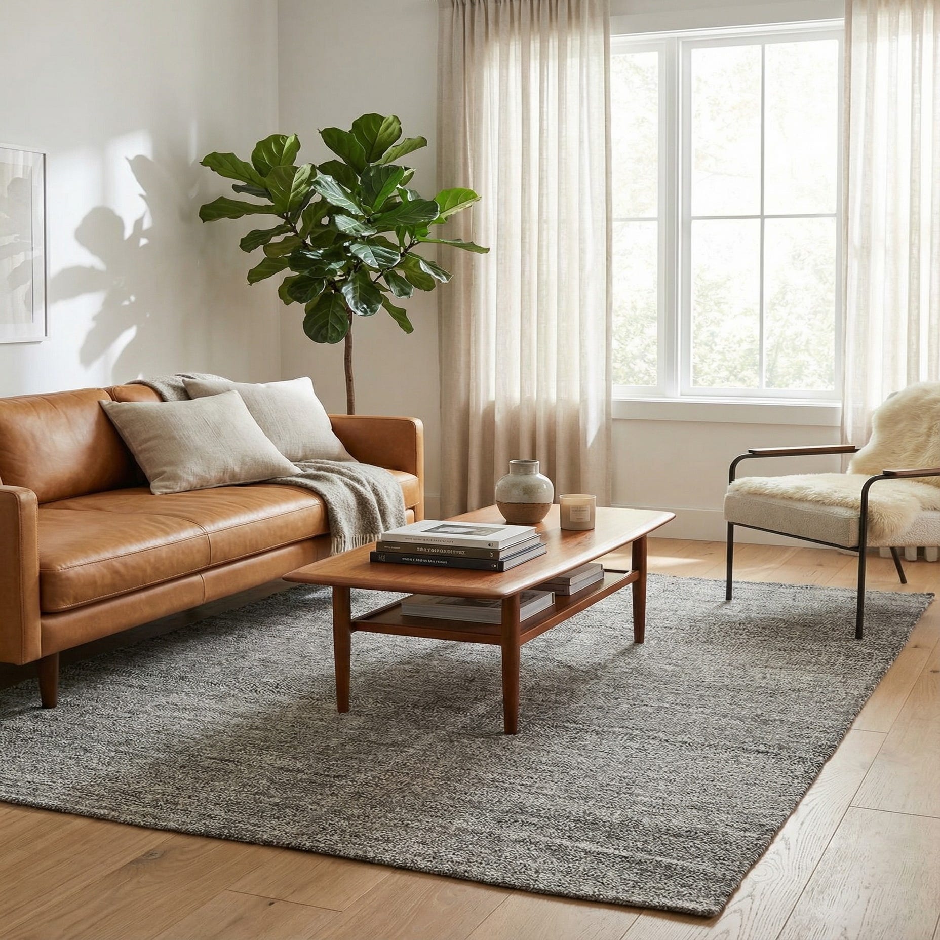 This rug works well in contemporary living rooms beneath a low-profile sofa, in a dining area where the neutral ground keeps the space feeling open, or layered in a bedroom to add soft texture underfoot. Pair it with warm wood tones and black metal accents to echo the flecked black, or soften sleek furniture with linen textiles and leather for a calm, collected interior.