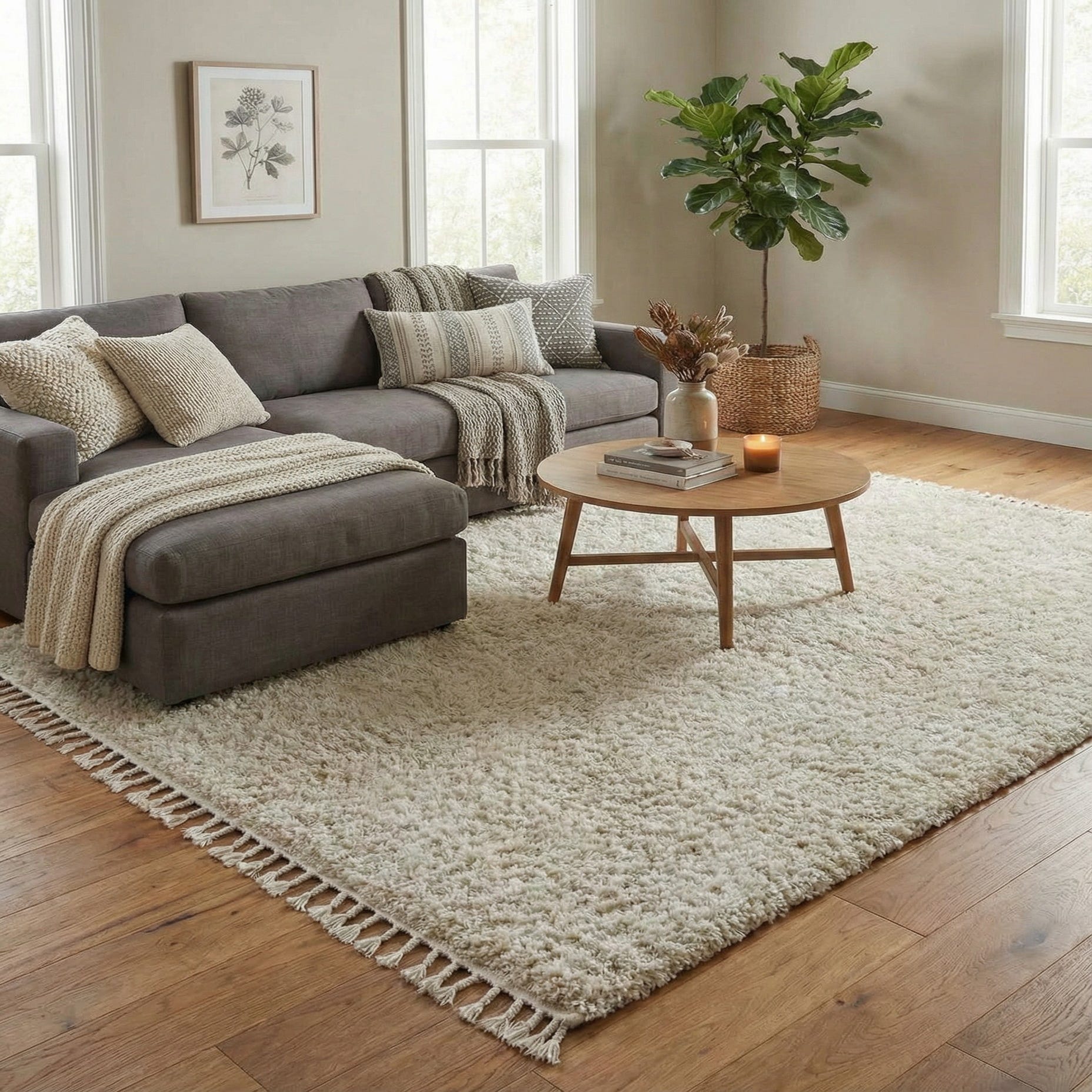 This rug works well as an anchor for a living room seating area, layered beneath a coffee table, or as a cozy addition at the foot of a bed. Its warm ivory and beige tones pair nicely with natural wood furniture, linen upholstery, and light metallic accents, fitting into modern, Scandinavian, boho, or transitional interiors. Use it to soften hardwood or tile floors and to add tactile warmth to reading nooks, bedrooms, or family rooms.