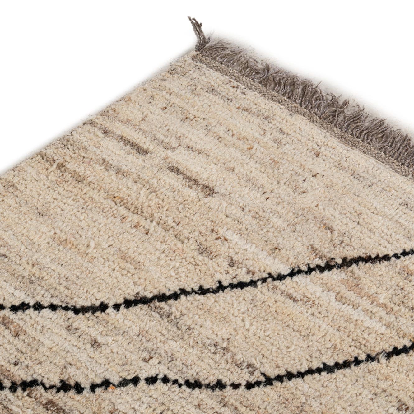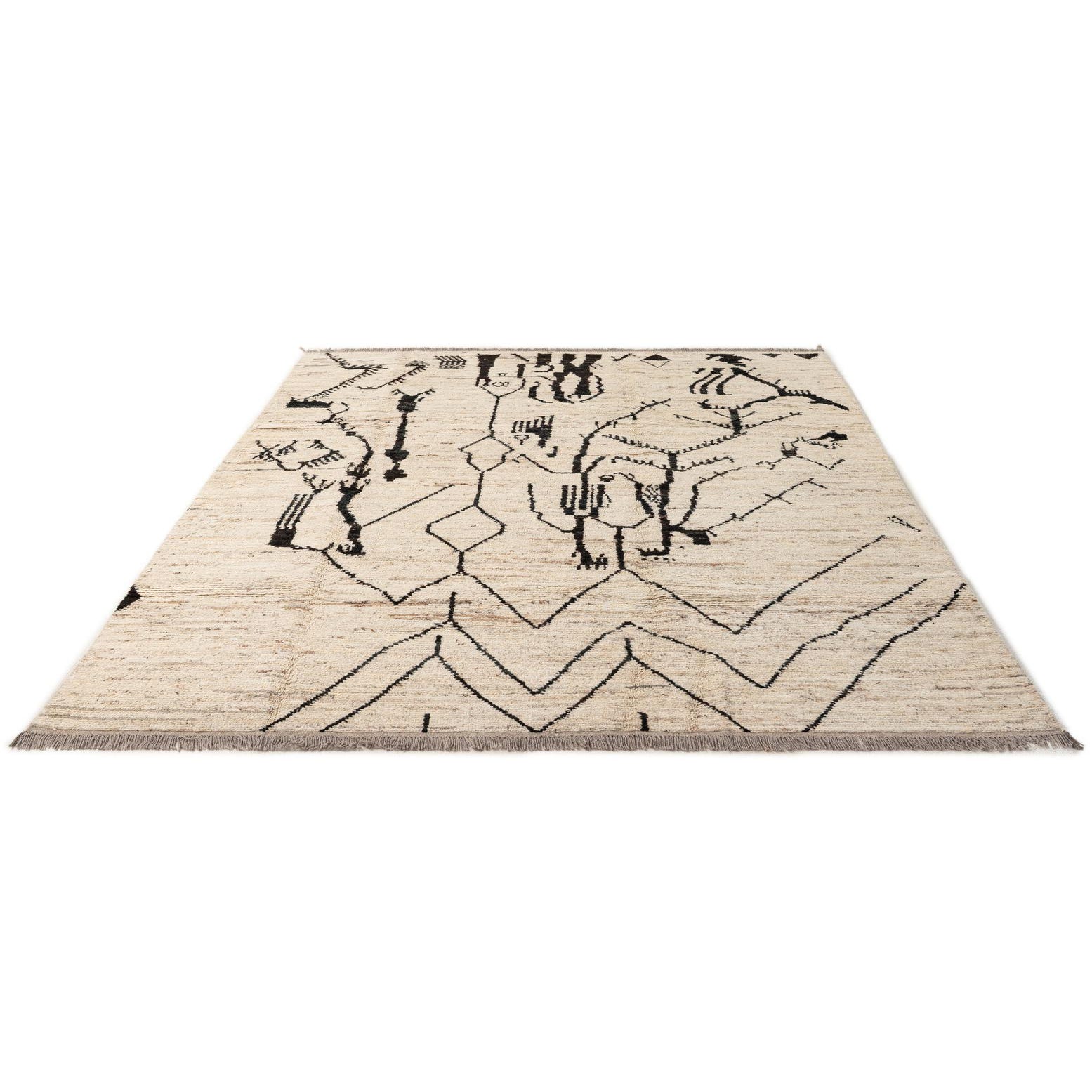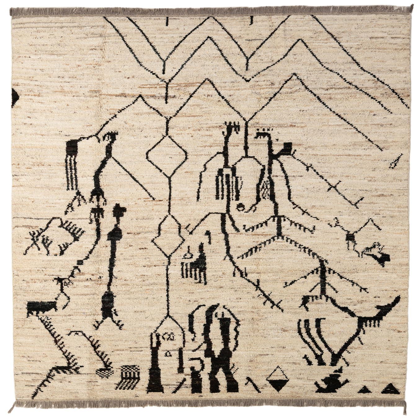 A 7x10 rectangular ivory wool rug with a medium pile, featuring an abstract black pattern of lines and shapes.
