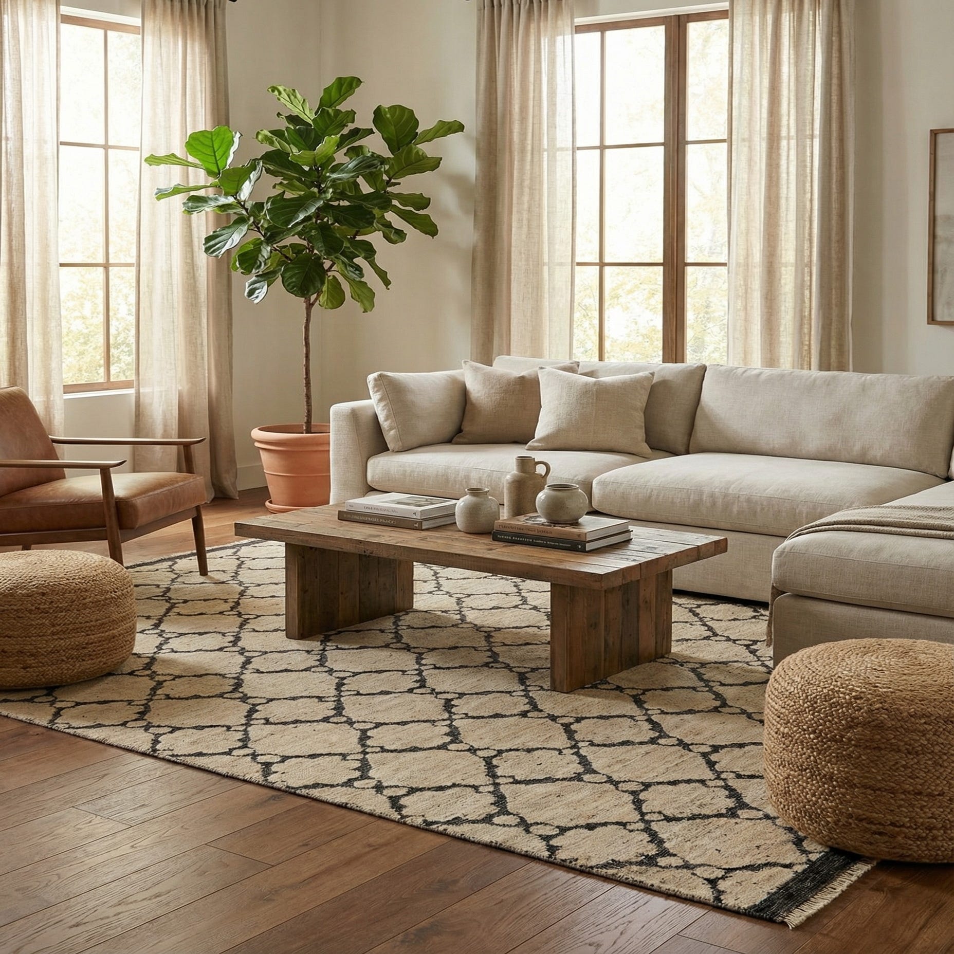 A 7x10 rectangular ivory wool rug with a modern abstract black geometric pattern, suitable for a living room.