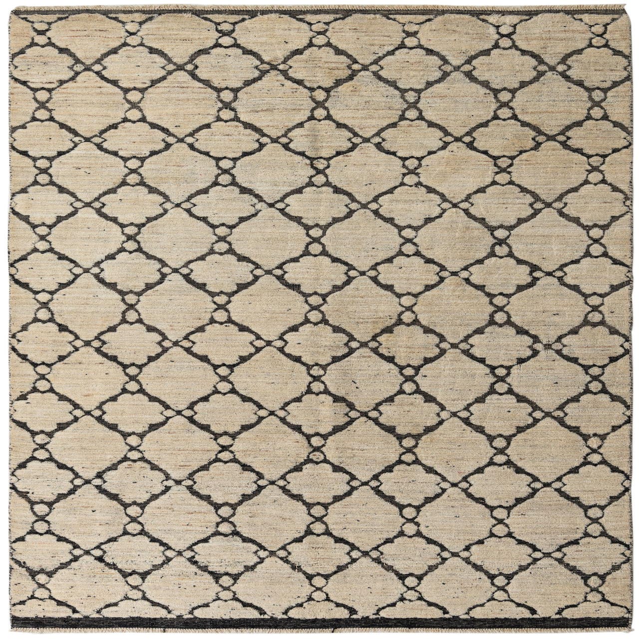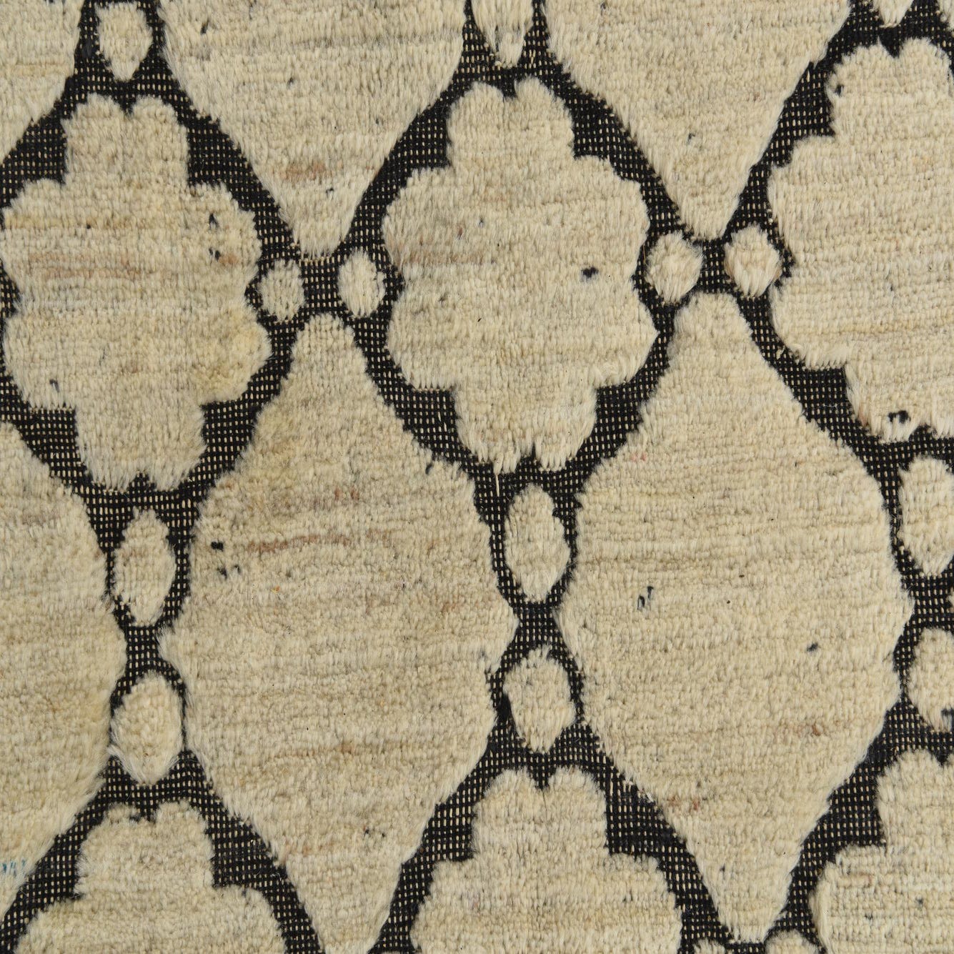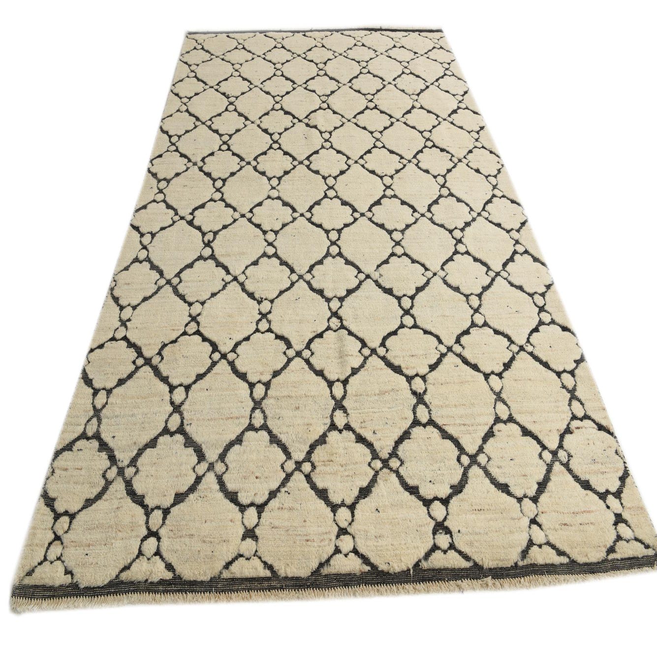 The Darya collection offers a hand-knotted 100% wool rug that features a striking balance of traditional design with a modern palette. This 7x10 rug exhibits an ivory background with a contrasting black pattern, showcasing a repeating lattice motif that is at once elegant and bold. The pattern is outlined with a dark hue that highlights the geometric intricacies, creating a focal point in any room. The wool composition lends a plush texture that is pleasant underfoot, while the fringe adds a classic finish to the piece.