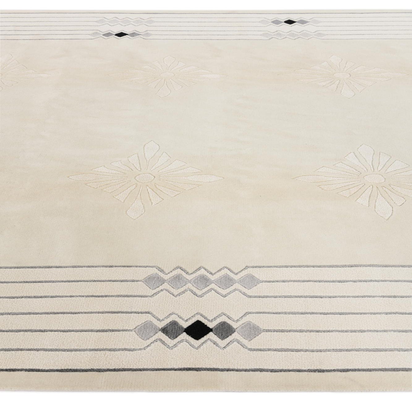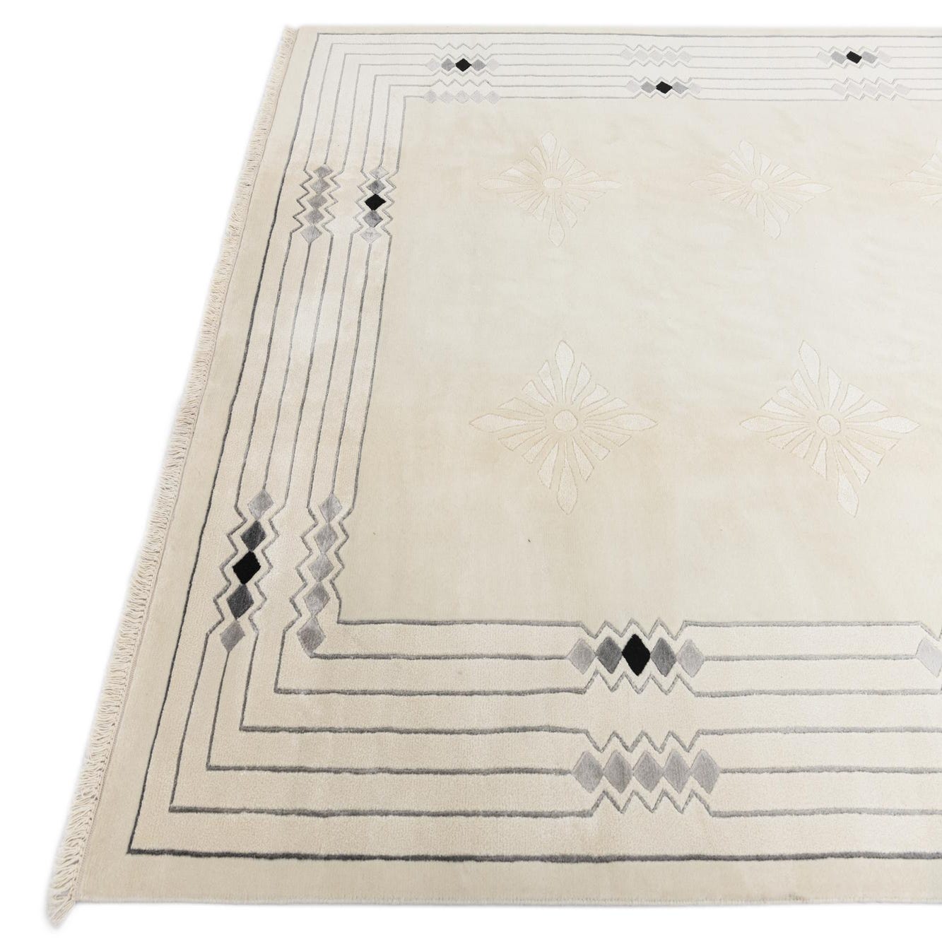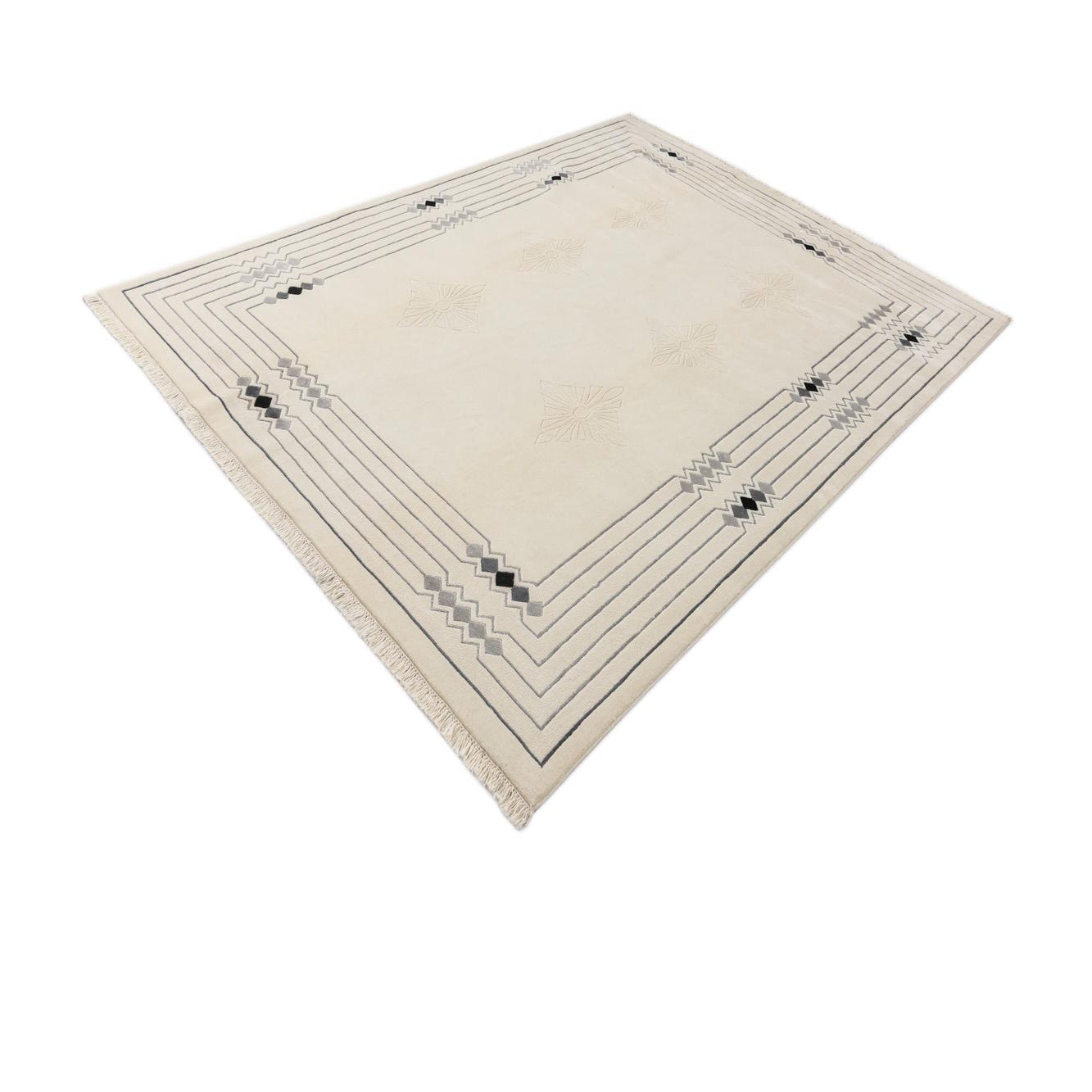 A 7x10 rectangular ivory wool rug with a modern oriental pattern, featuring a grey geometric border and subtle floral motifs in the center.