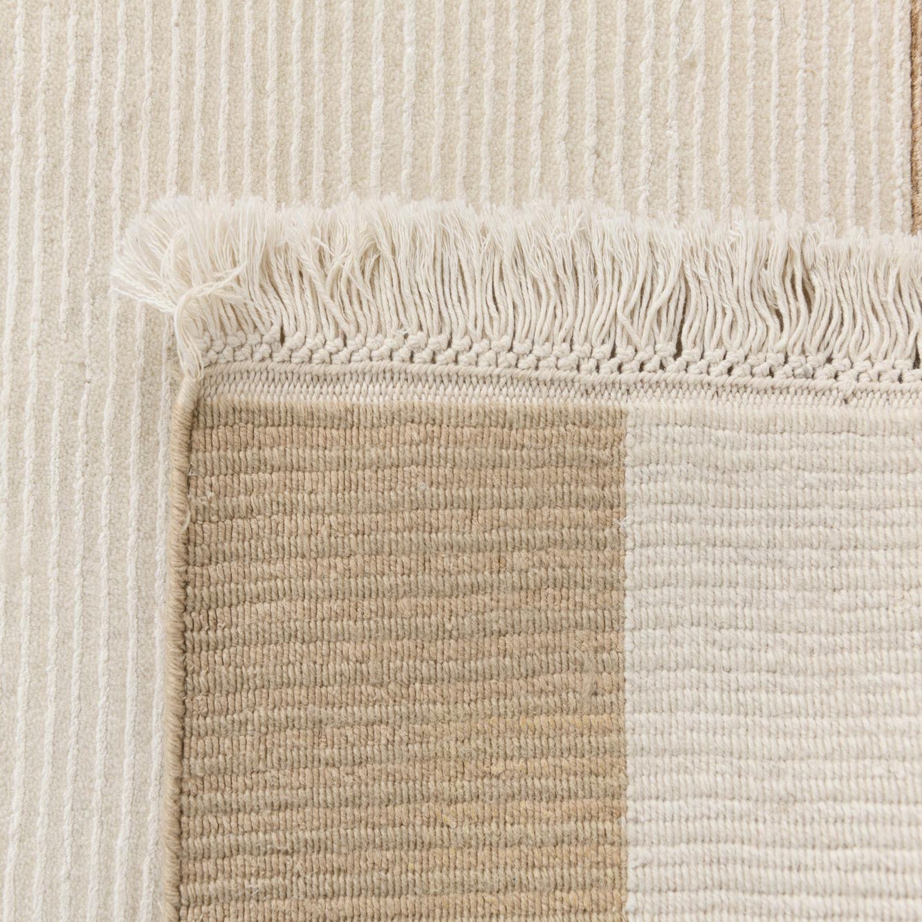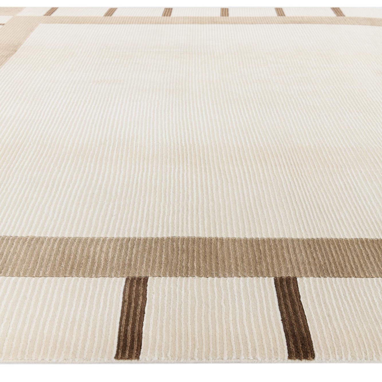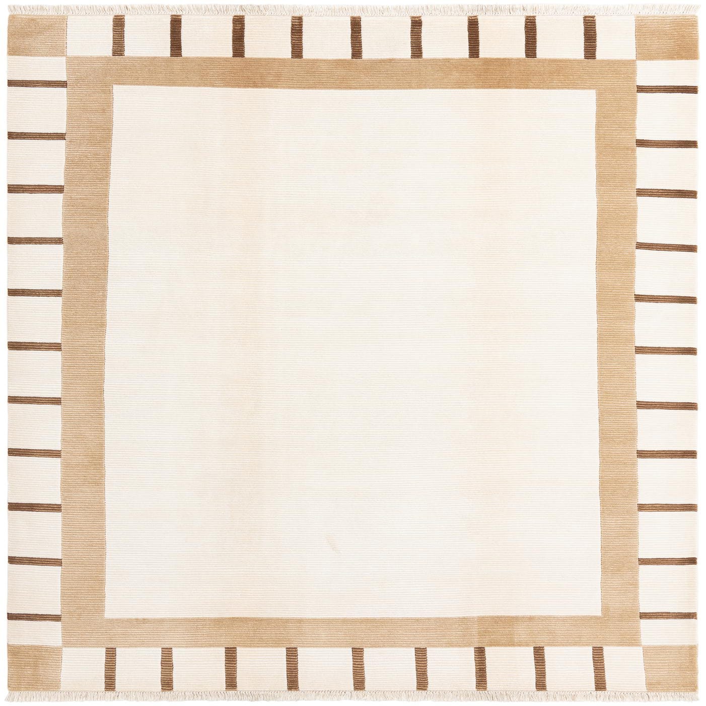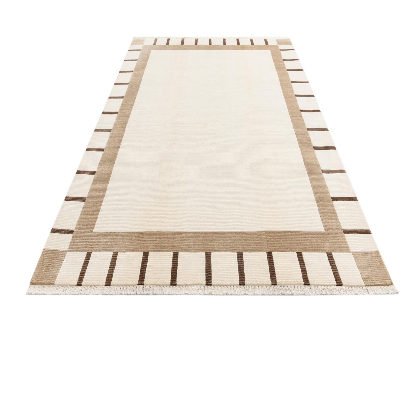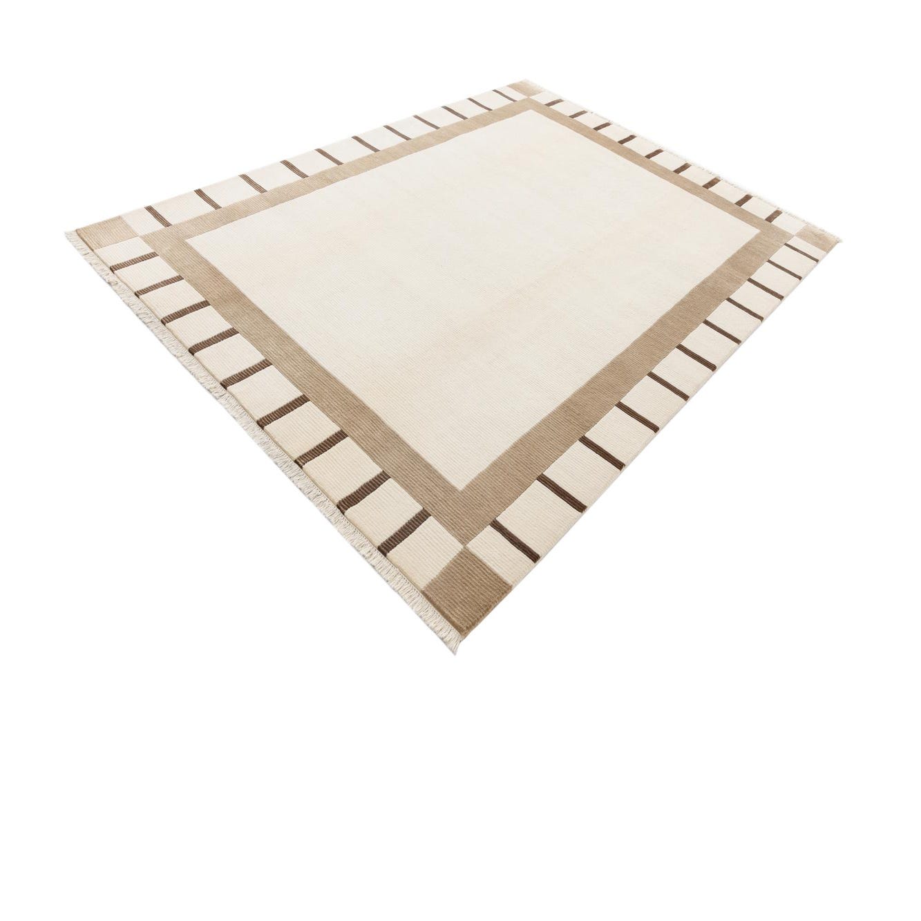 A 7x10 rectangular ivory and cream wool rug with a modern oriental design, featuring a wide tan border and thin brown stripes.