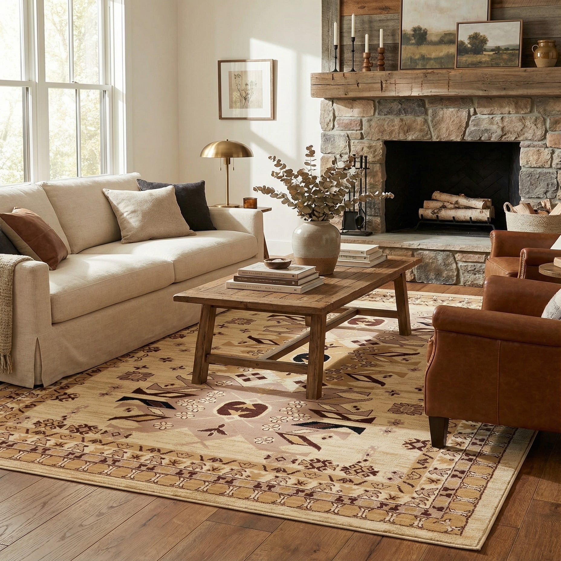 This rug works well in a variety of settings: place it beneath a sofa and coffee table to anchor a neutral living room, layer it under a dining table to warm a breakfast nook, or position it in a bedroom to complement warm wood floors and soft linens. It pairs naturally with transitional, farmhouse, or global-inspired interiors and coordinates easily with leather seating, muted upholstery, and brass or wooden accents for a calm, collected look.