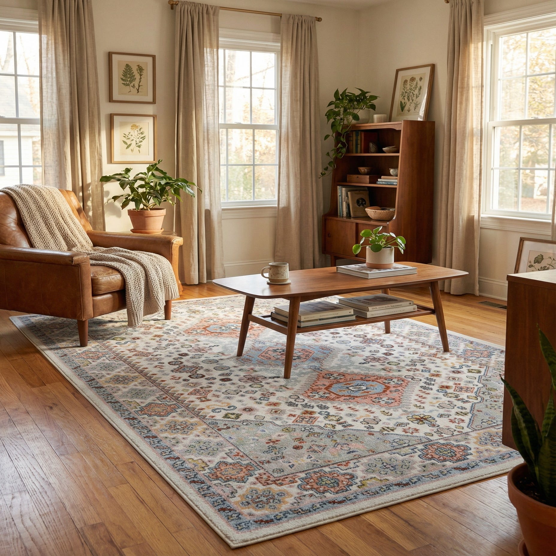 Primary color is Ivory. Colors in this rug include: Ivory, Gray, Green, Light Blue, Terracotta, Pink.