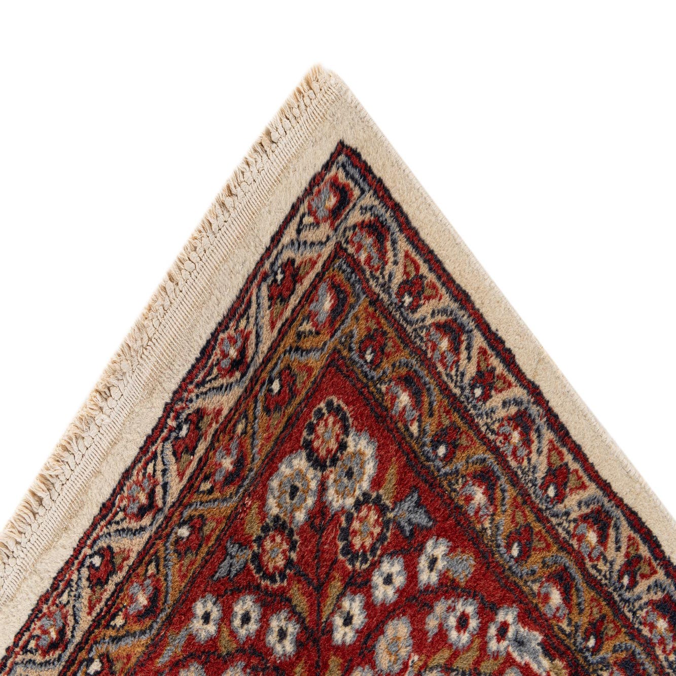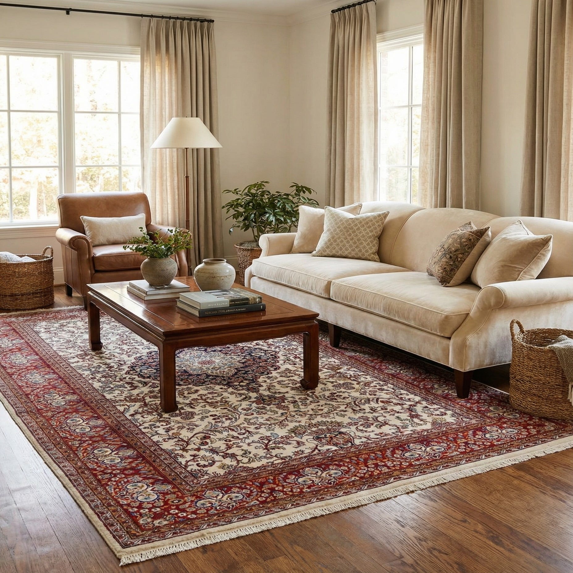 This Persian-inspired piece works well in formal and transitional settings alike: place it under a dining table to anchor the room, beneath a seating group to define a living area, or in a study to add texture and warmth. It pairs beautifully with warm wood furniture and leather, and also complements neutral upholstery or navy accents for a more coordinated look.