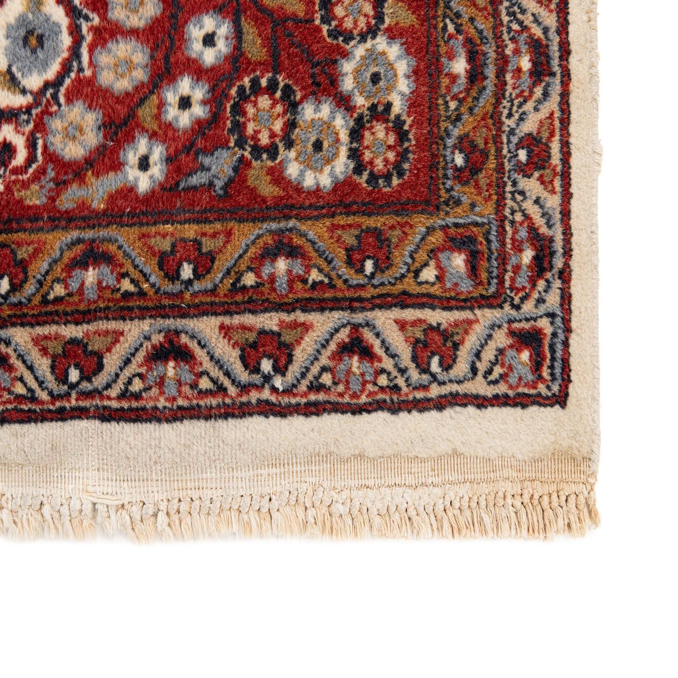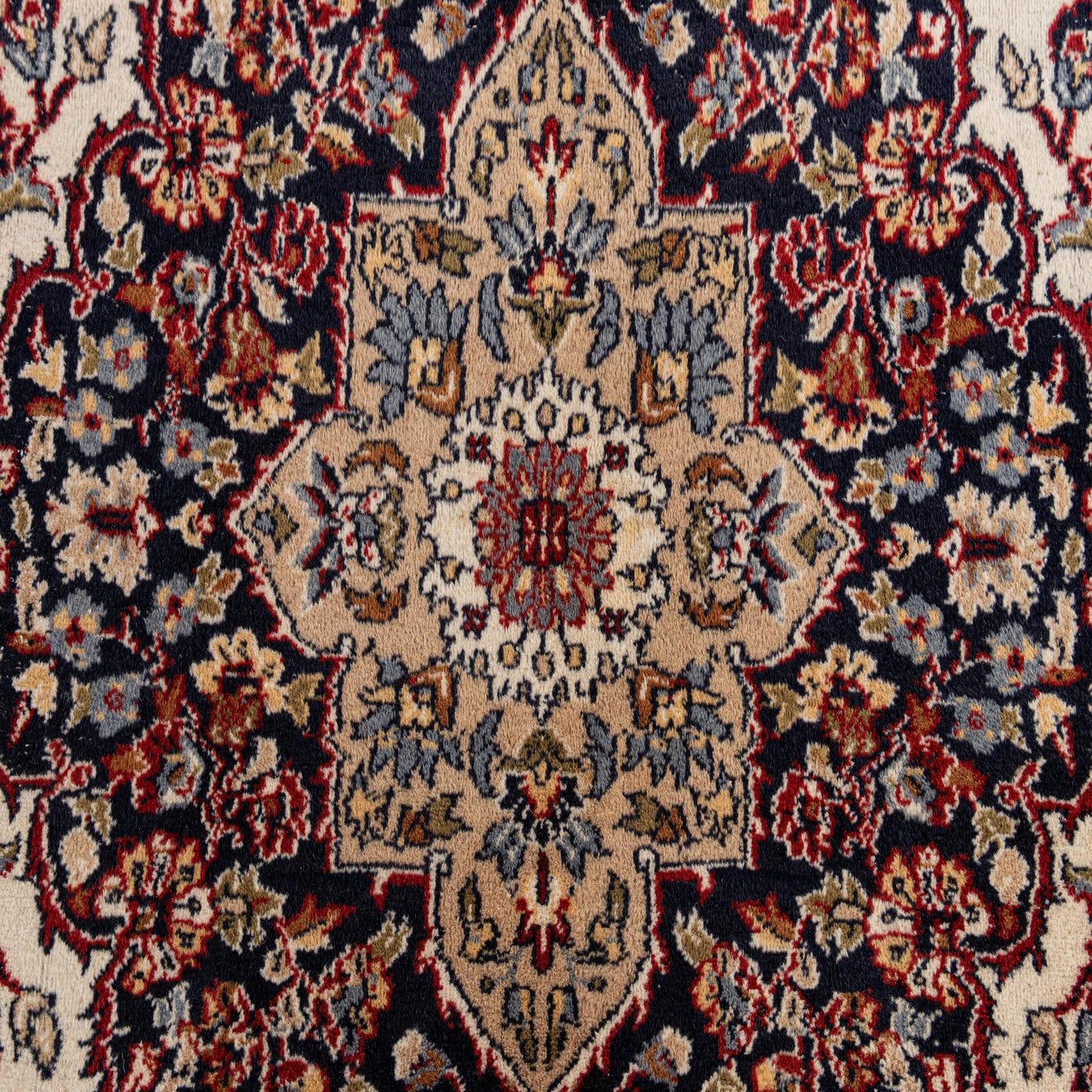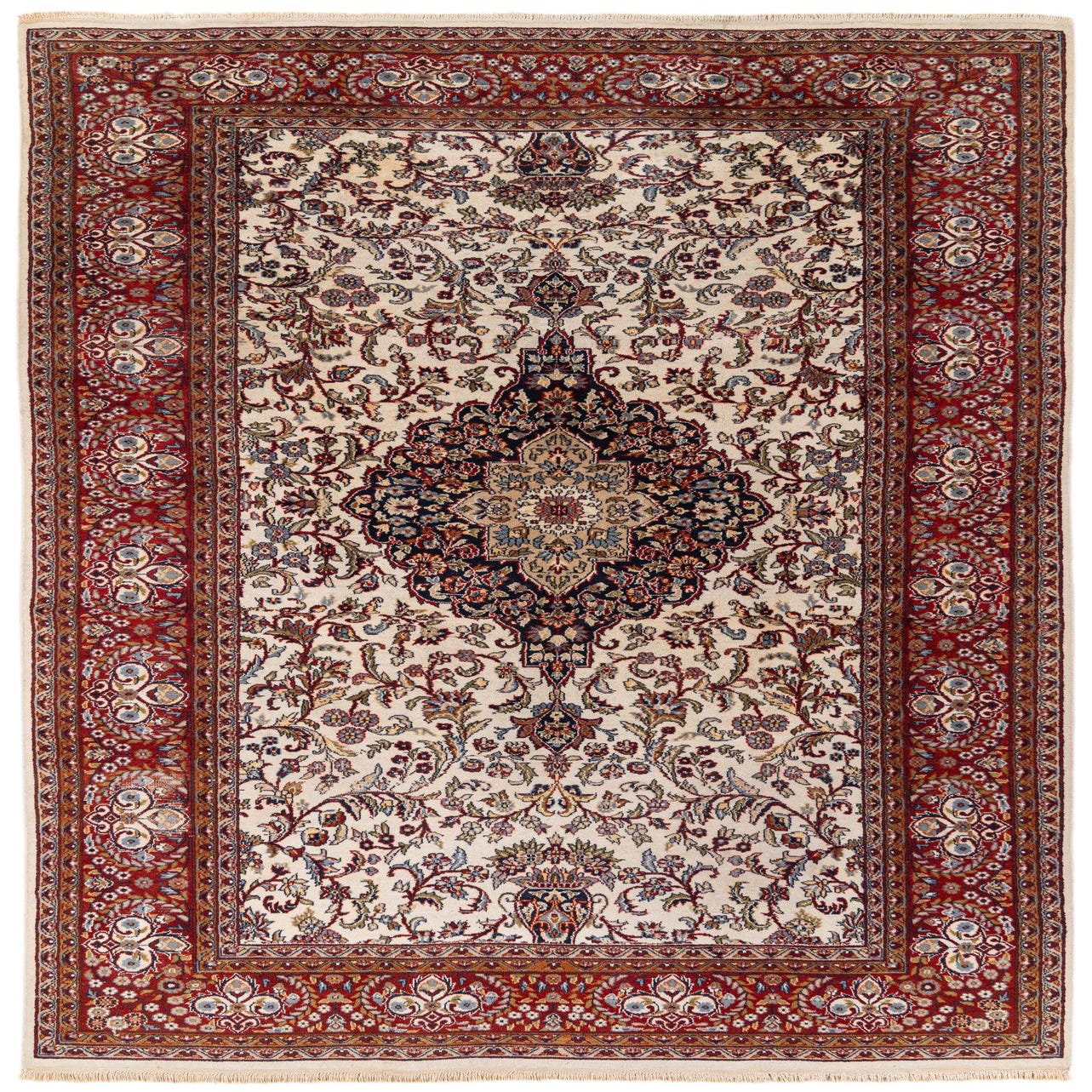 Ivory provides a luminous ground for a finely detailed central medallion in navy and black, surrounded by scrolling floral vines in shades of red, brown, beige, green and light blue. A rich red border of repeating palmettes and floral motifs frames the field, while small navy and light-blue accents bring depth to the overall palette. Hand-knotted of 100% wool, the rug has a dense, natural-wool pile that feels soft underfoot and holds crisp knot definition so the ornate pattern remains distinct.