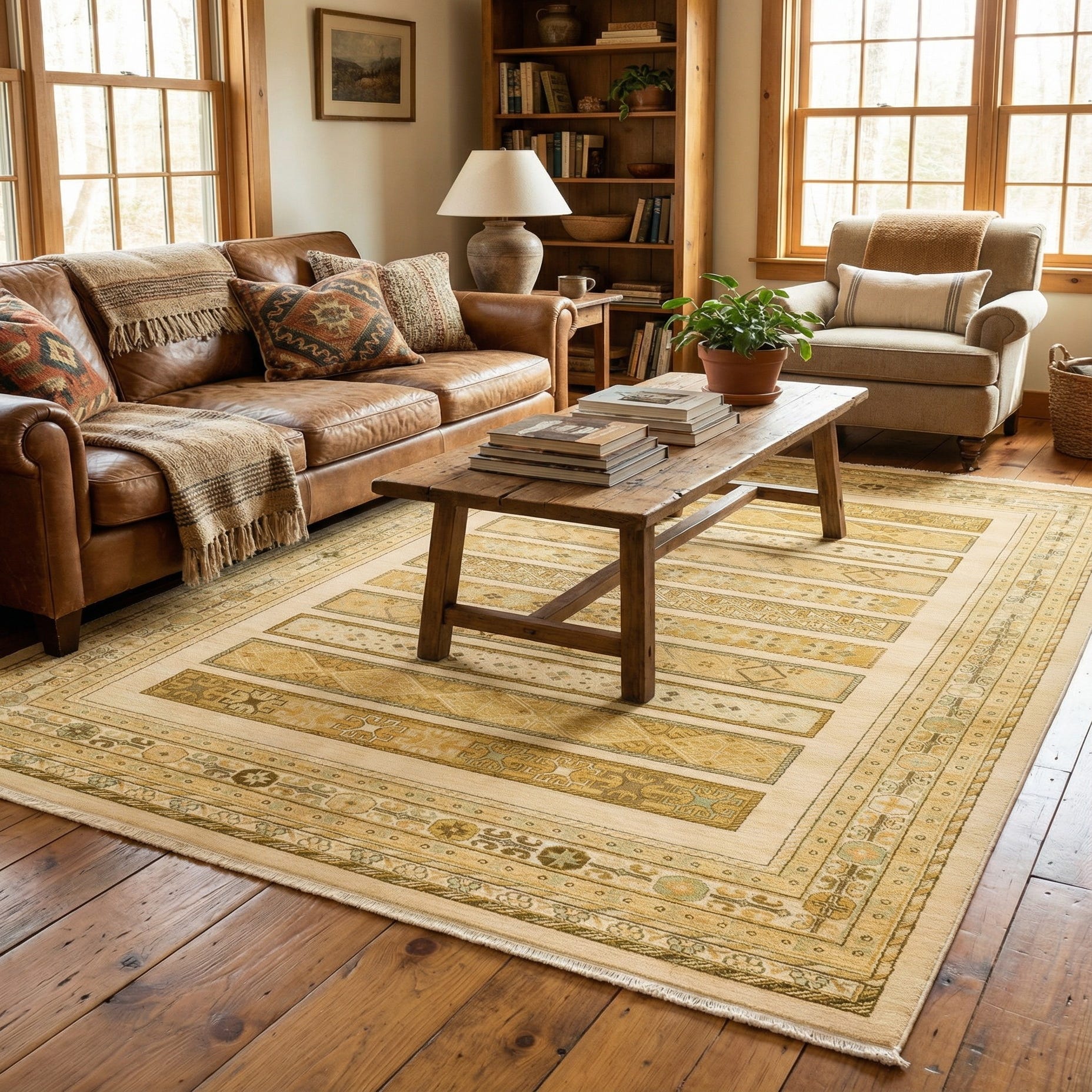 This piece fits well in living rooms and dining areas where a light, neutral anchor is needed—place it beneath a sofa and coffee table to open the space, or under a dining table to define the eat-in area. It complements warm wood furniture, leather seating and linen upholstery, and picks up nicely with muted green accents or natural-fiber accessories for a cohesive, lived-in vibe suitable for transitional, farmhouse, or modern-traditional interiors.