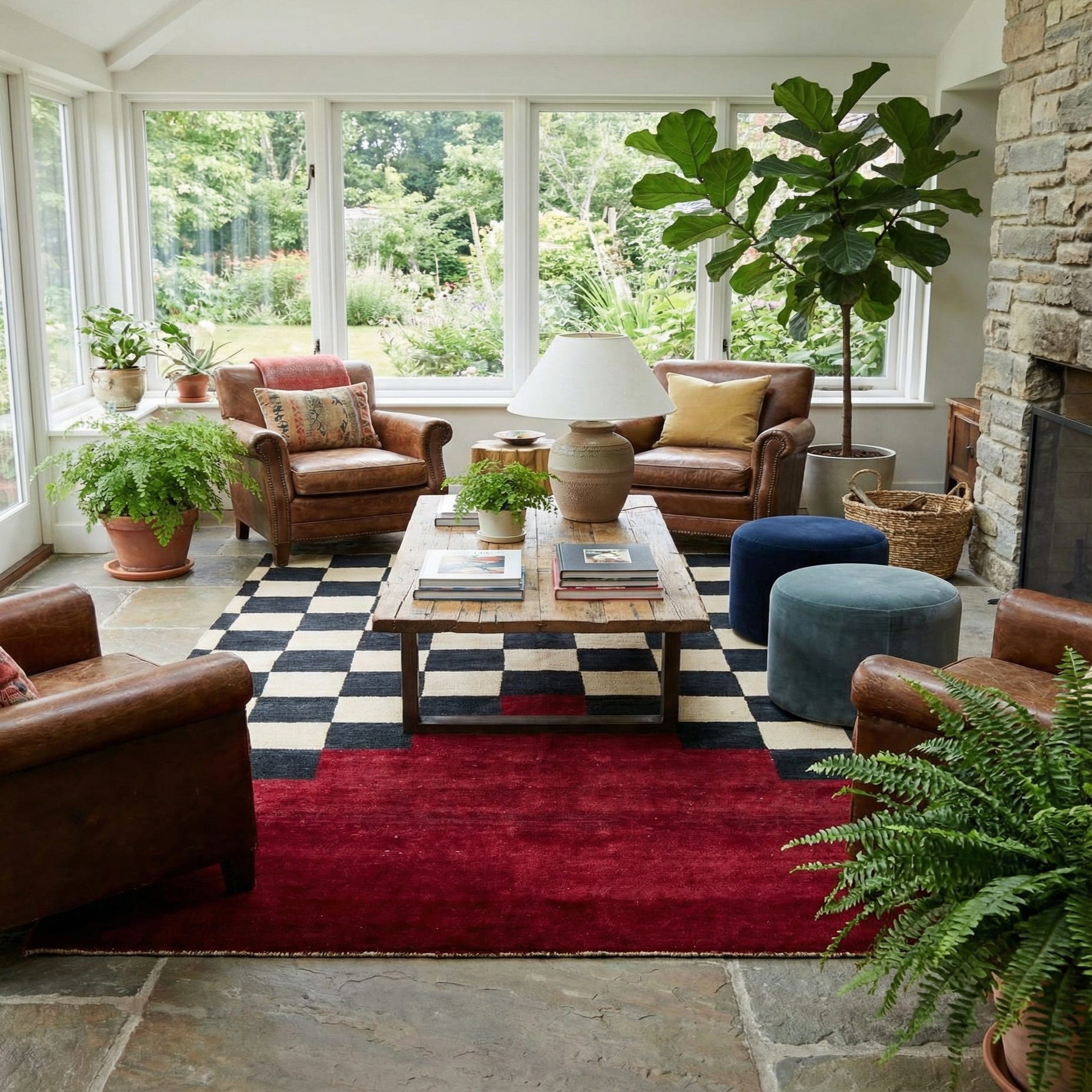 The Kashkuli Gabbeh rug presents a bold checkered pattern, combining deep black and ivory squares that make a graphic statement on the floor. The rug's design is elegantly offset by a solid burgundy section at one end, providing a sophisticated contrast that draws the eye. Hand-knotted from 100% wool, this 7x10 rug boasts a luxuriously soft texture and a robust construction that ensures durability without compromising on style.