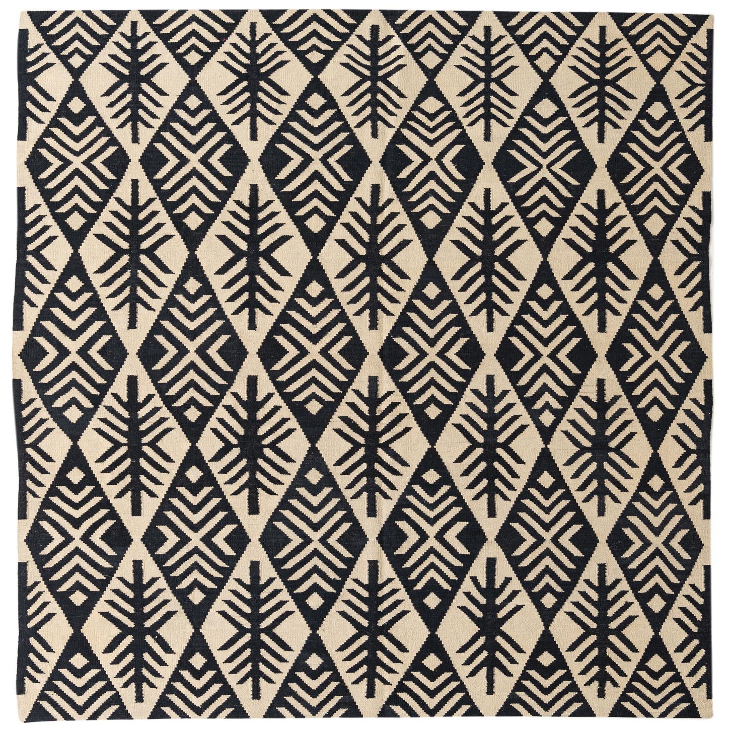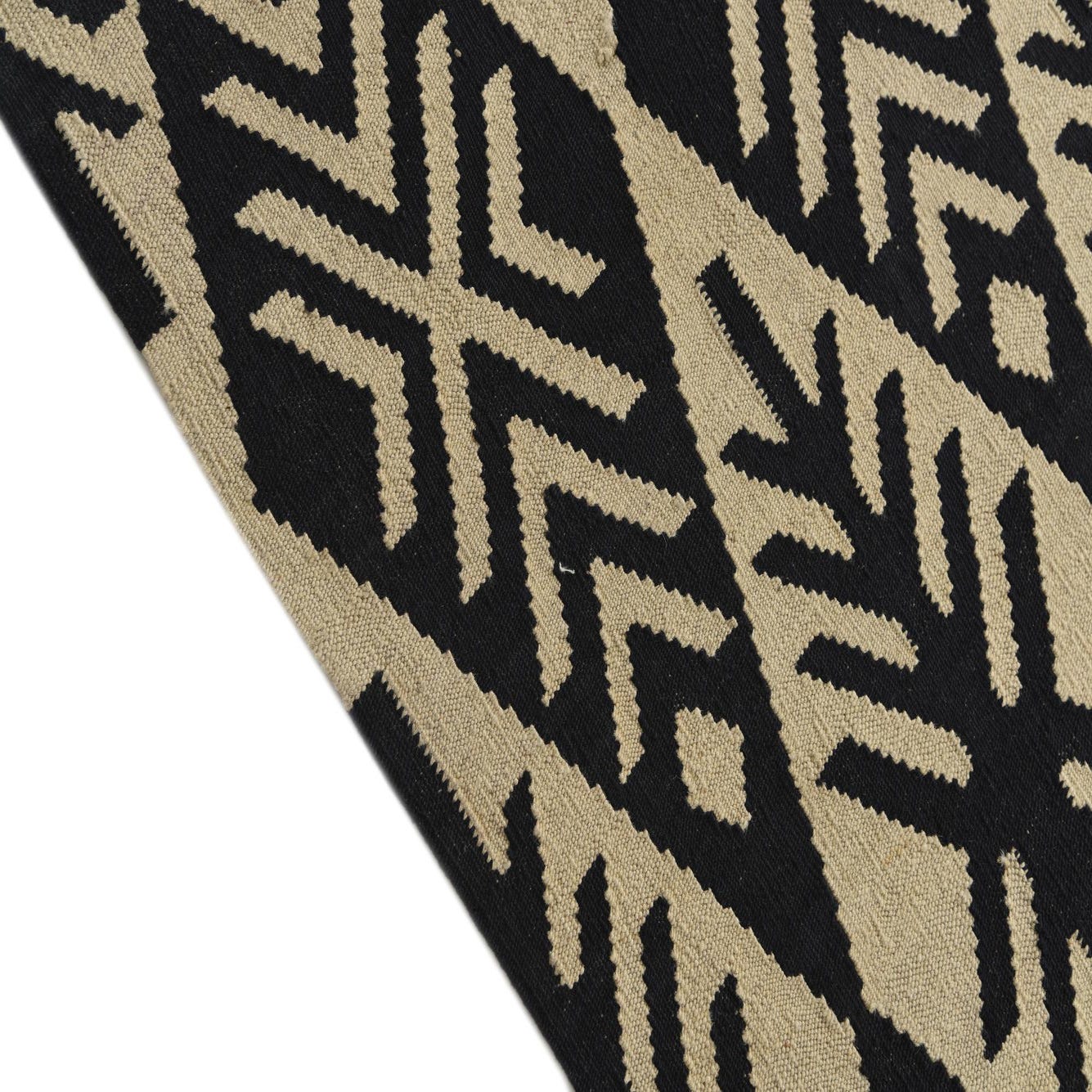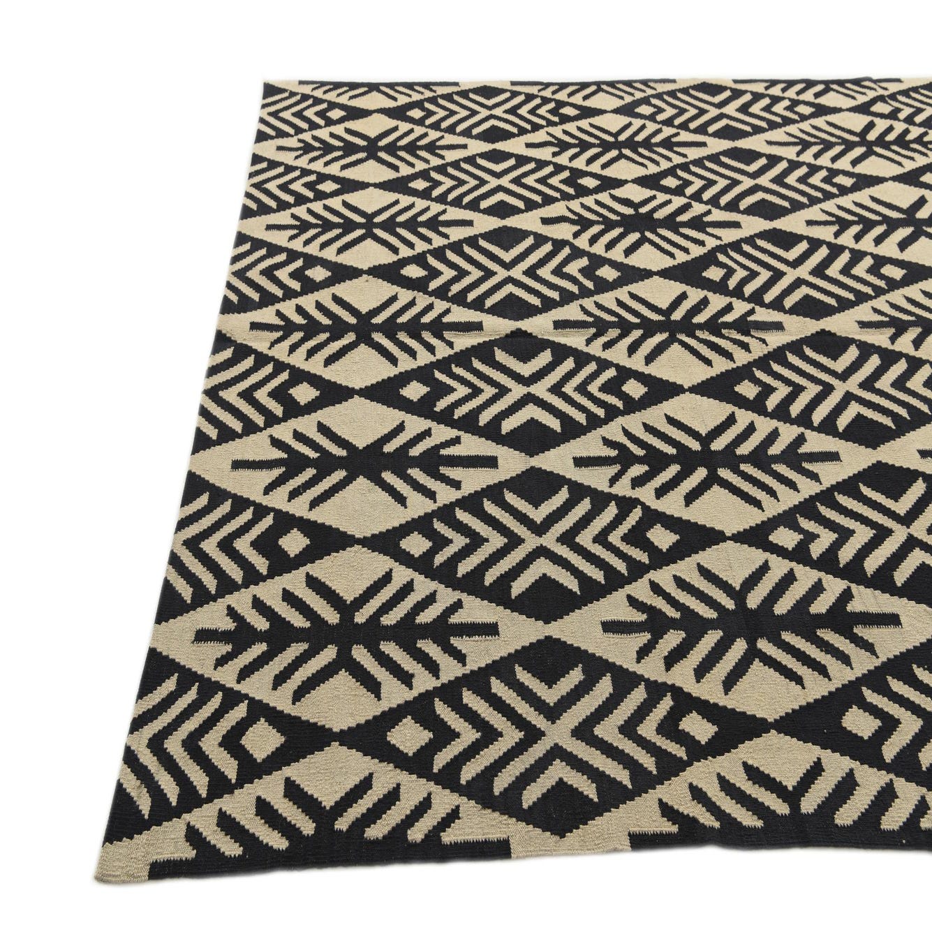 A 7x10 rectangular flatweave rug with a tribal geometric pattern in black and ivory, suitable for a living room.
