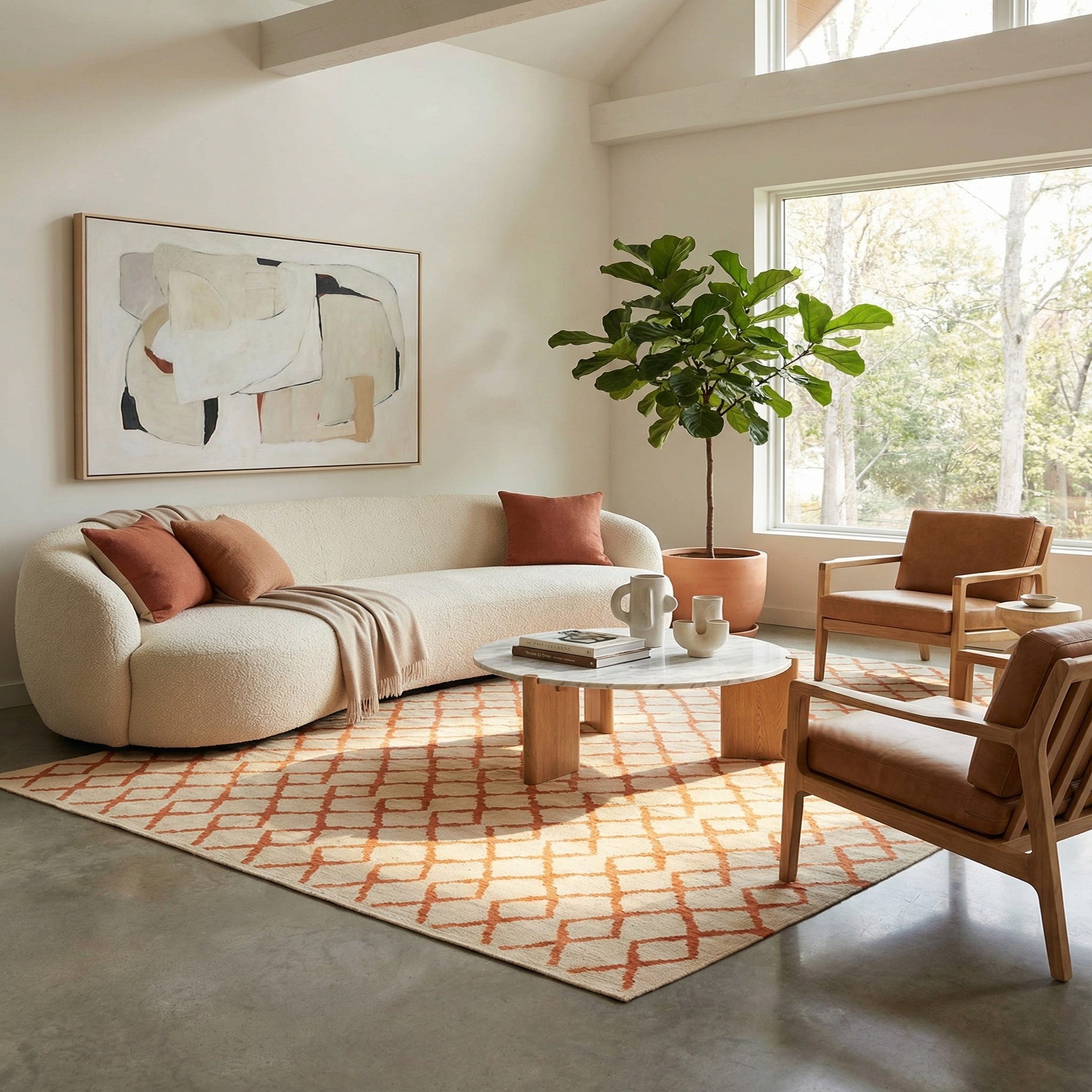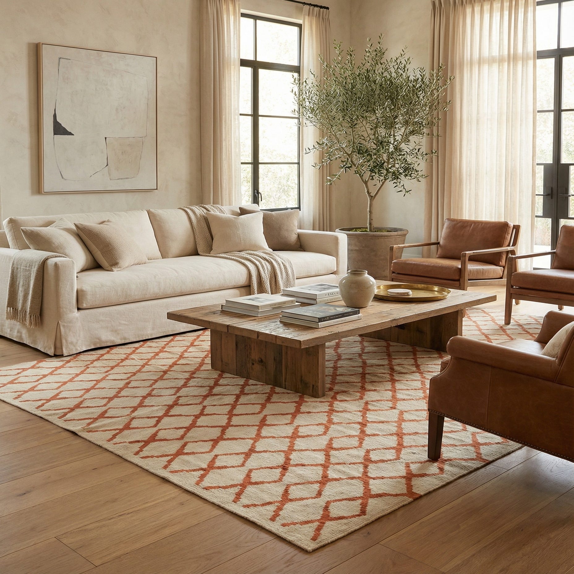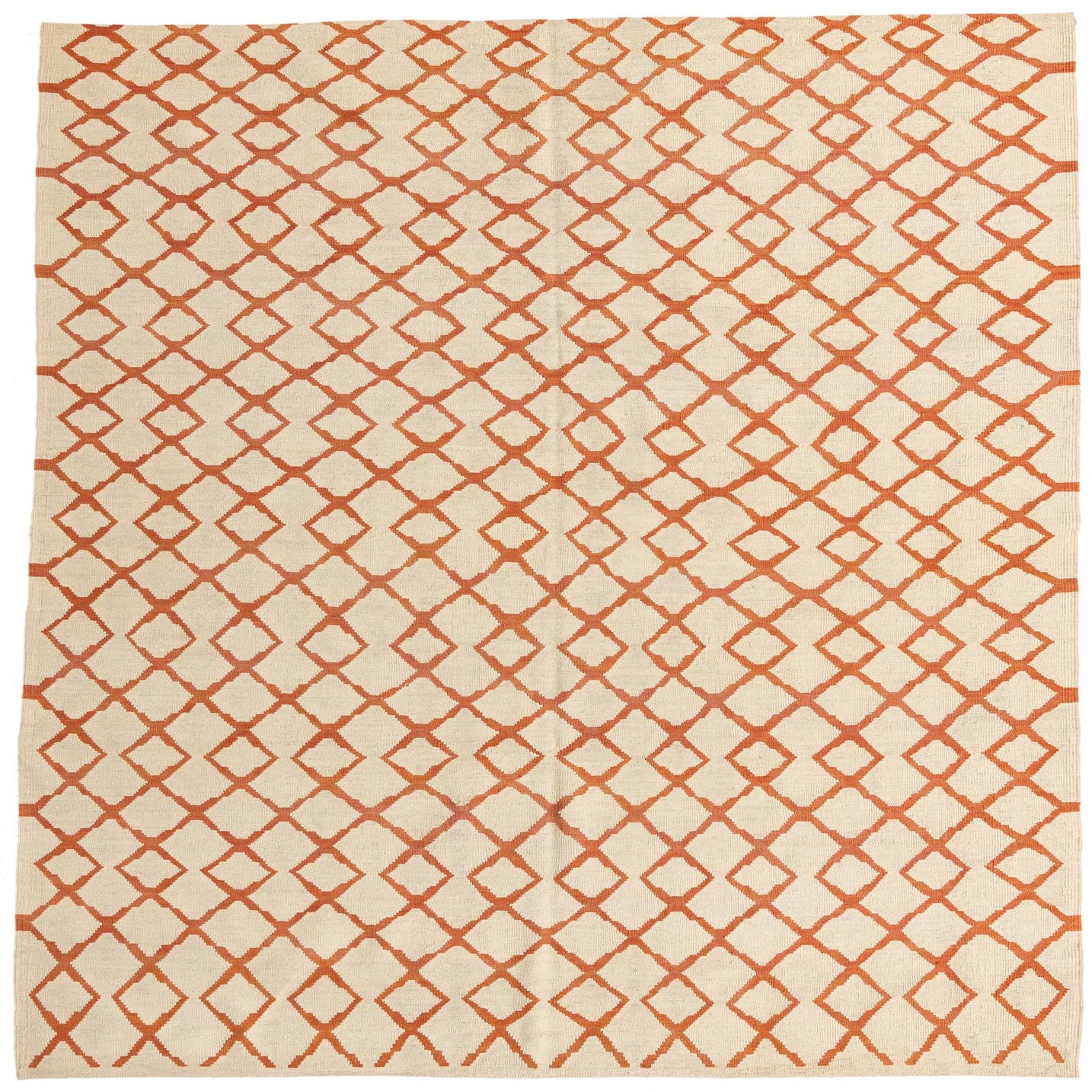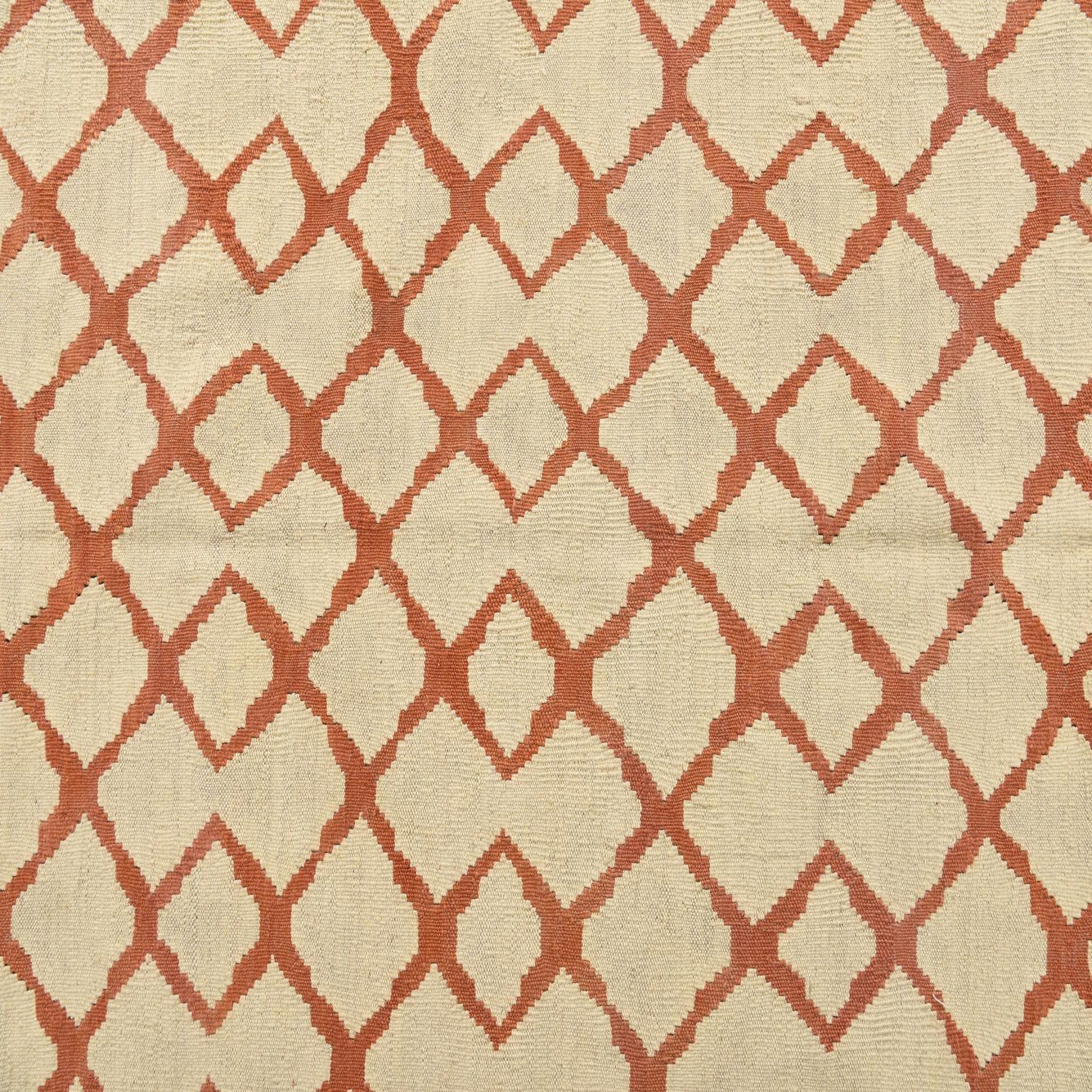 Hand woven of 100% wool, this flat-woven rug pairs a warm orange lattice with an ivory ground for a clean, geometric look. The repeating diamond motif is evenly spaced and hand-worked, giving the surface a slightly nubby, textured feel that invites bare feet. The low-profile weave lies flat underfoot while the natural wool offers a soft, slightly springy hand and a matte finish that keeps the pattern feeling grounded rather than glossy.