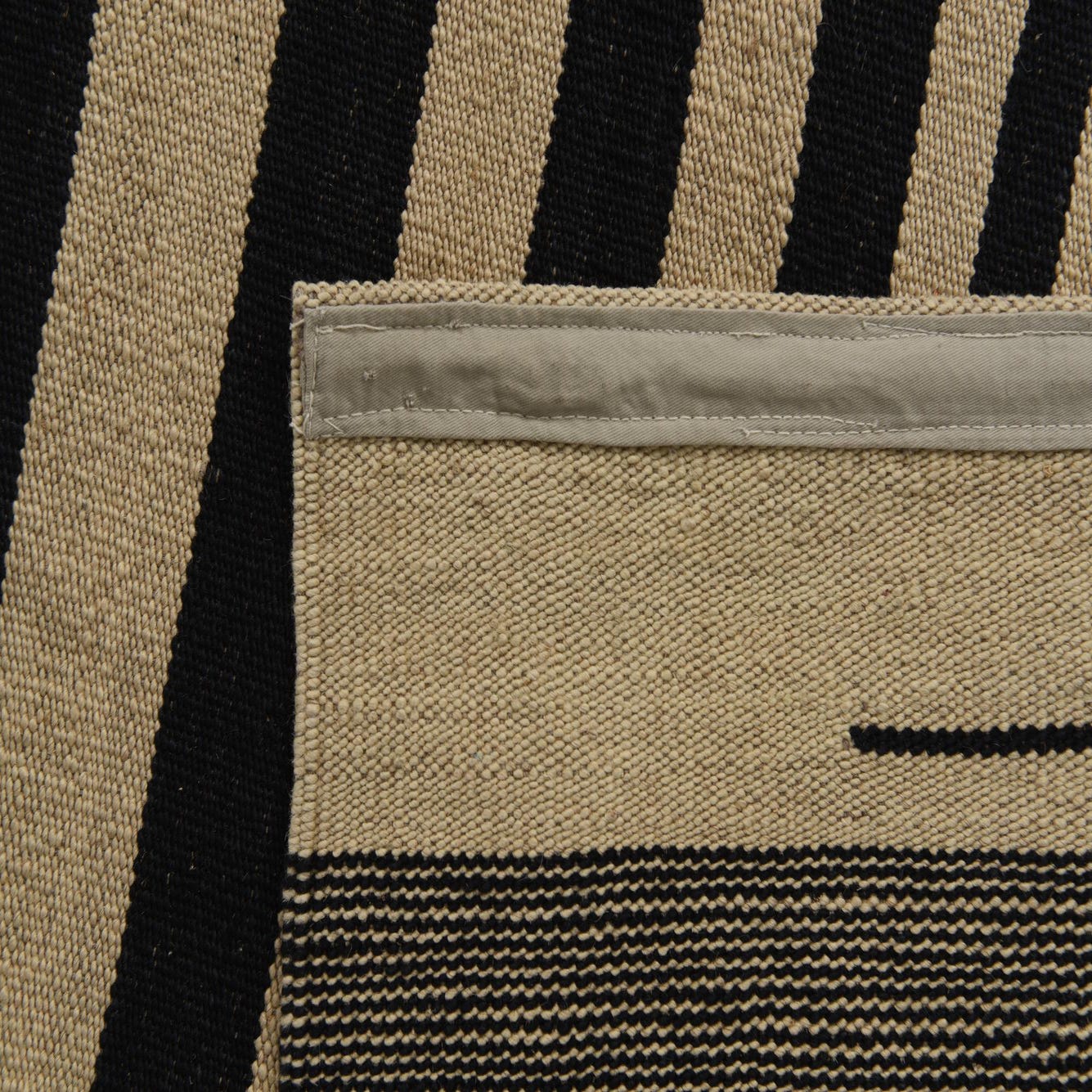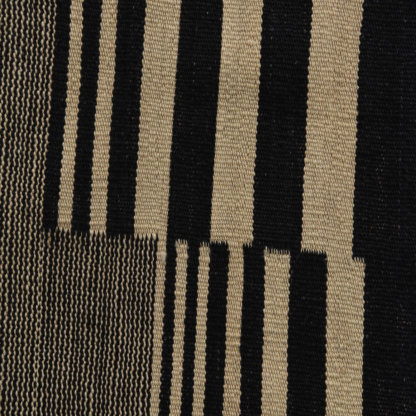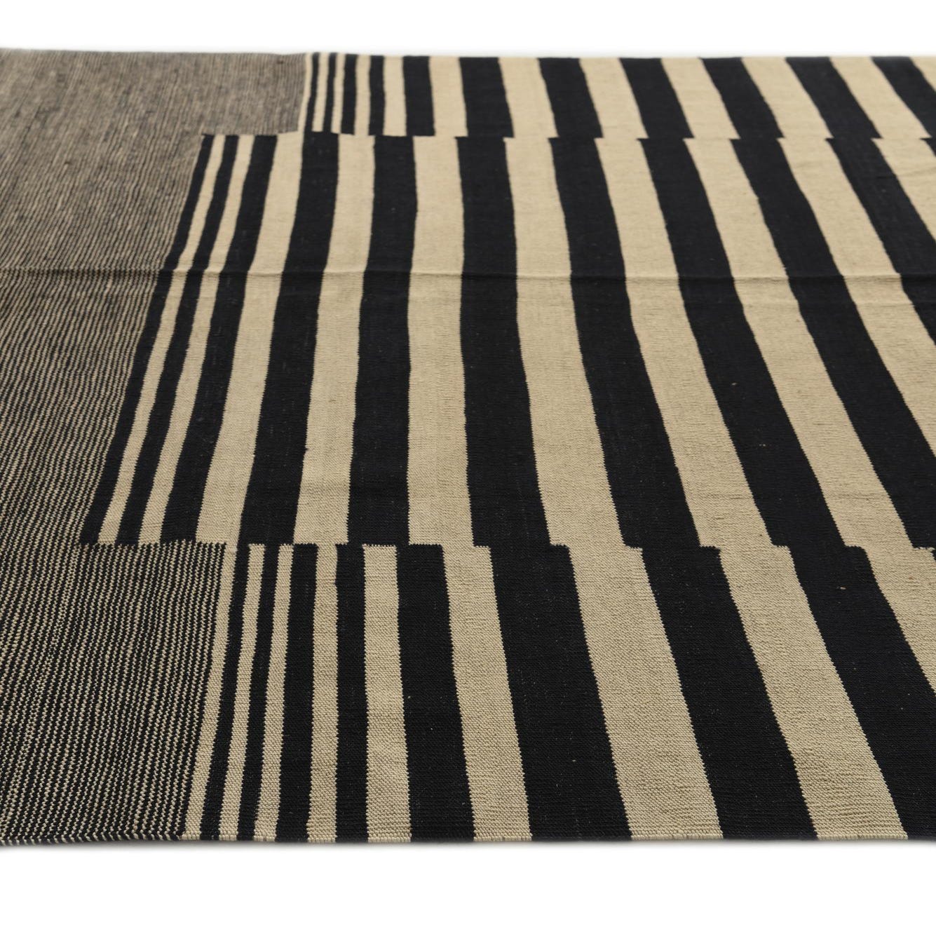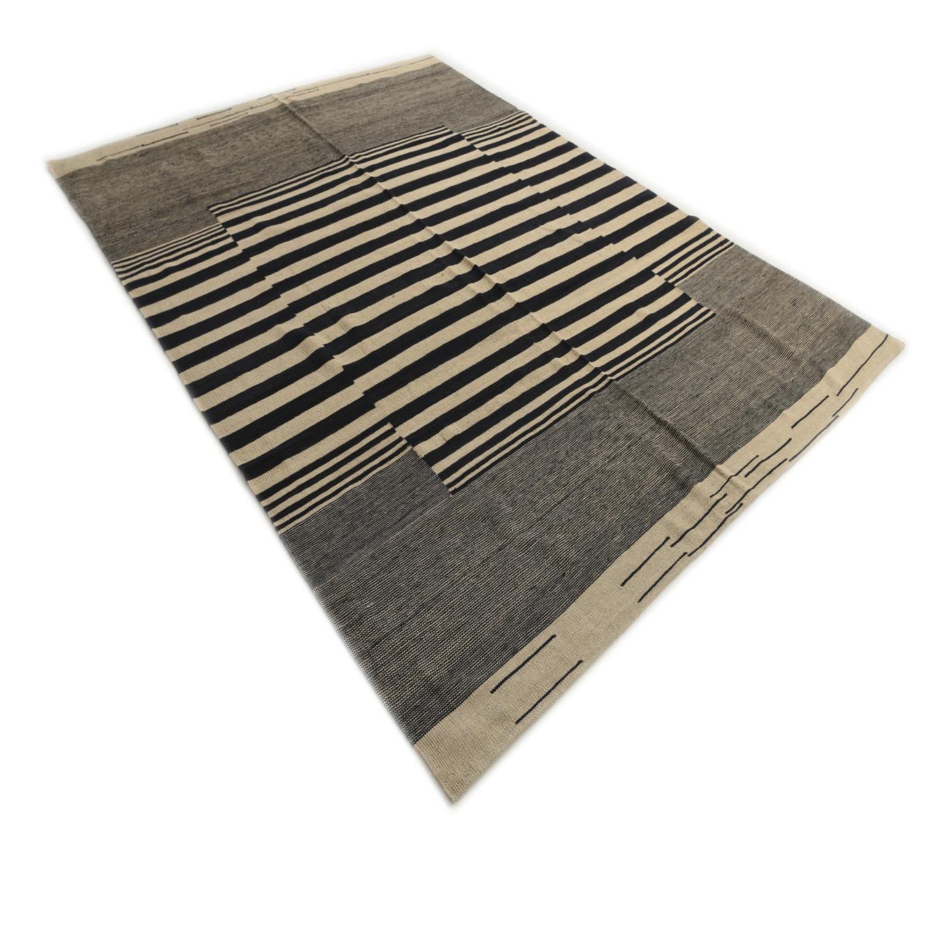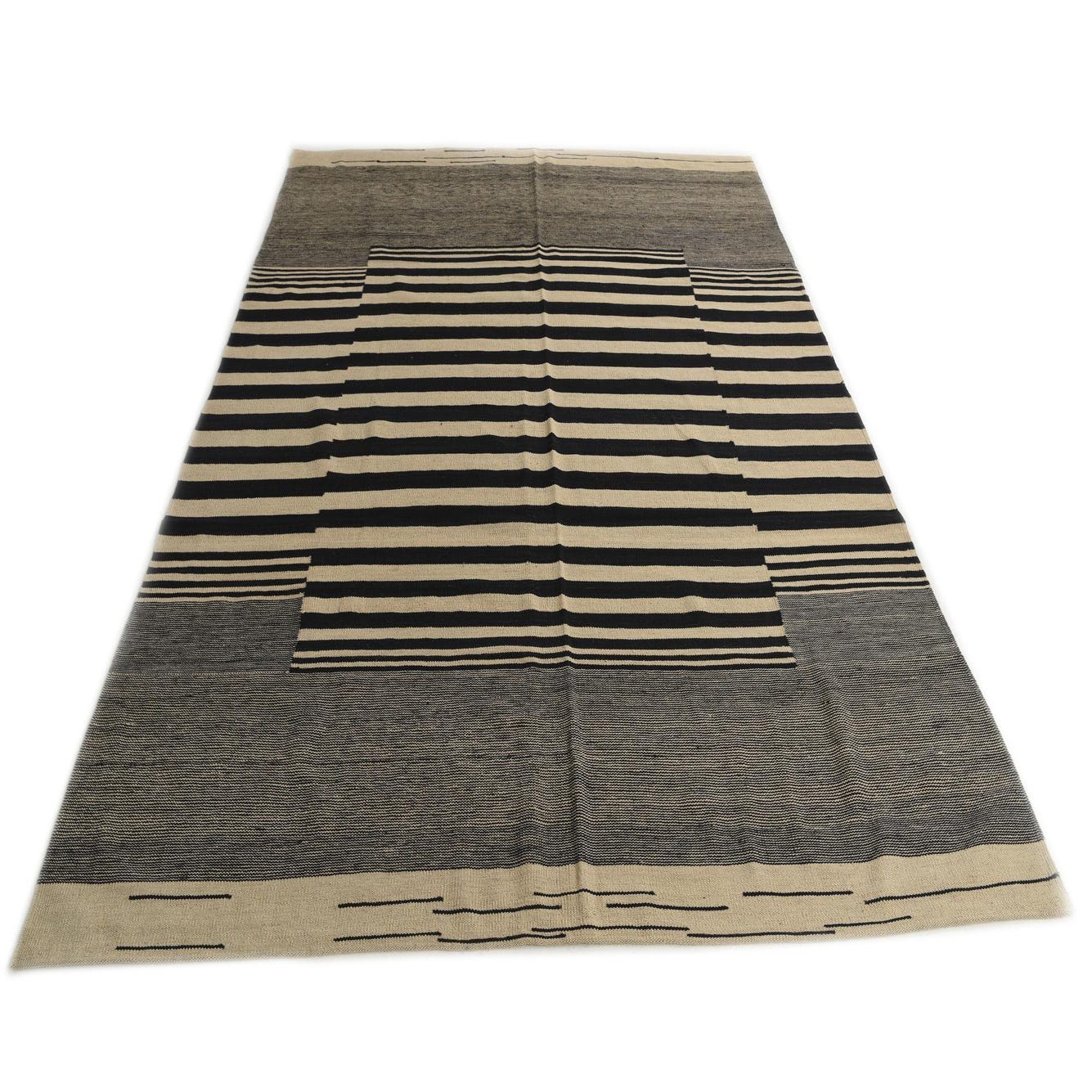The Kilim Modern collection features a hand-woven rug made of 100% wool, offering both durability and tactile pleasure underfoot. This particular 7x10 rug presents a striking contrast with its ivory and black color palette, making it a bold statement piece for any room. The design exhibits a geometric pattern with a distinct central block of black stripes on an ivory background, flanked by softer bands of varying widths that create a rhythmic and contemporary feel.