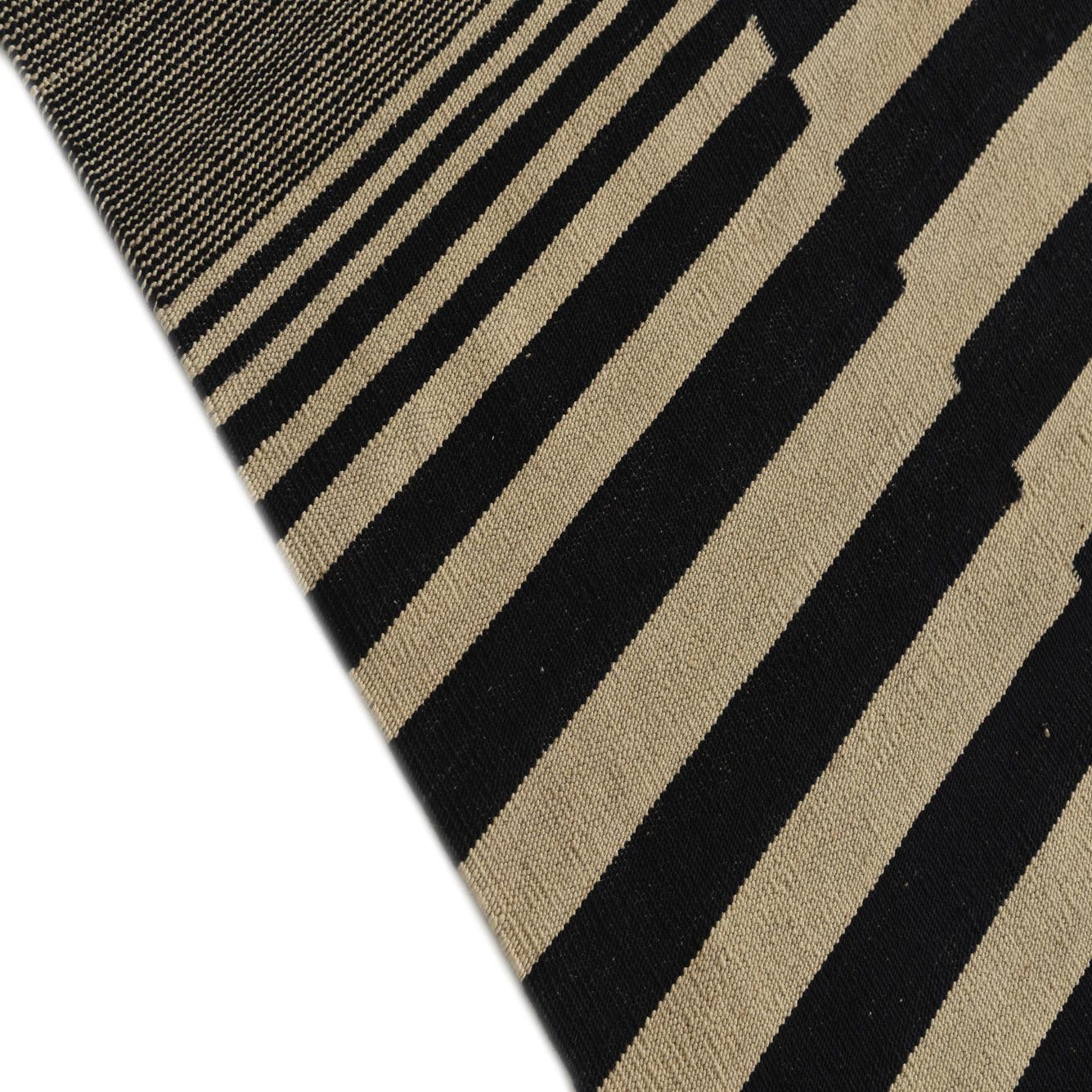 A 7x10 rectangular ivory and black flatweave rug with a modern tribal striped pattern, ideal for a living room.