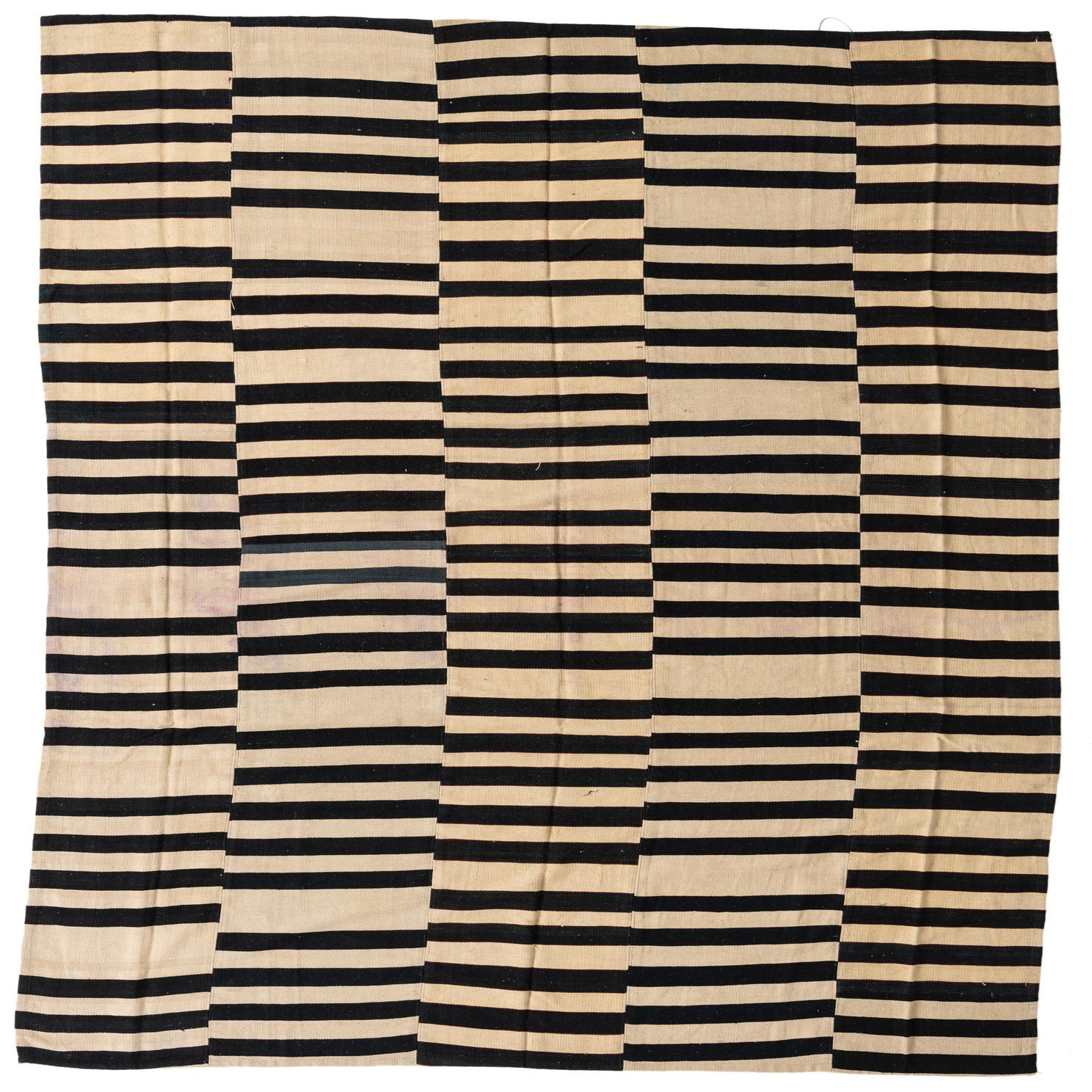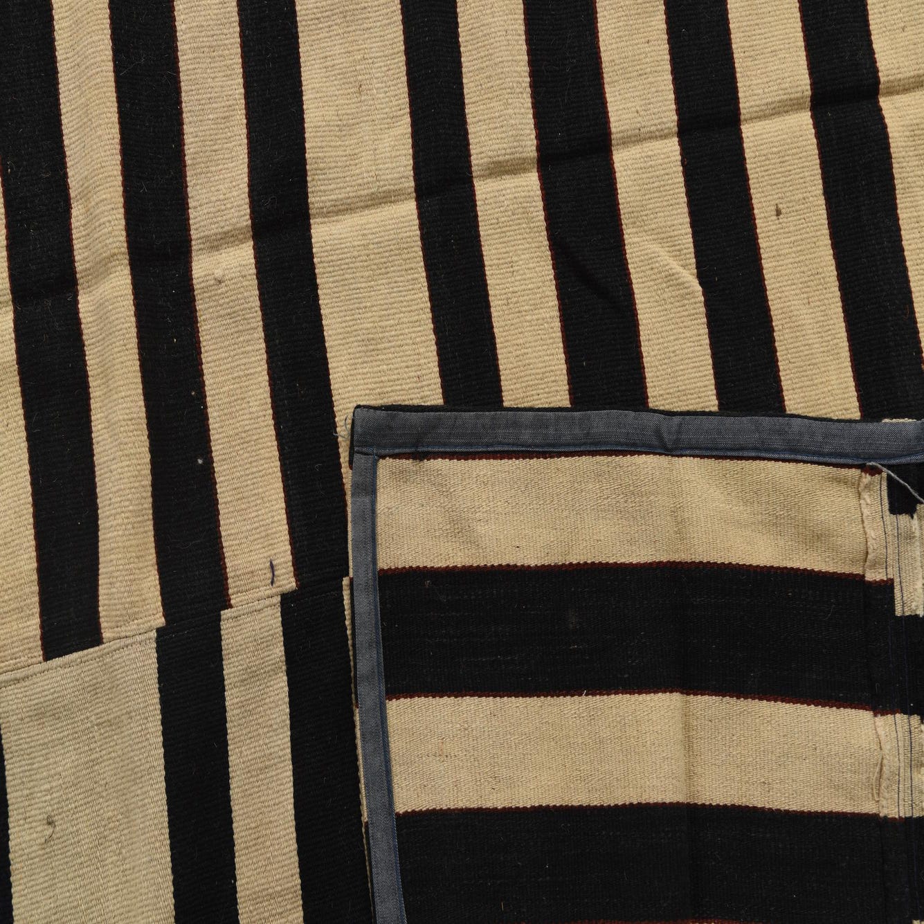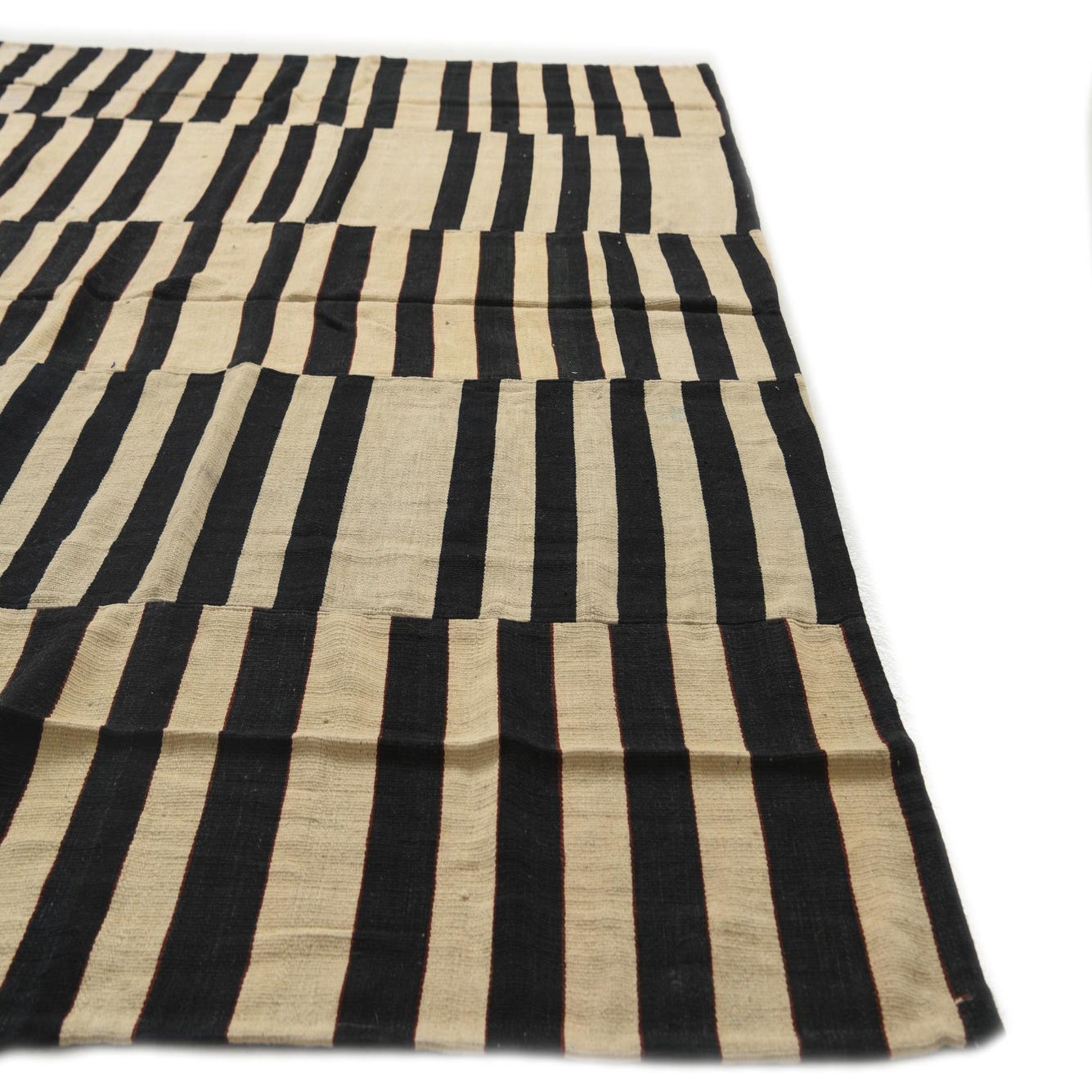 A 7x10 rectangular flatweave rug with alternating horizontal stripes of black and cream, creating a bold, modern tribal pattern.