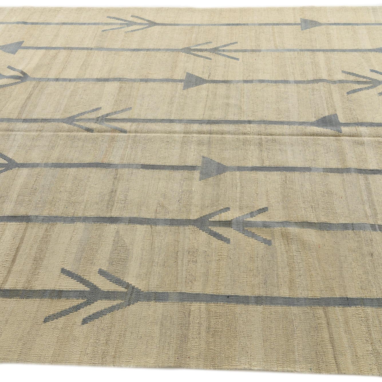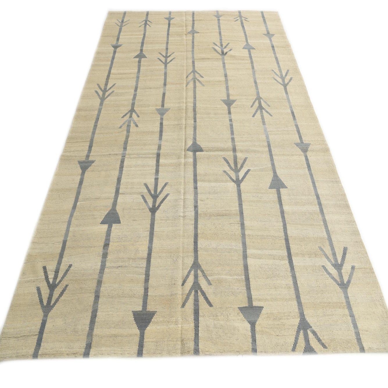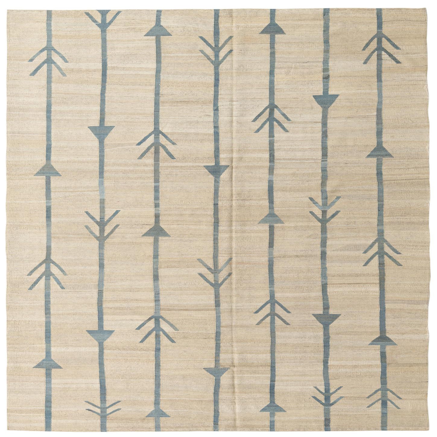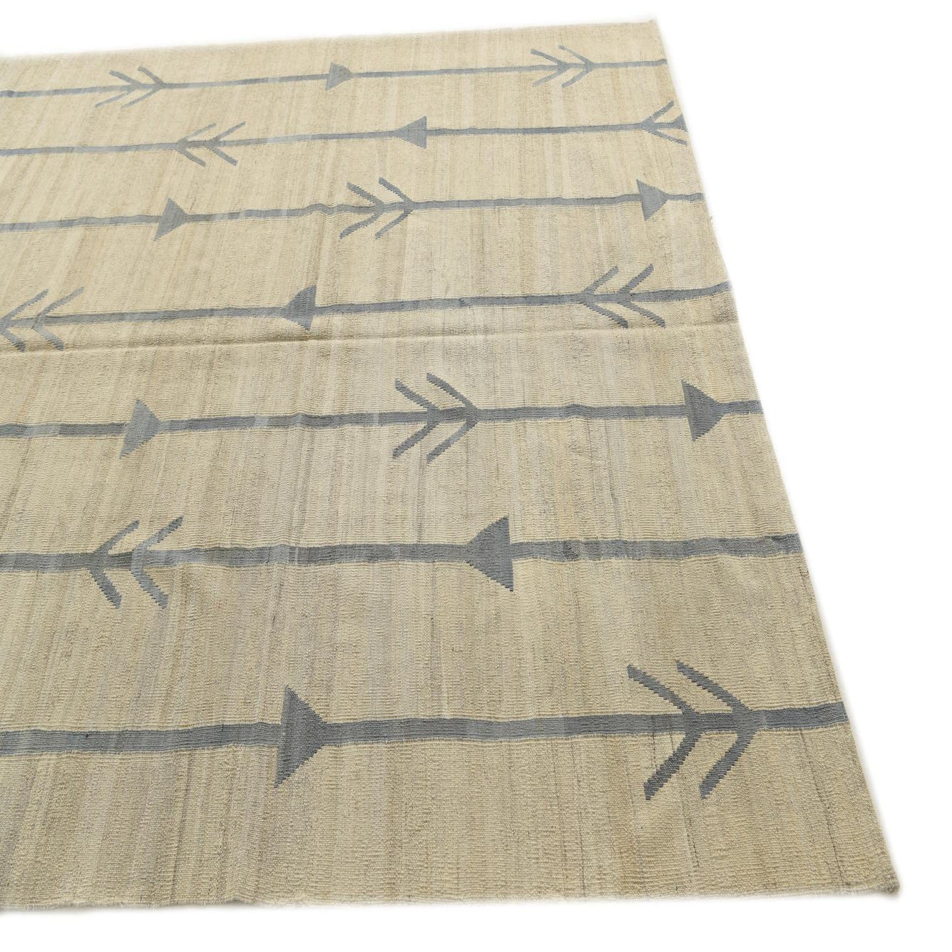 A 7x10 rectangular ivory flatweave wool rug with a modern tribal pattern of vertical blue arrow-like lines.