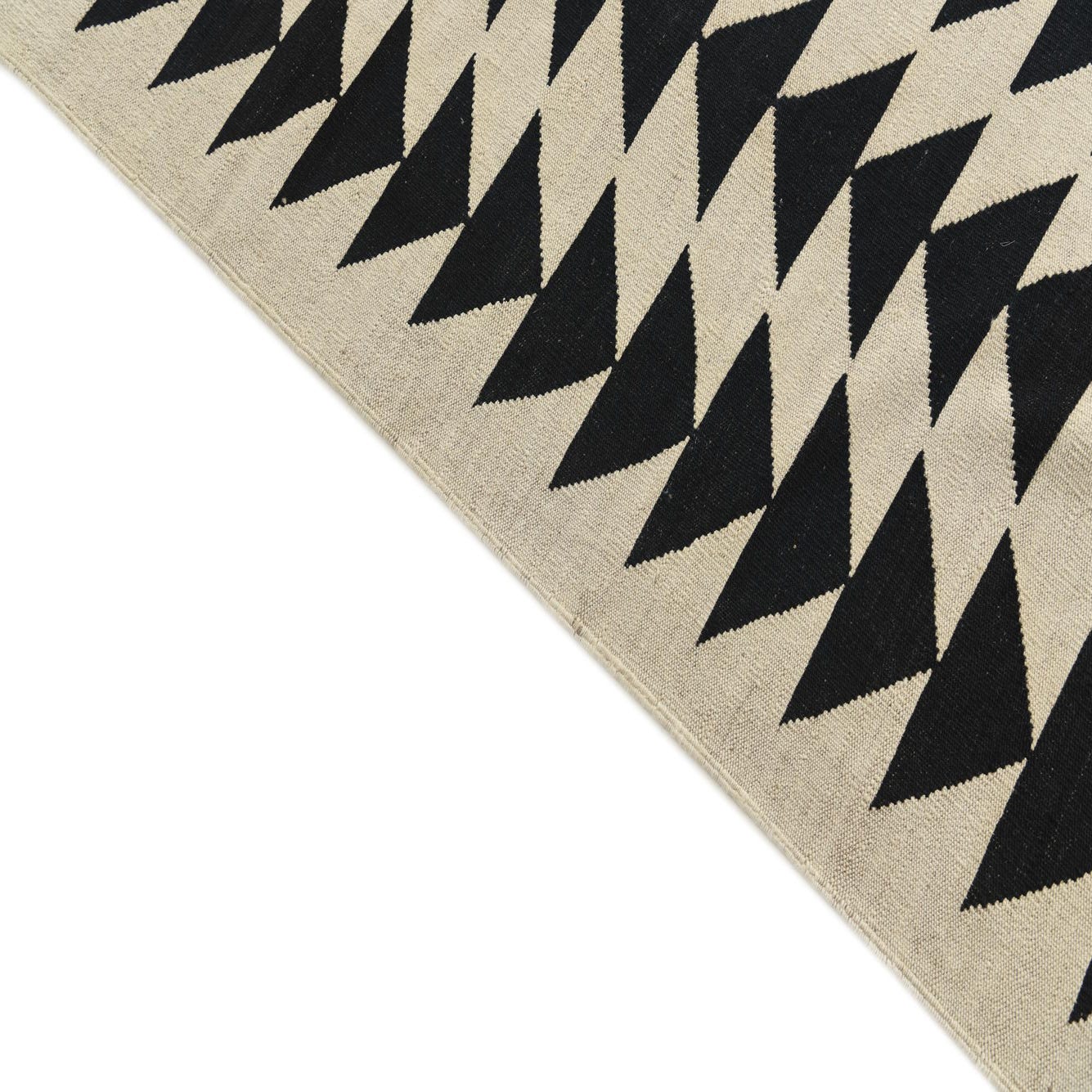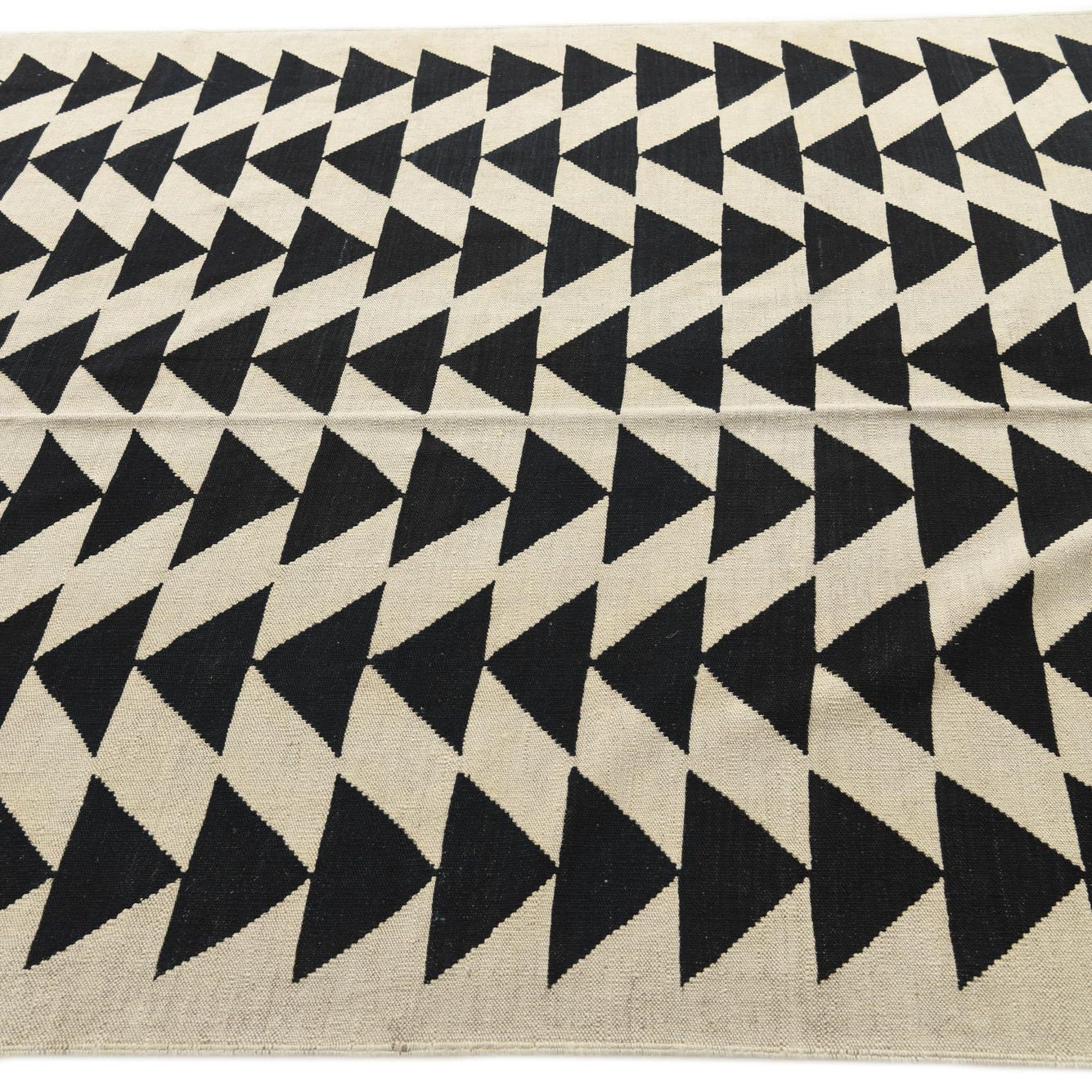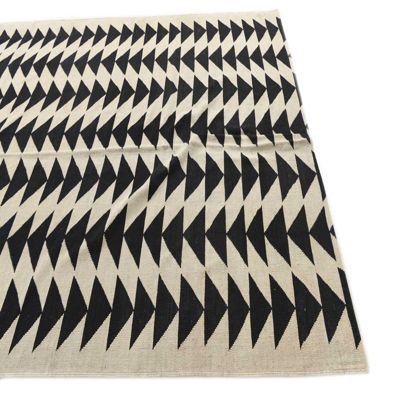 The Kilim Modern Collection presents a 7x10 hand-woven rug crafted from 100% wool, showcasing a striking contrast of ivory and black hues. The background of the rug is a soothing ivory, providing a neutral canvas that allows the bold geometric pattern of black triangles to stand out. This repeating pattern creates a visual rhythm that exudes contemporary appeal.