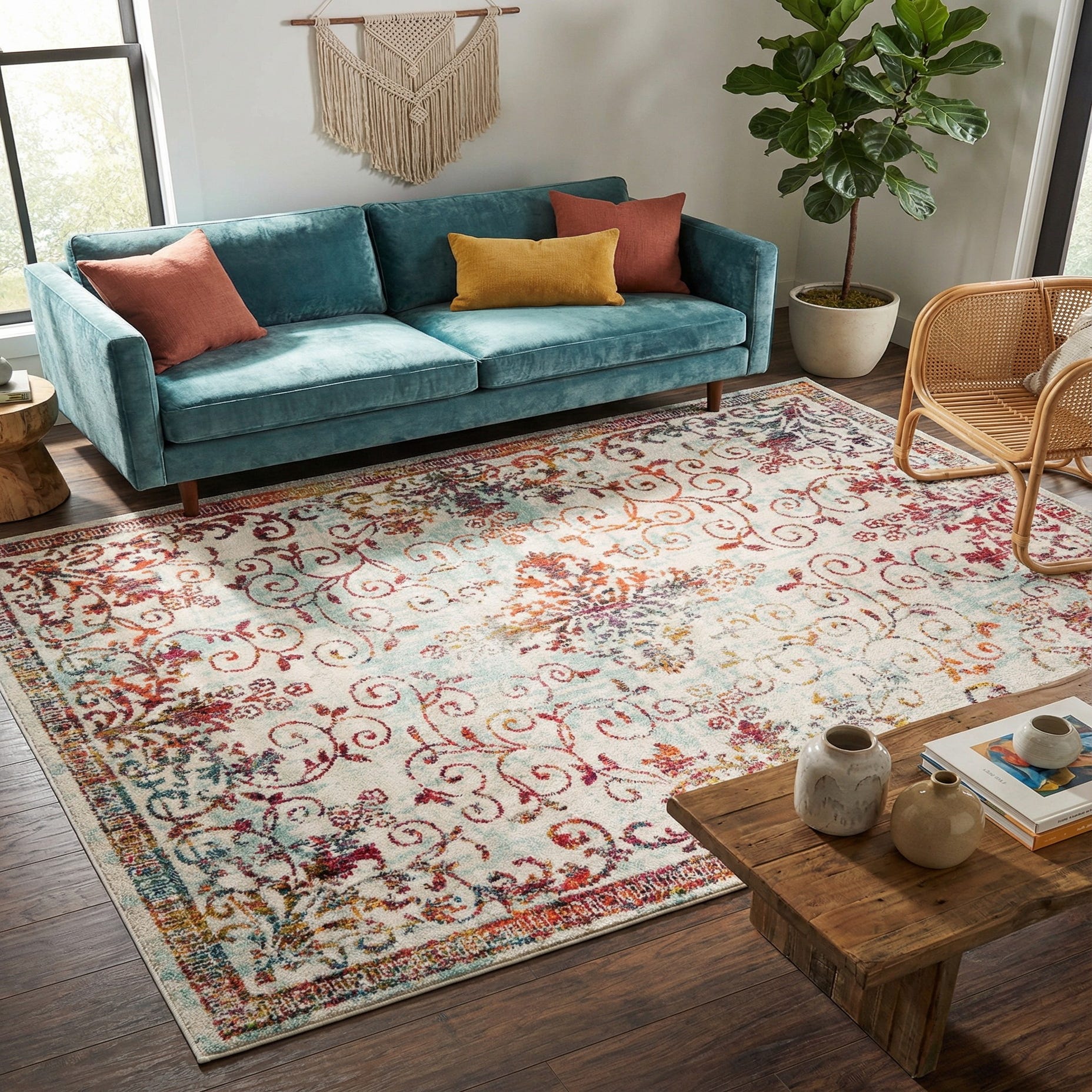 This rug pairs easily with a neutral sofa to introduce color without overwhelming a space, or with painted furniture and woven accents in coastal and cottage schemes where the light blues and ivory enhance a breezy feel. It also complements eclectic, boho interiors that mix patterns and bright hues, and works well in entryways, living rooms or bedrooms as an anchoring layer beneath a coffee table or seating group.